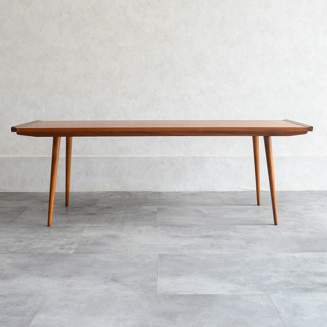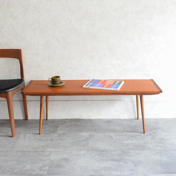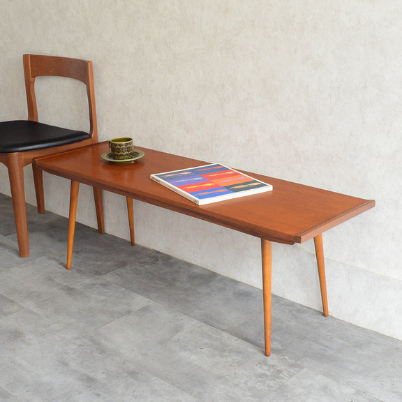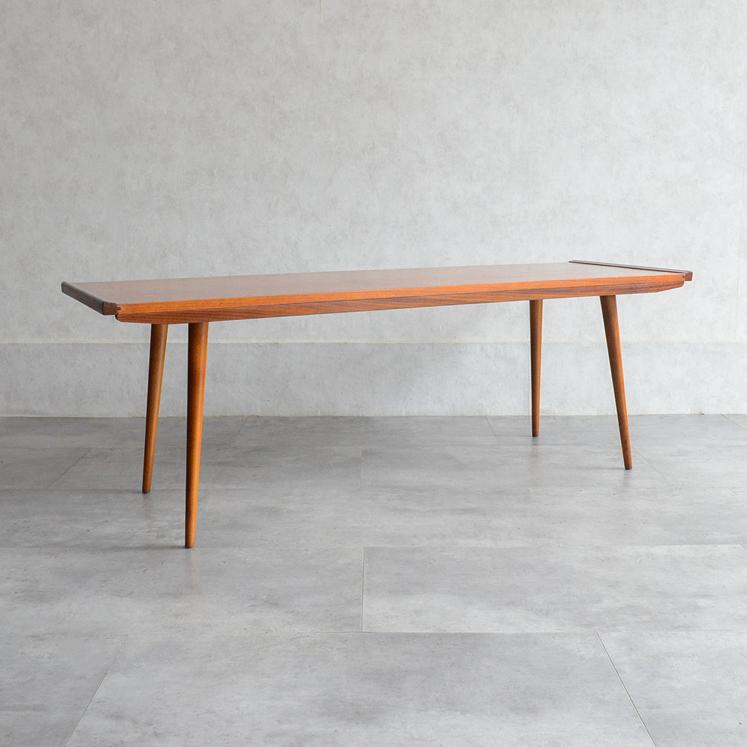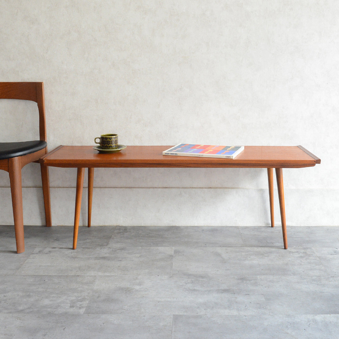 天板のチークの木目とスリムな丸脚のデザインが美しいセンターテーブル。