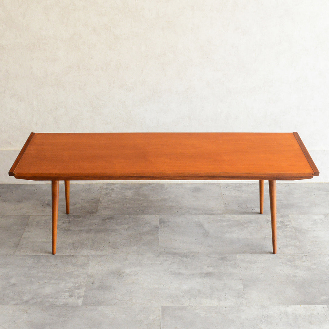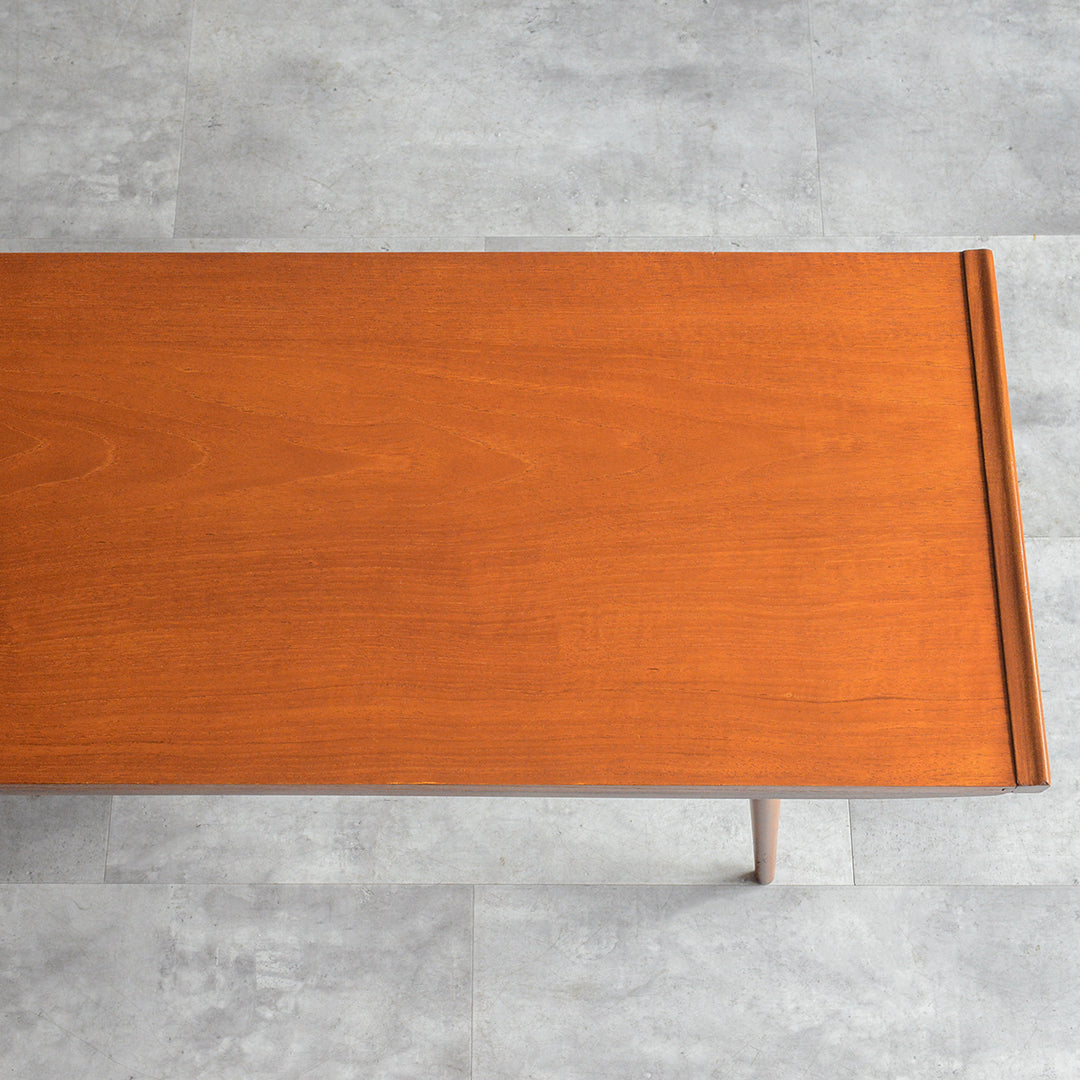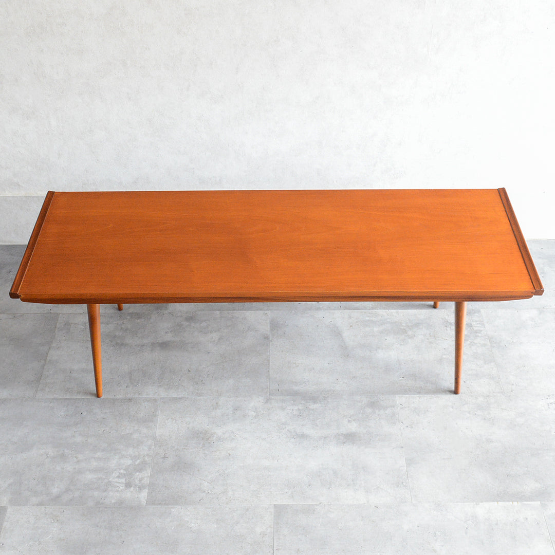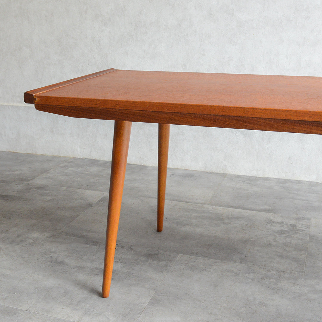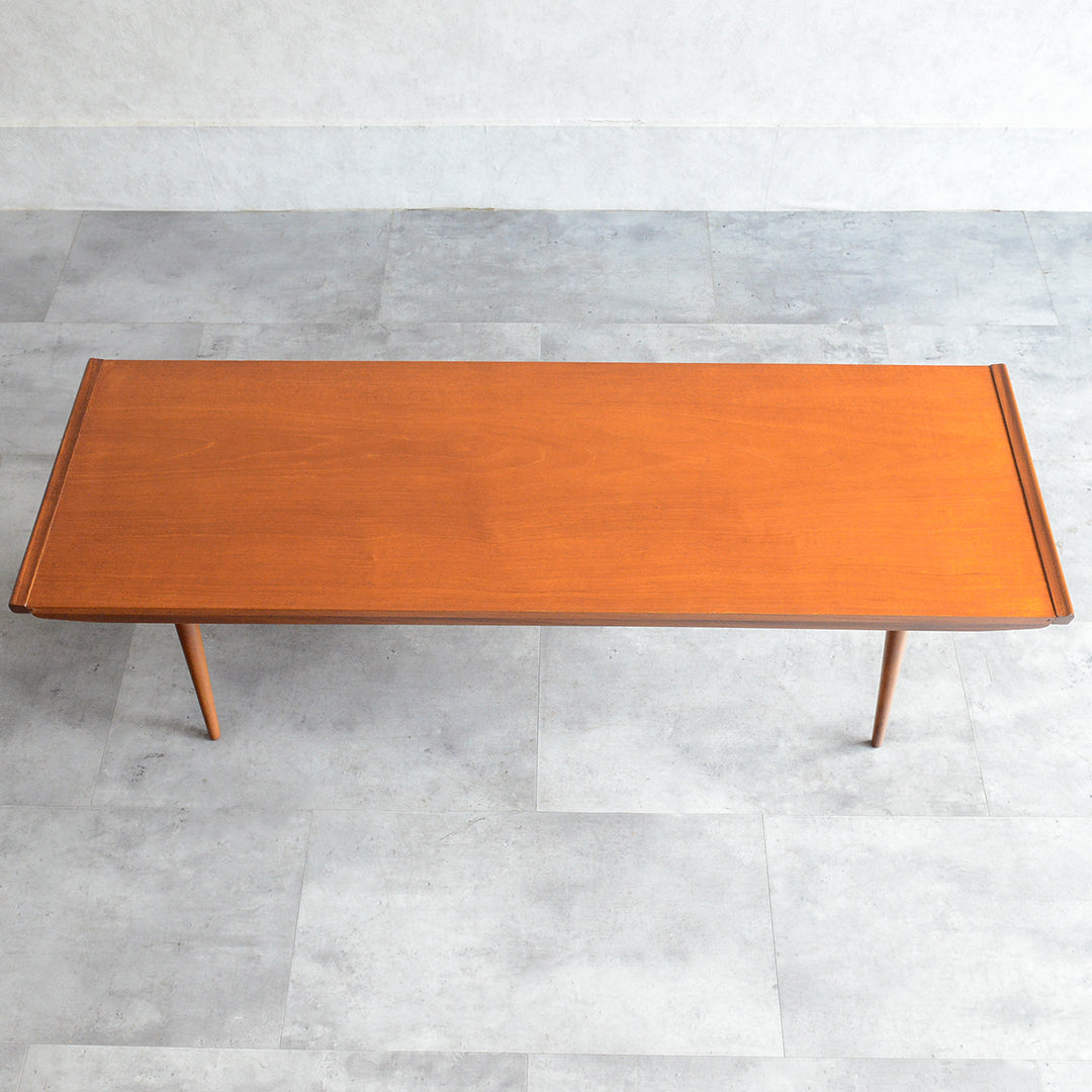 天板のチークの木目とスリムな丸脚のデザインが美しいセンターテーブル。