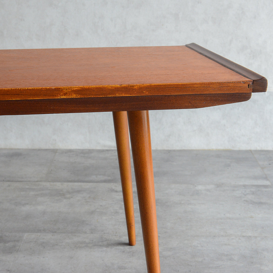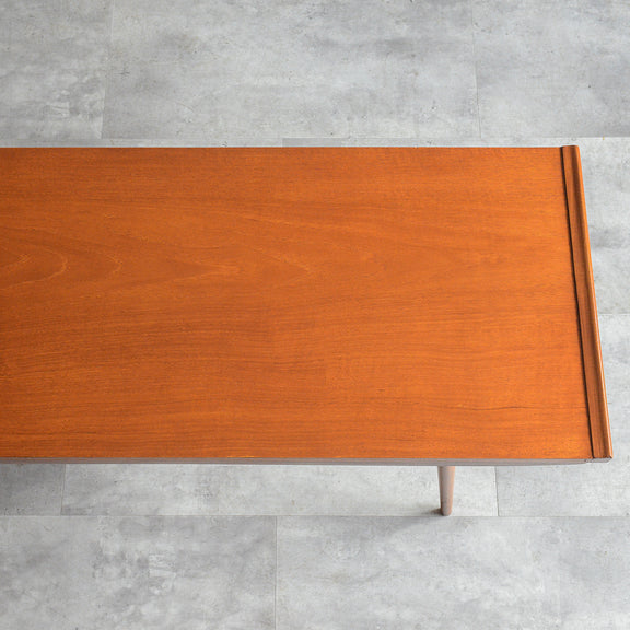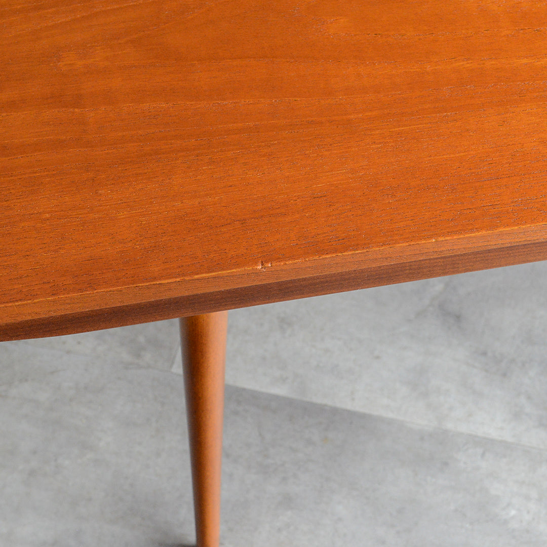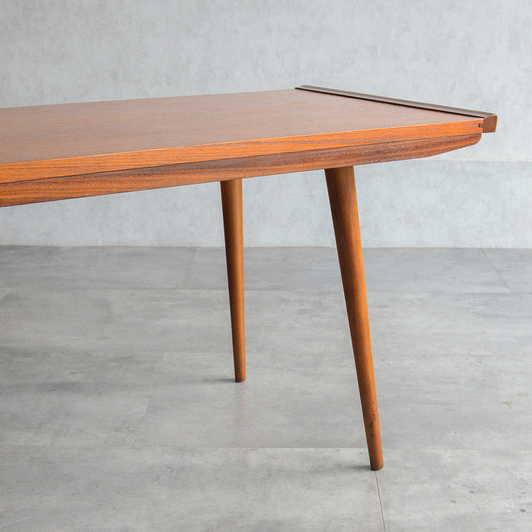 天板のチークの木目とスリムな丸脚のデザインが美しいセンターテーブル。