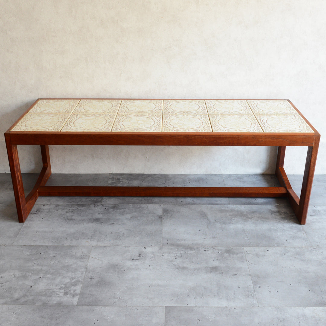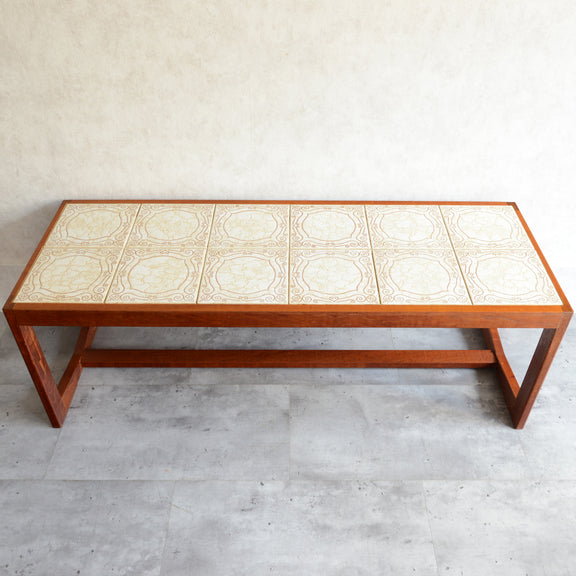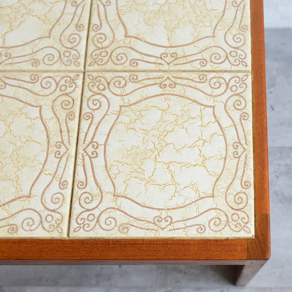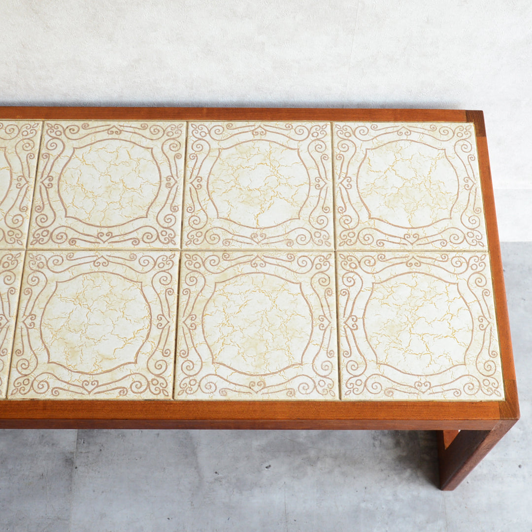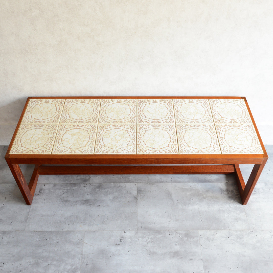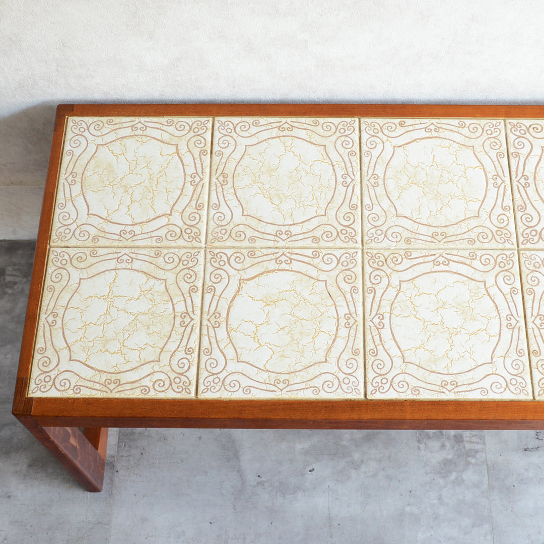アイボリーの地に品のある曲線模様が描かれたタイルが美しいコーヒーテーブル