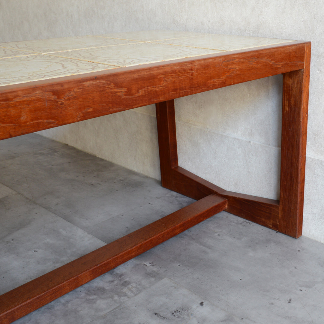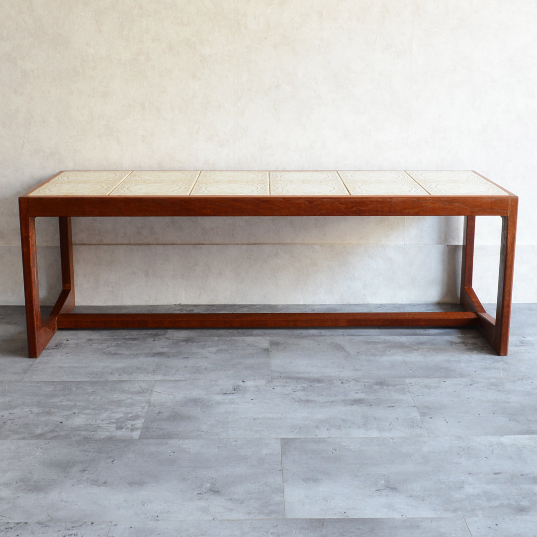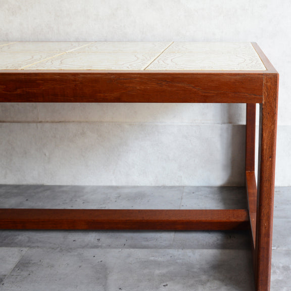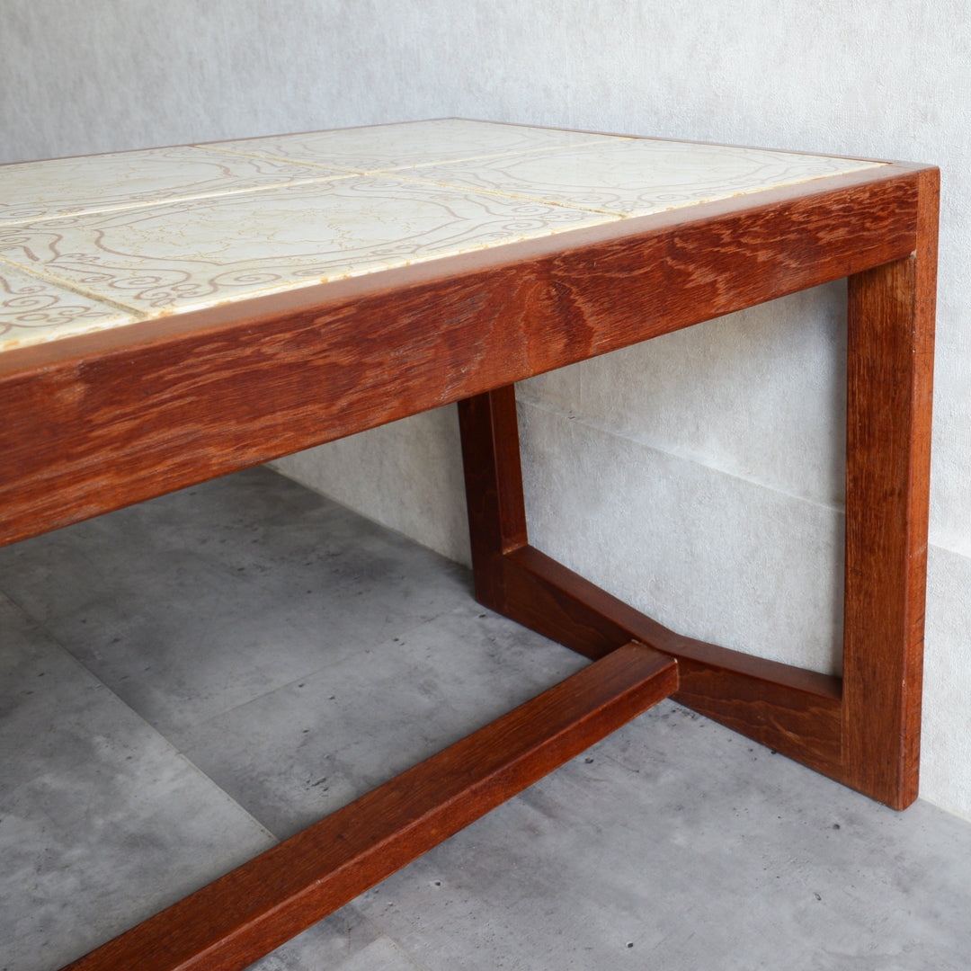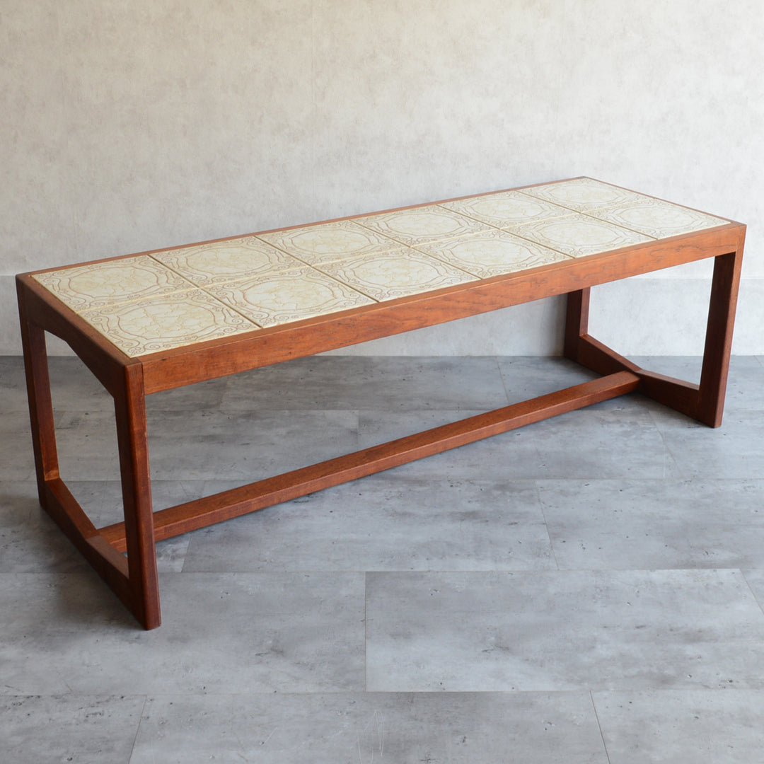 アイボリーの地に品のある曲線模様が描かれたタイルが美しいコーヒーテーブル