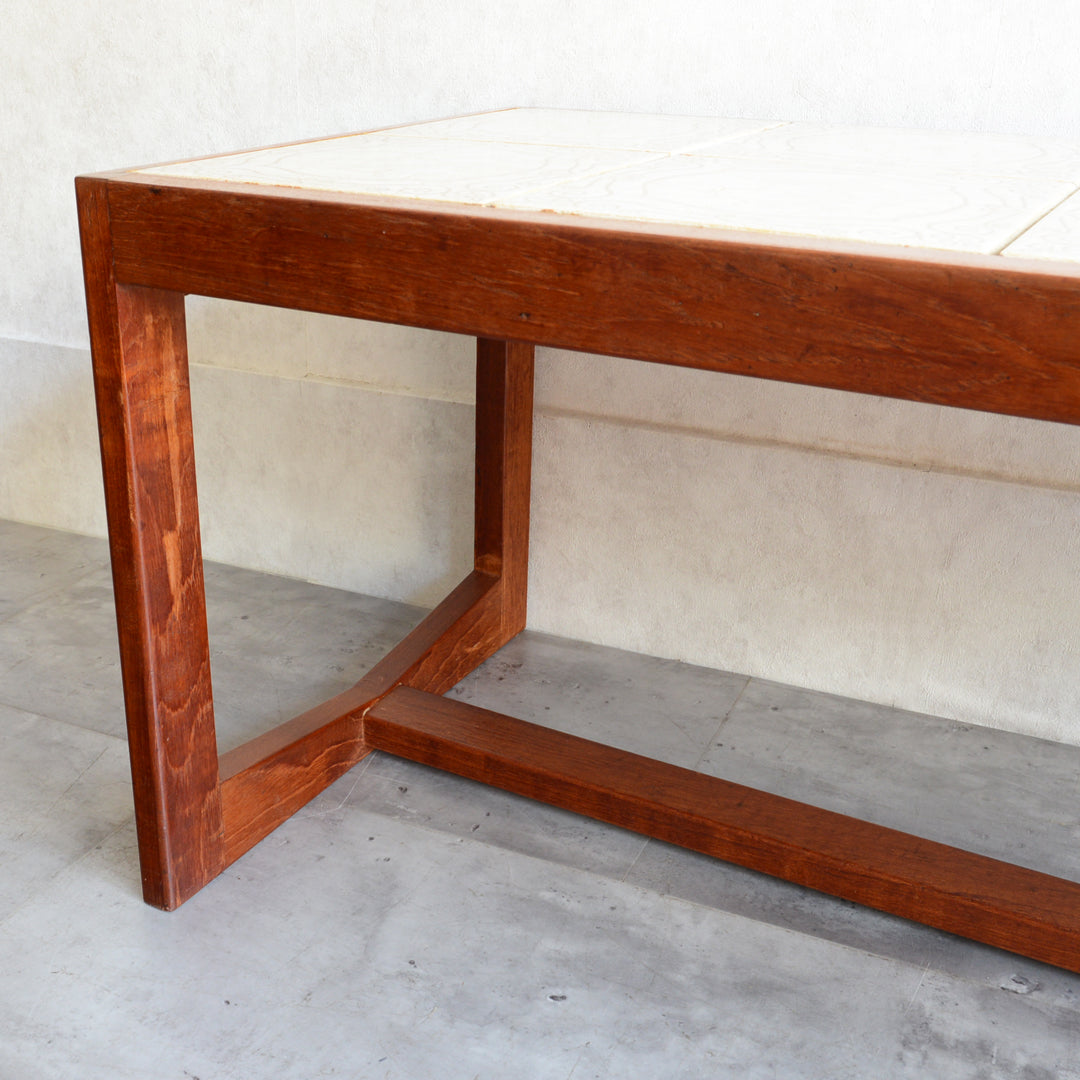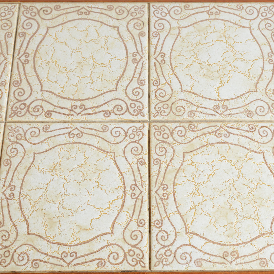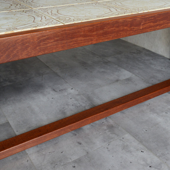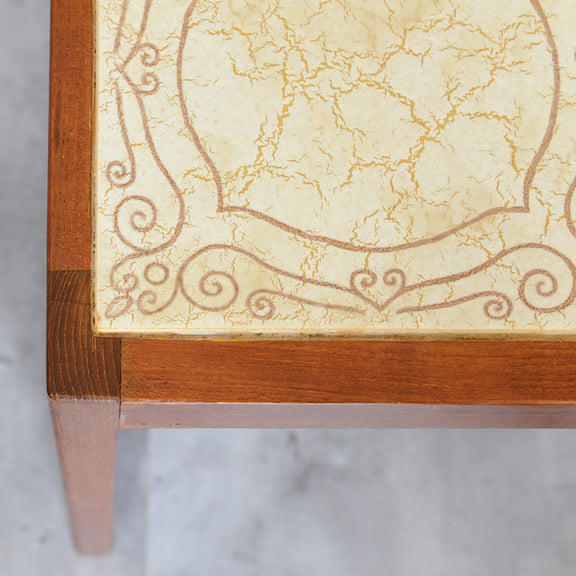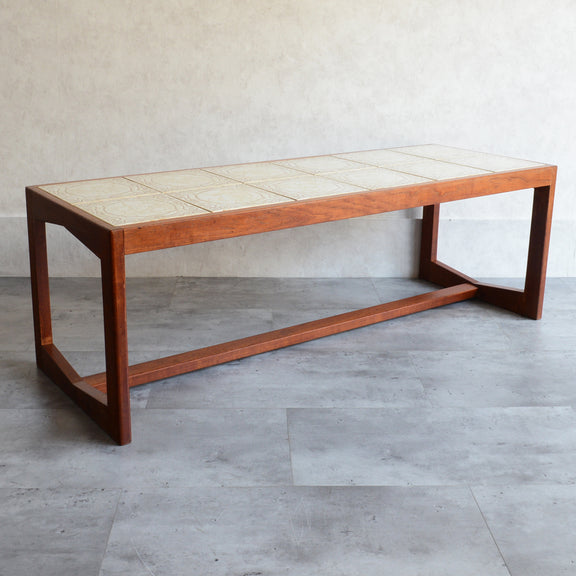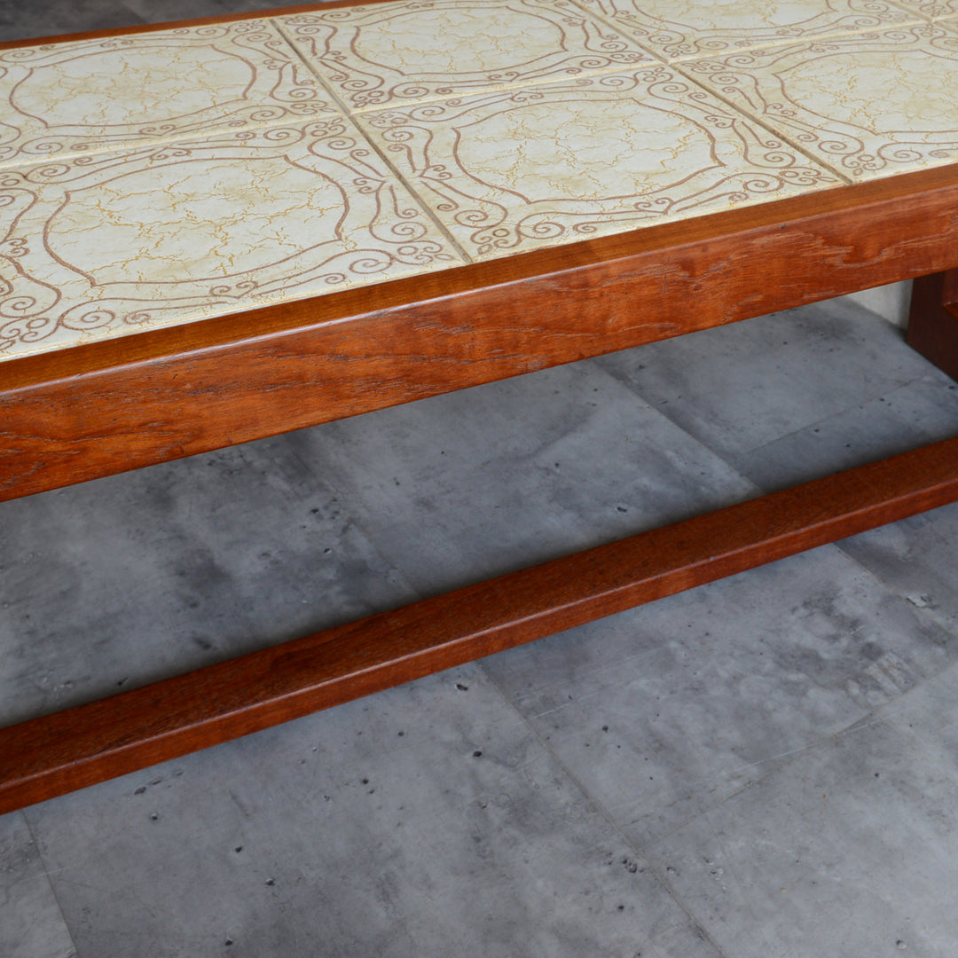 アイボリーの地に品のある曲線模様が描かれたタイルが美しいコーヒーテーブル