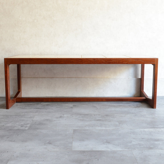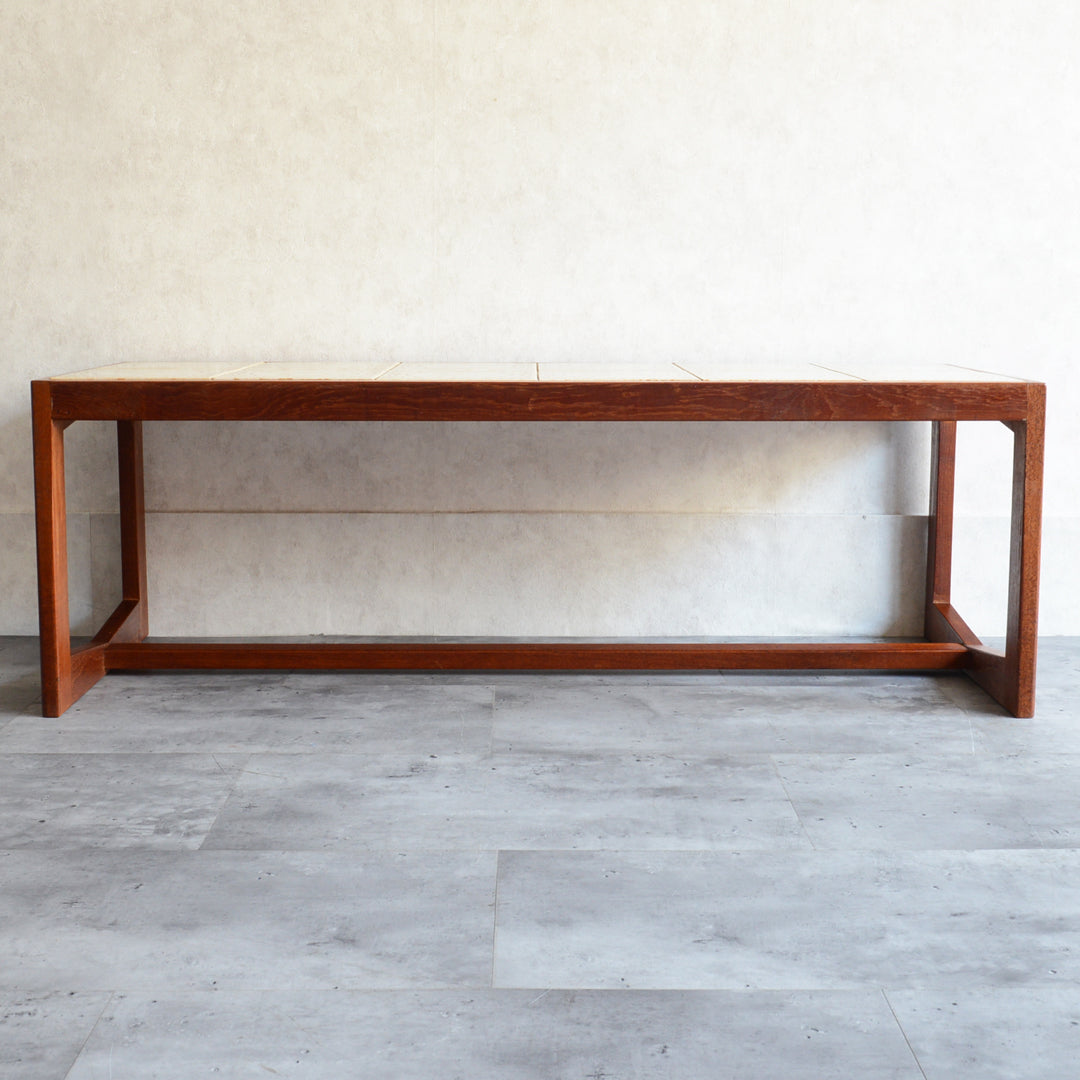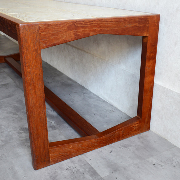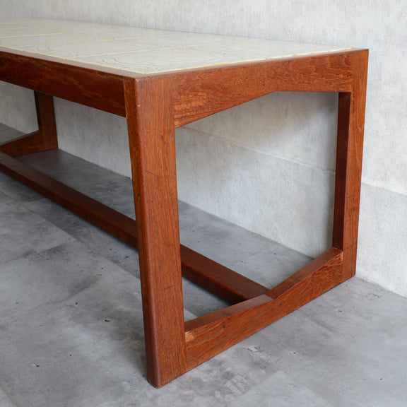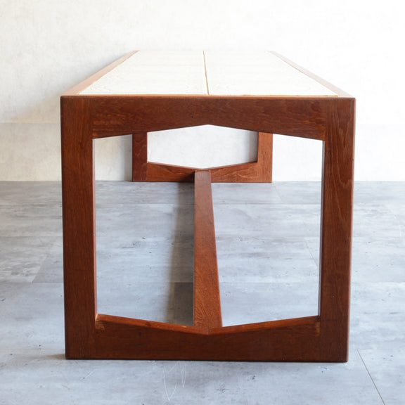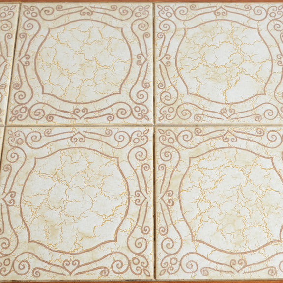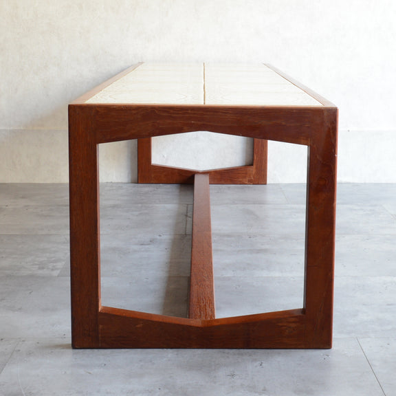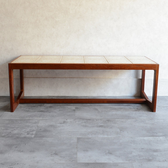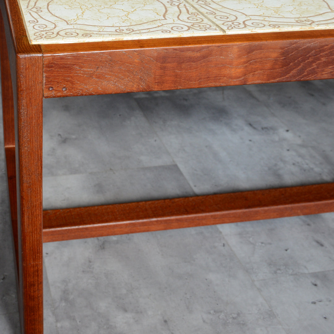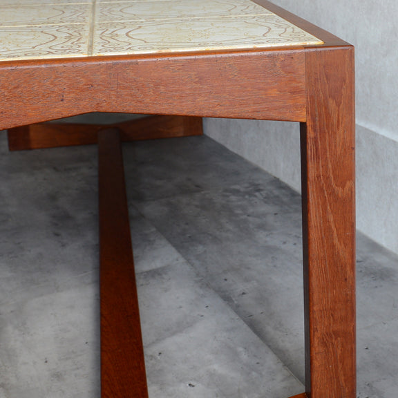 アイボリーの地に品のある曲線模様が描かれたタイルが美しいコーヒーテーブル