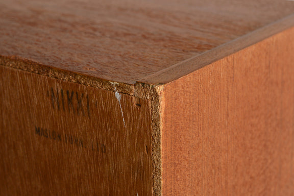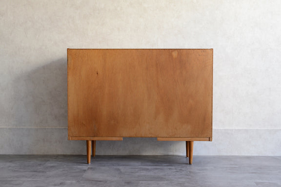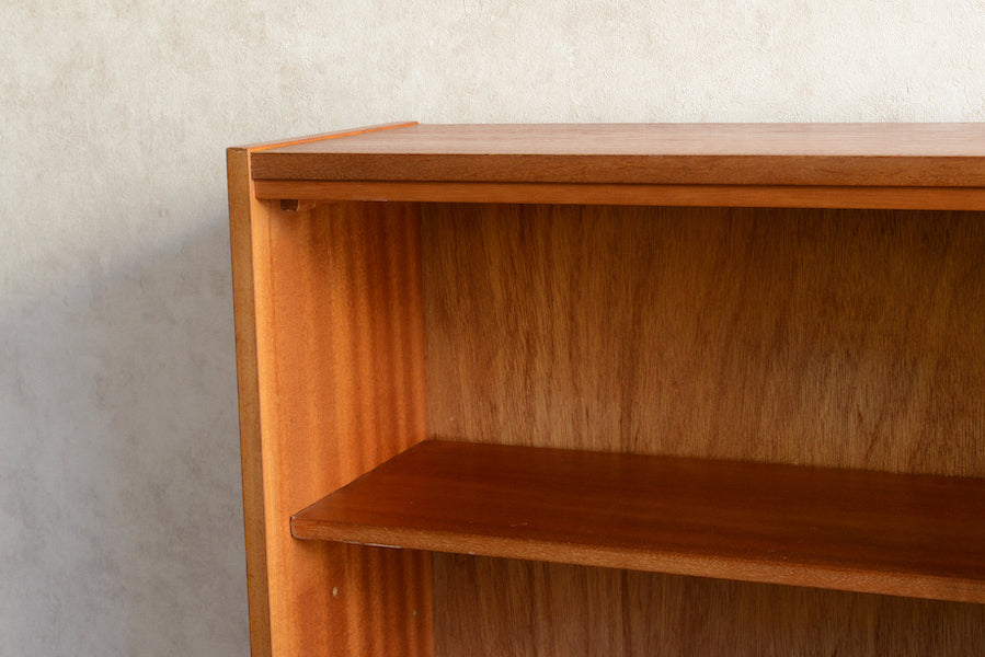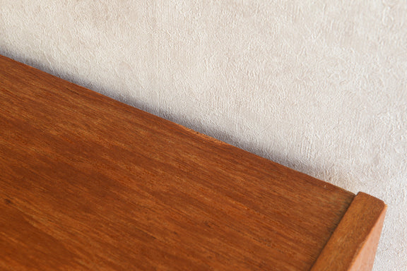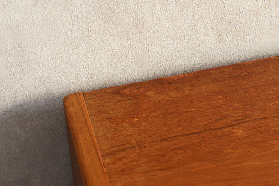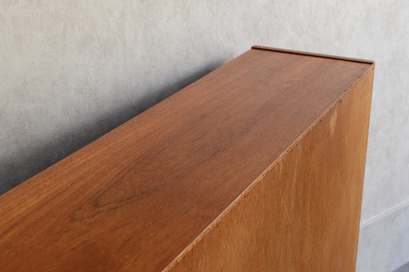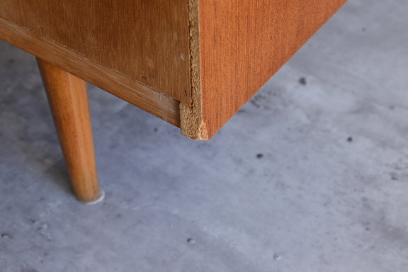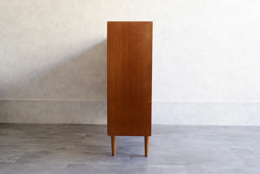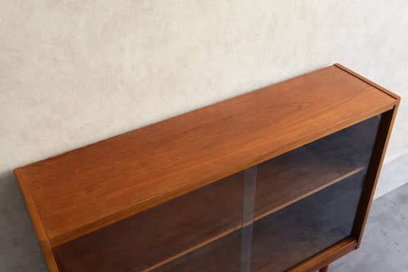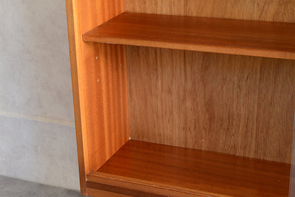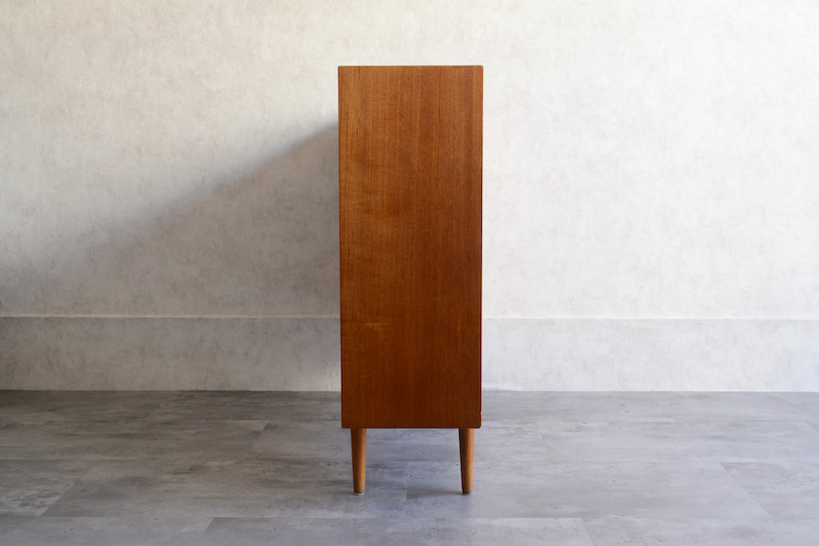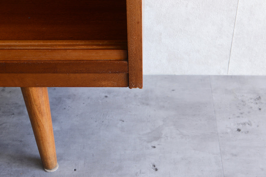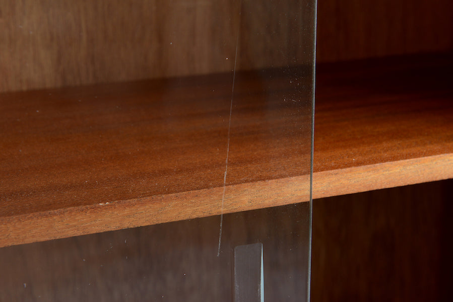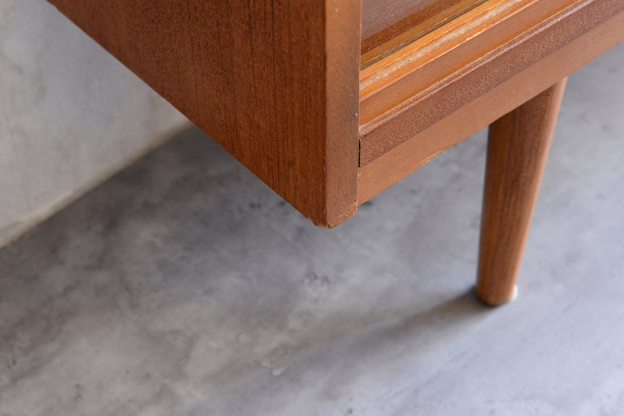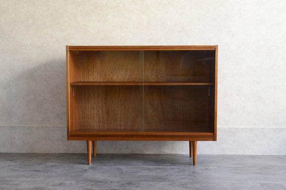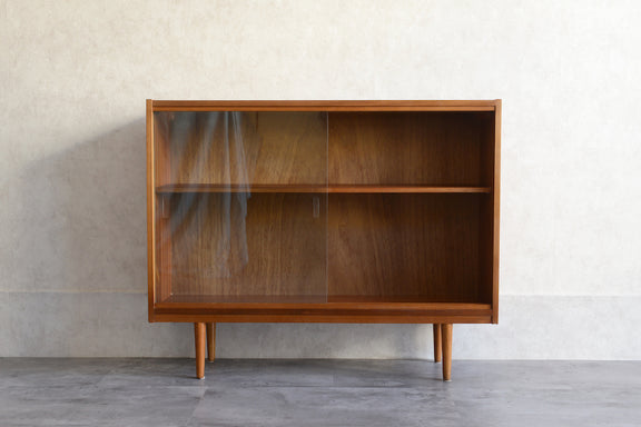 ミッドセンチュリー期のチークのキャビネットです。引き違いガラス戸付きで、ディスプレイを楽しみながらお好みの品々を収納できます。
