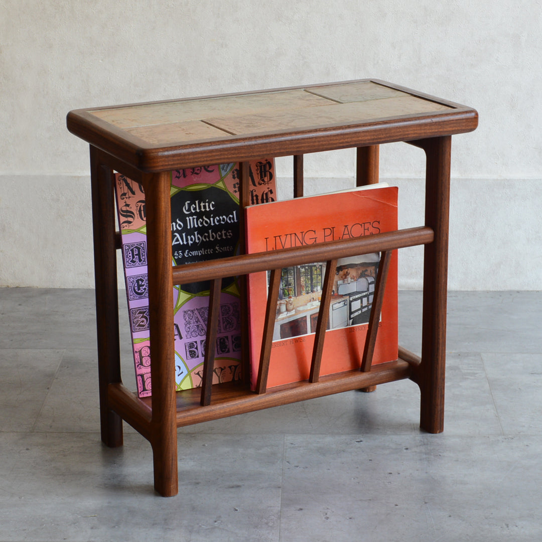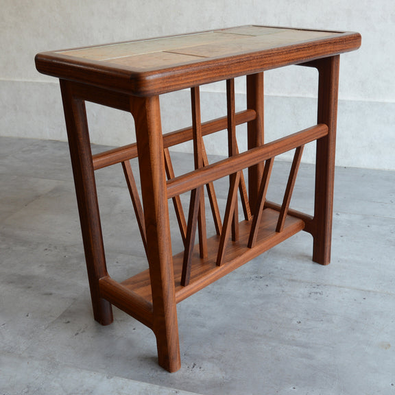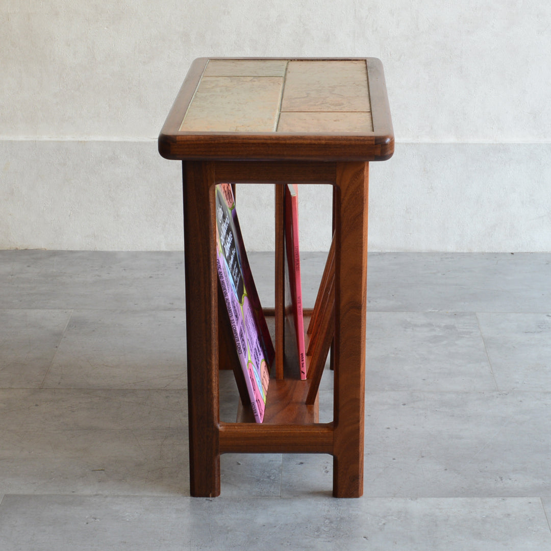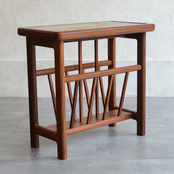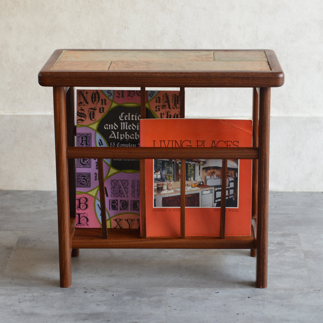 イタリア又はスペインで製造された高品質の磁器タイルが天板に嵌め込まれたチーク材のマガジンラック。