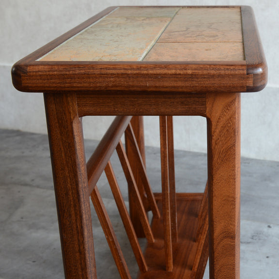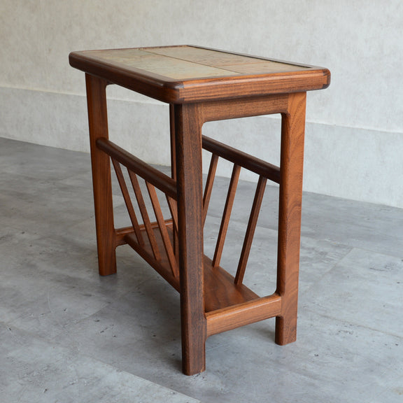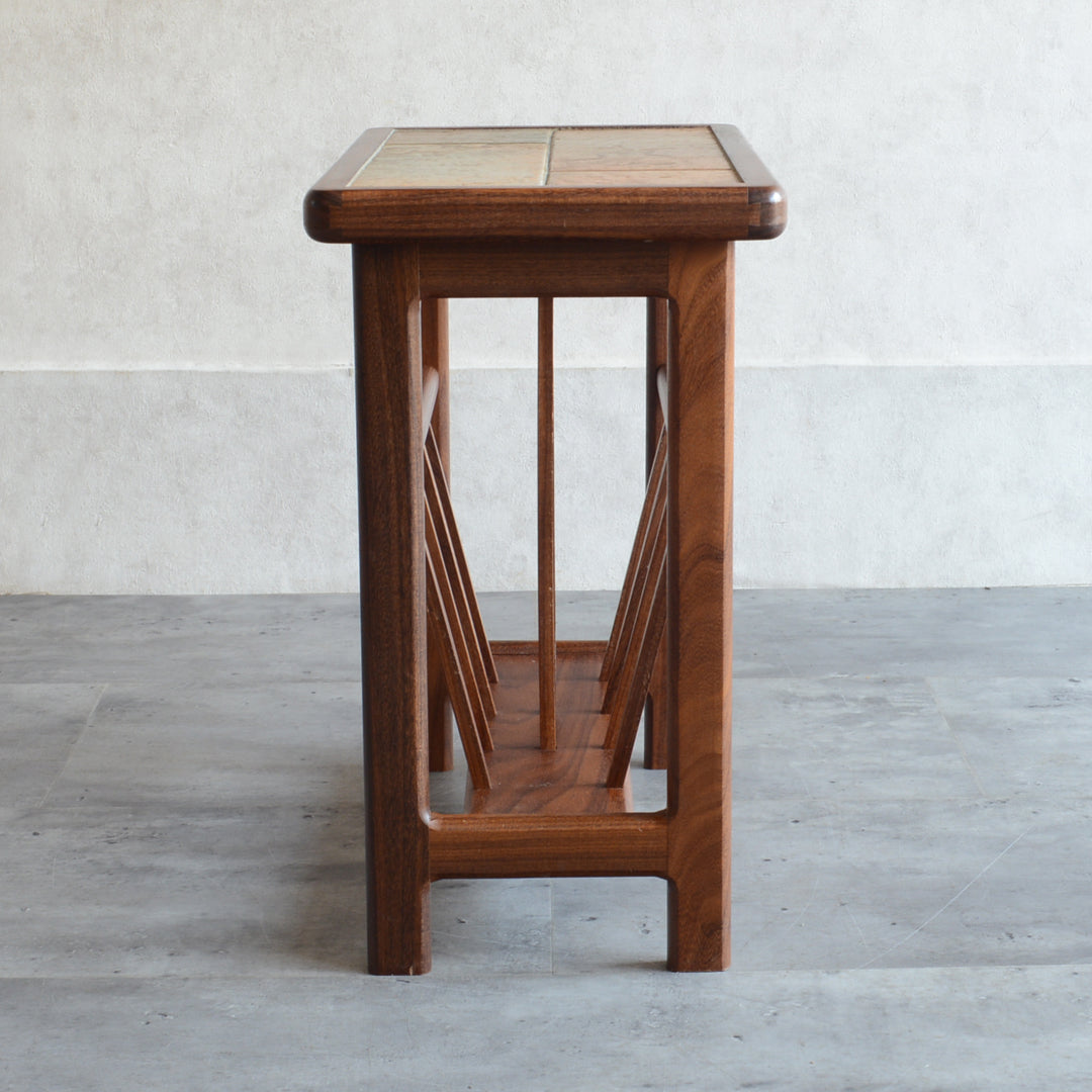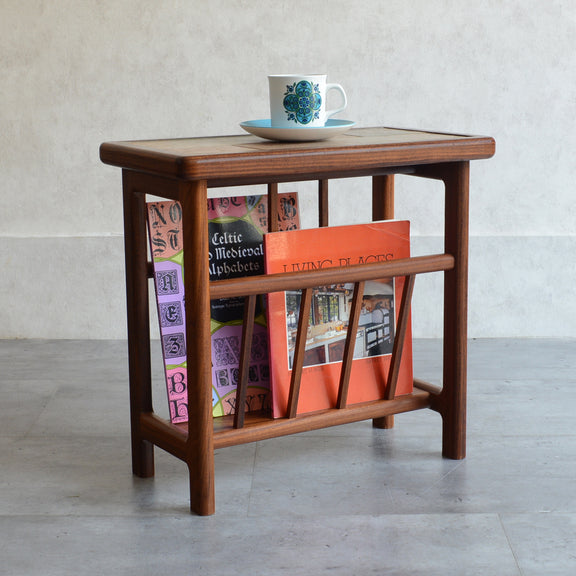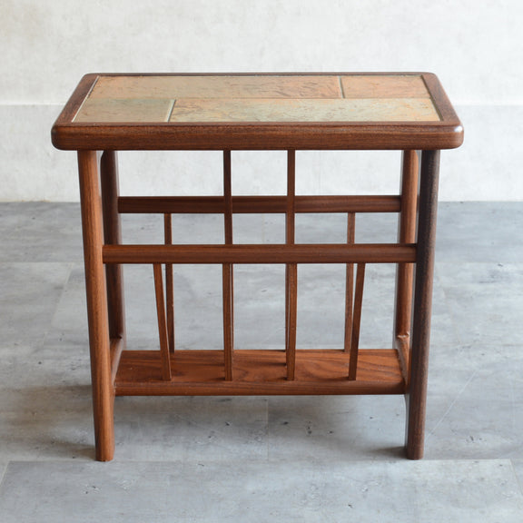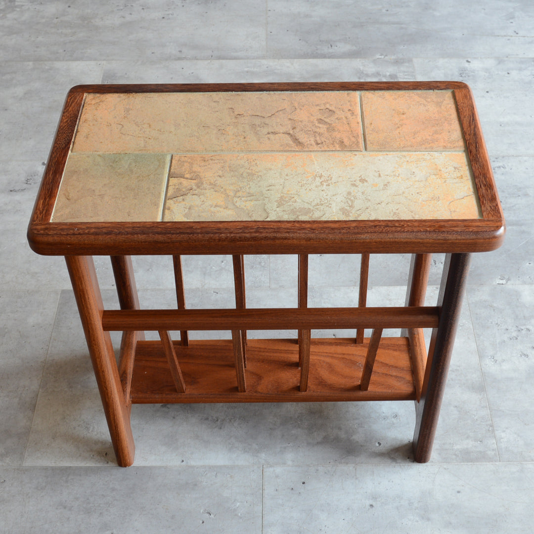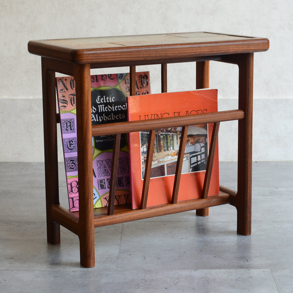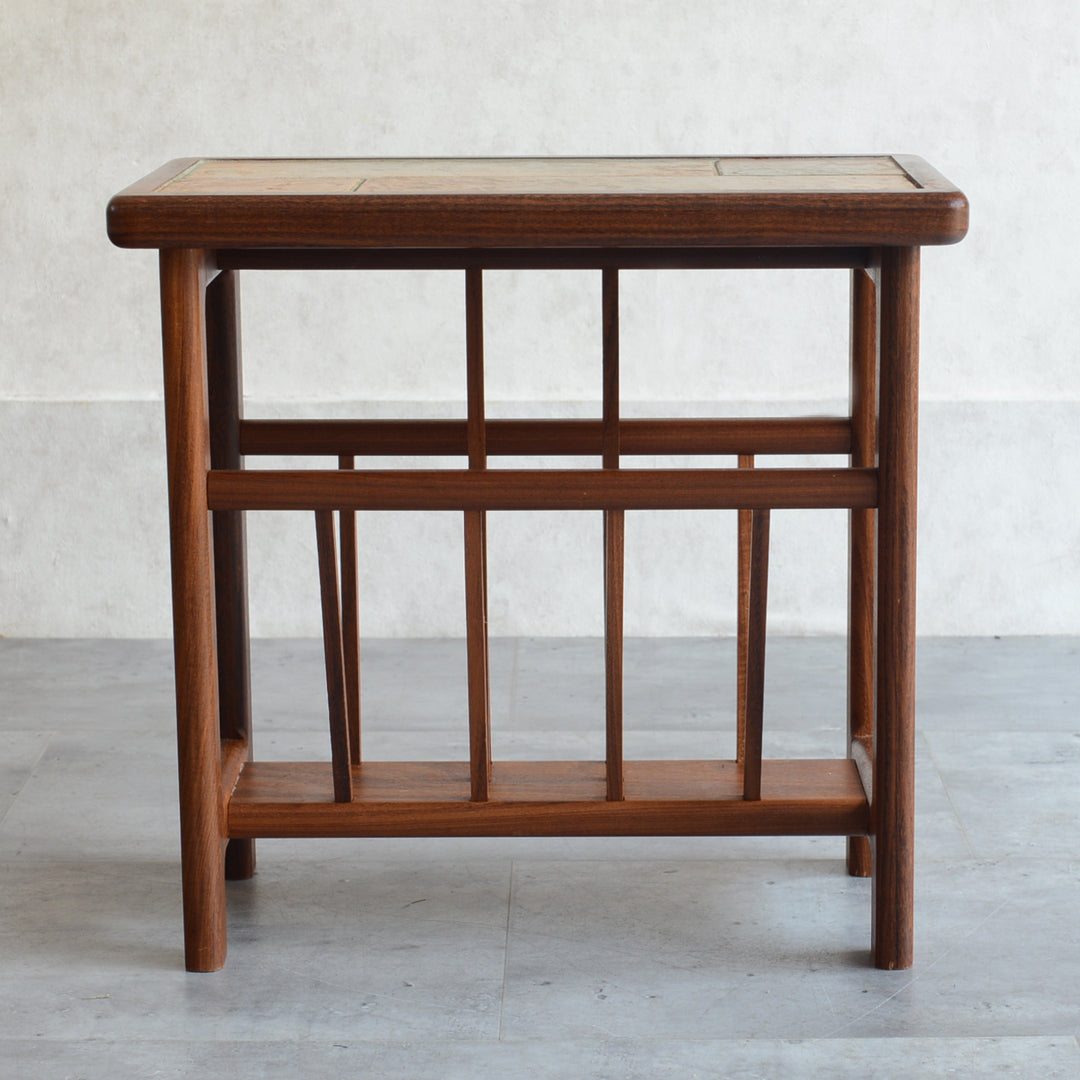 イタリア又はスペインで製造された高品質の磁器タイルが天板に嵌め込まれたチーク材のマガジンラック。