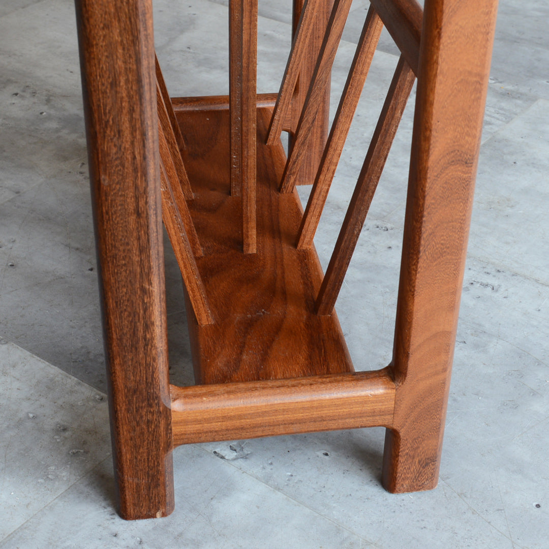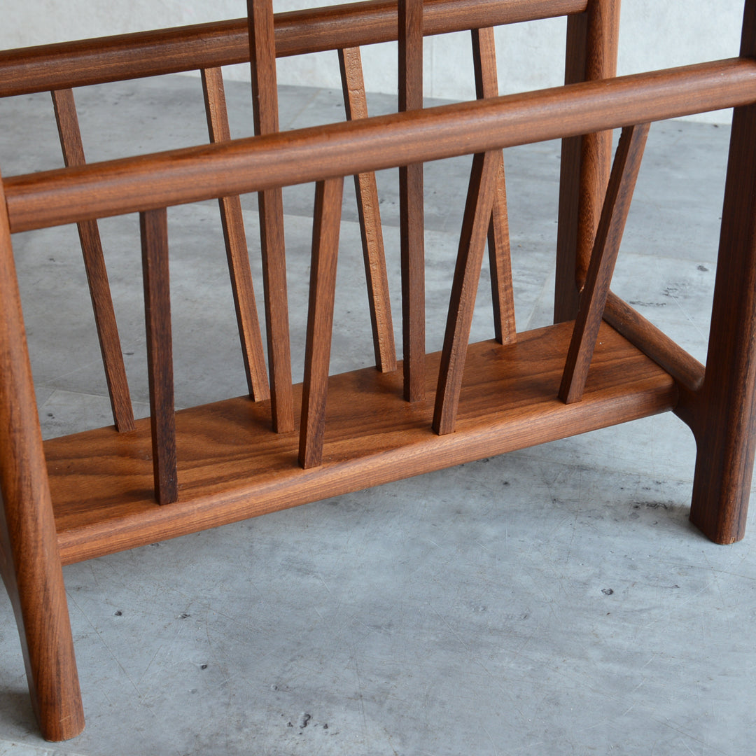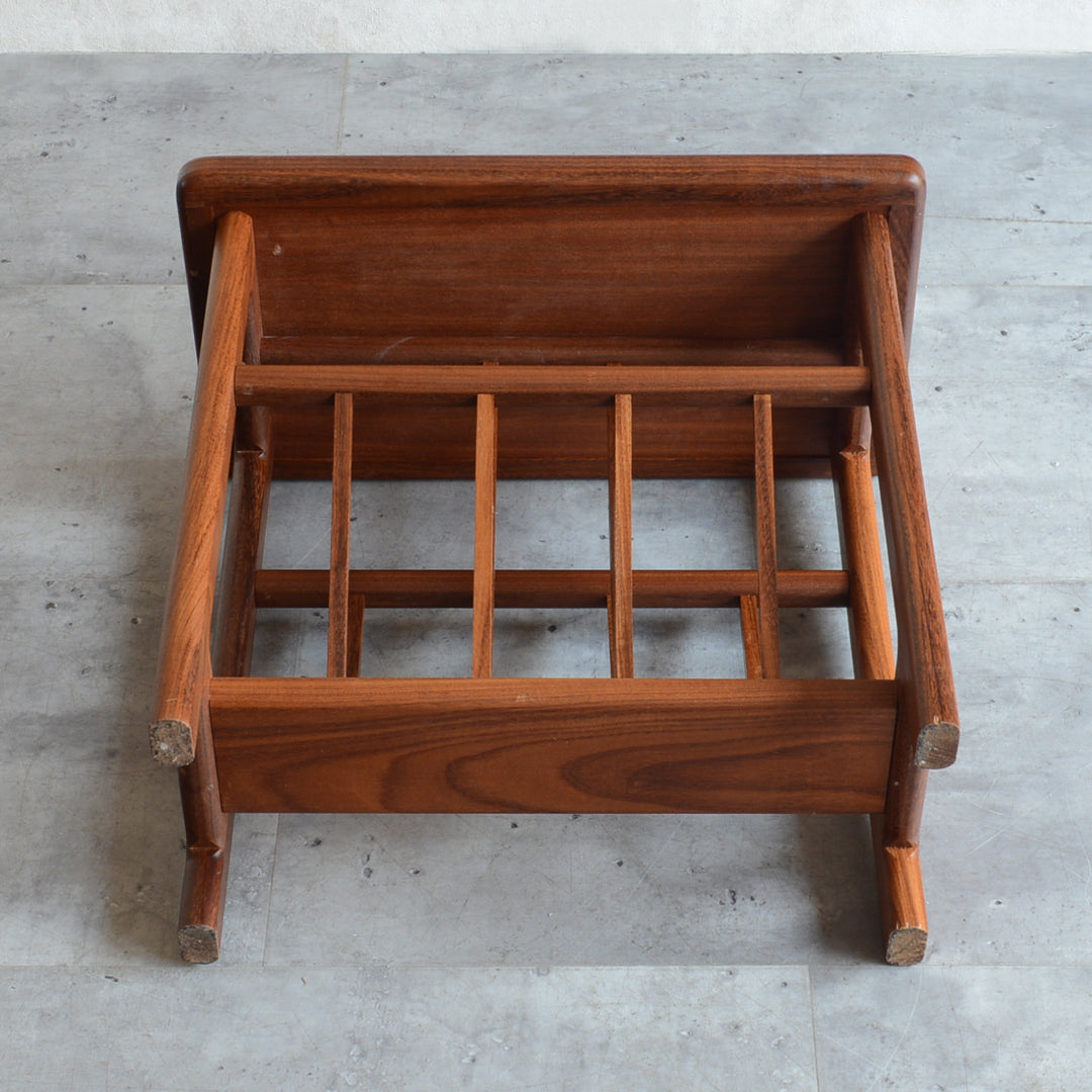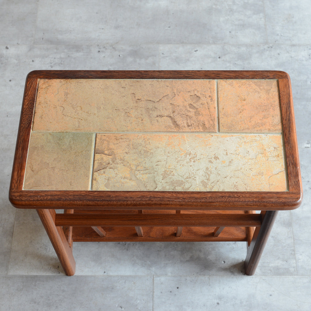 イタリア又はスペインで製造された高品質の磁器タイルが天板に嵌め込まれたチーク材のマガジンラック。