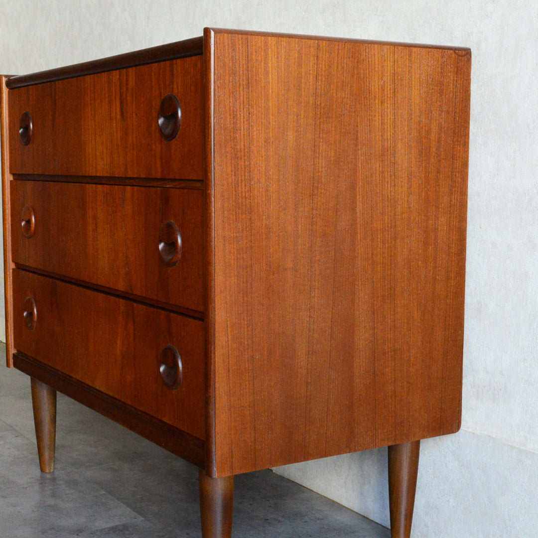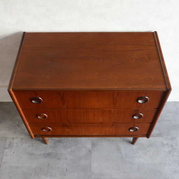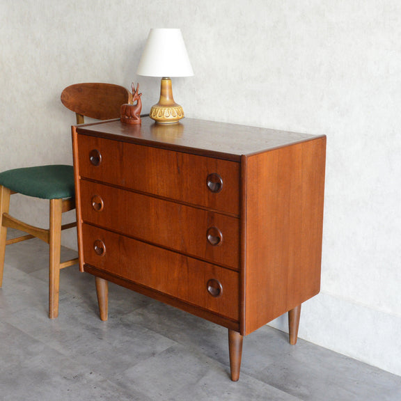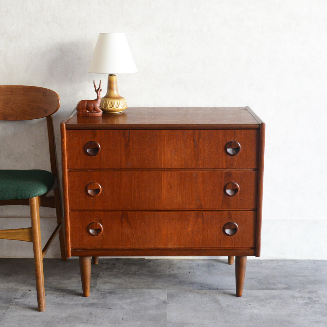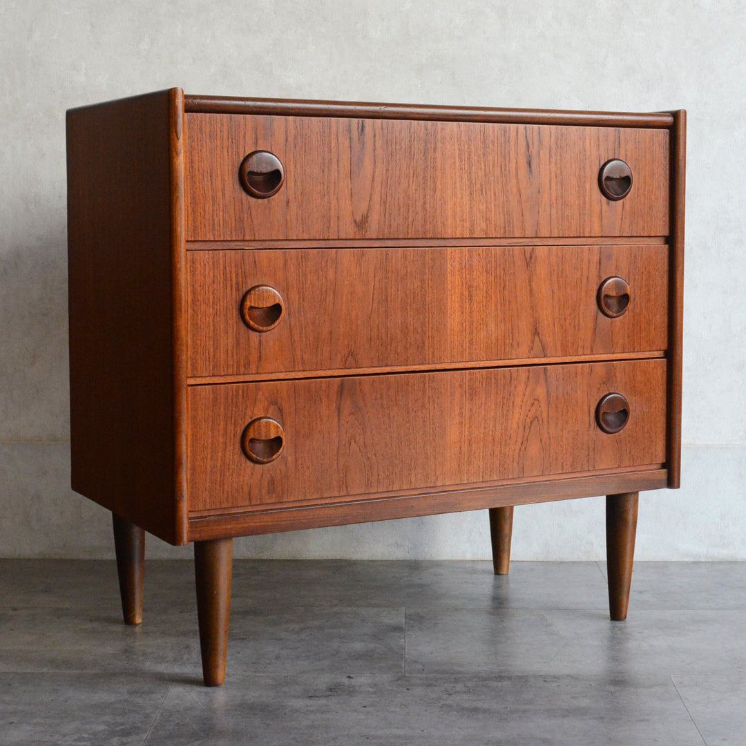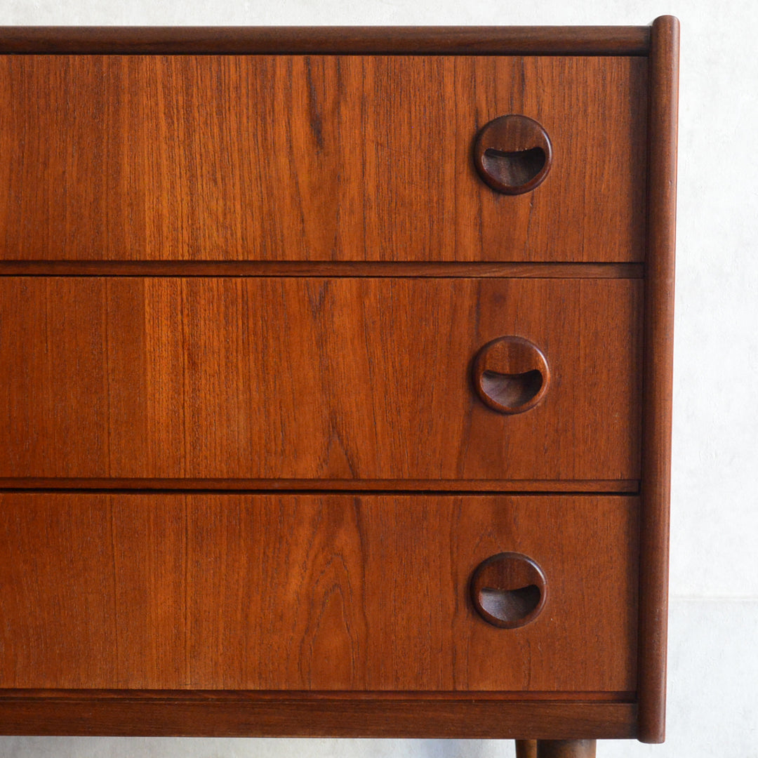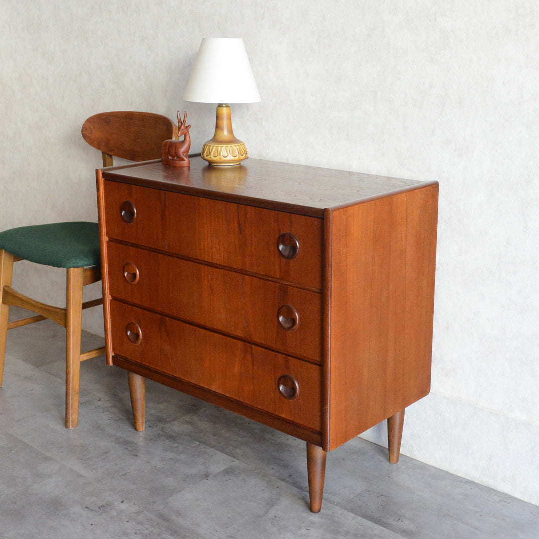 チーク材の濃いめの木目が美しい3段チェスト