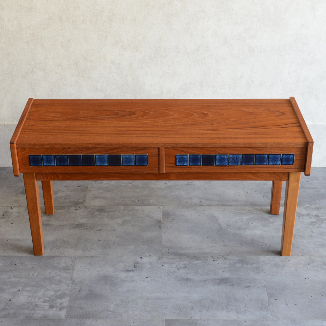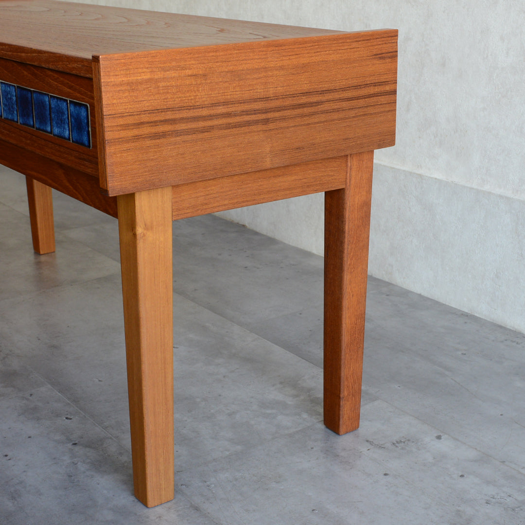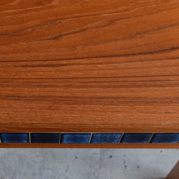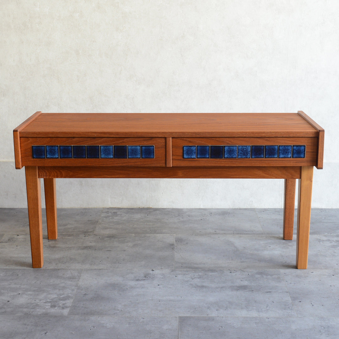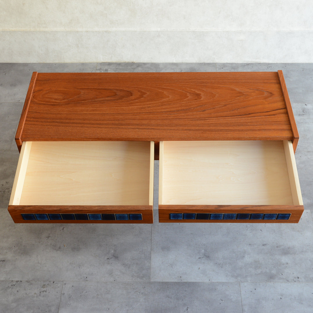 天板のチークの木目が美しく、グラデーションのブルータイルが魅力的な画になるチェスト。