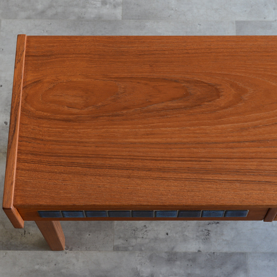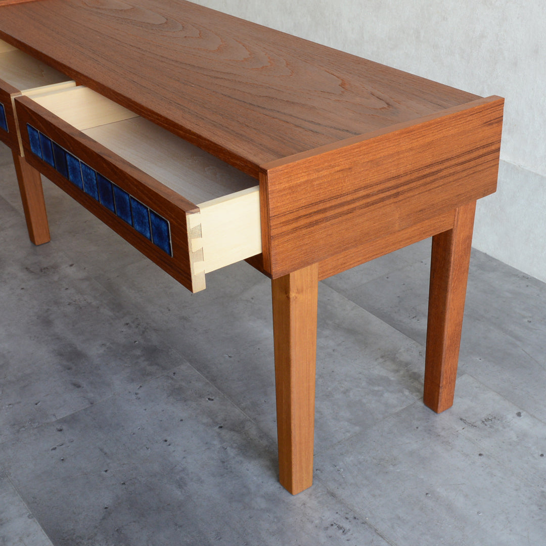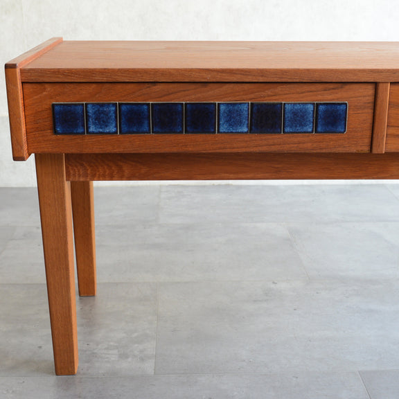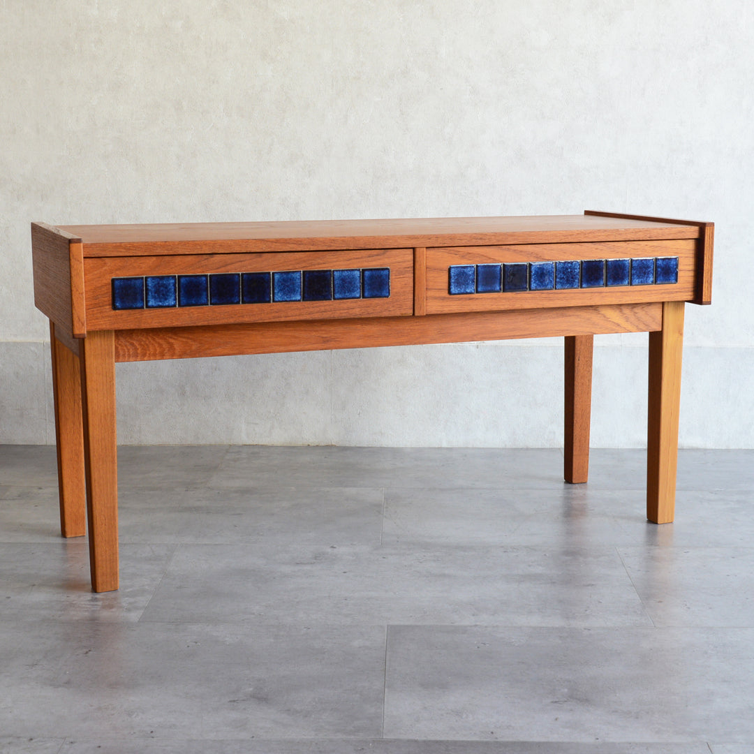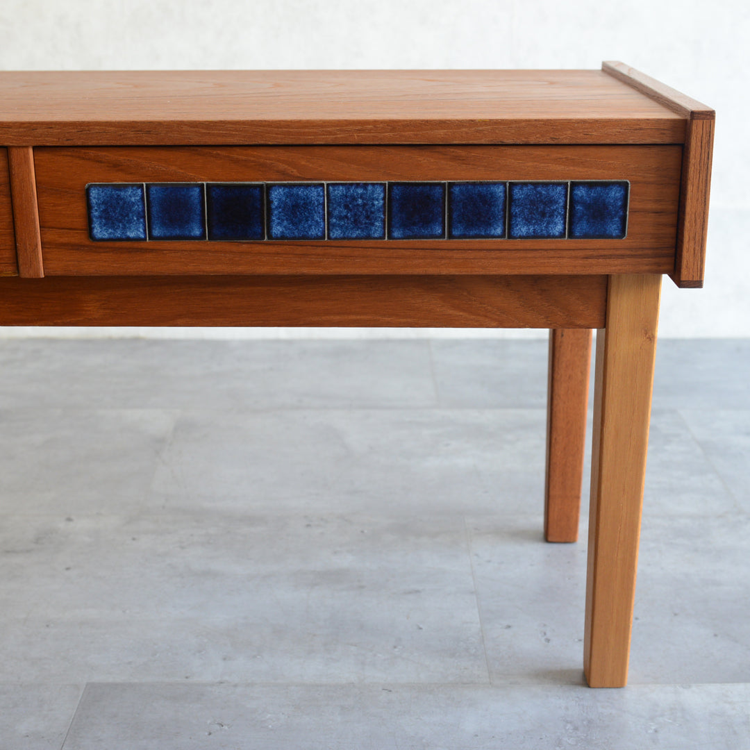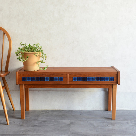 天板のチークの木目が美しく、グラデーションのブルータイルが魅力的な画になるチェスト。