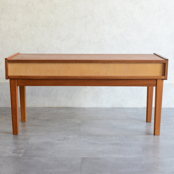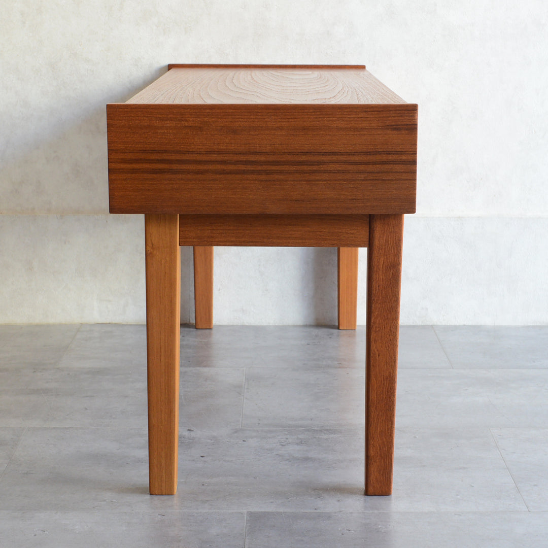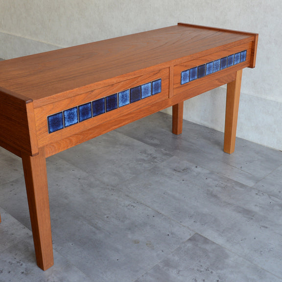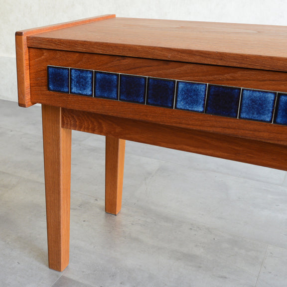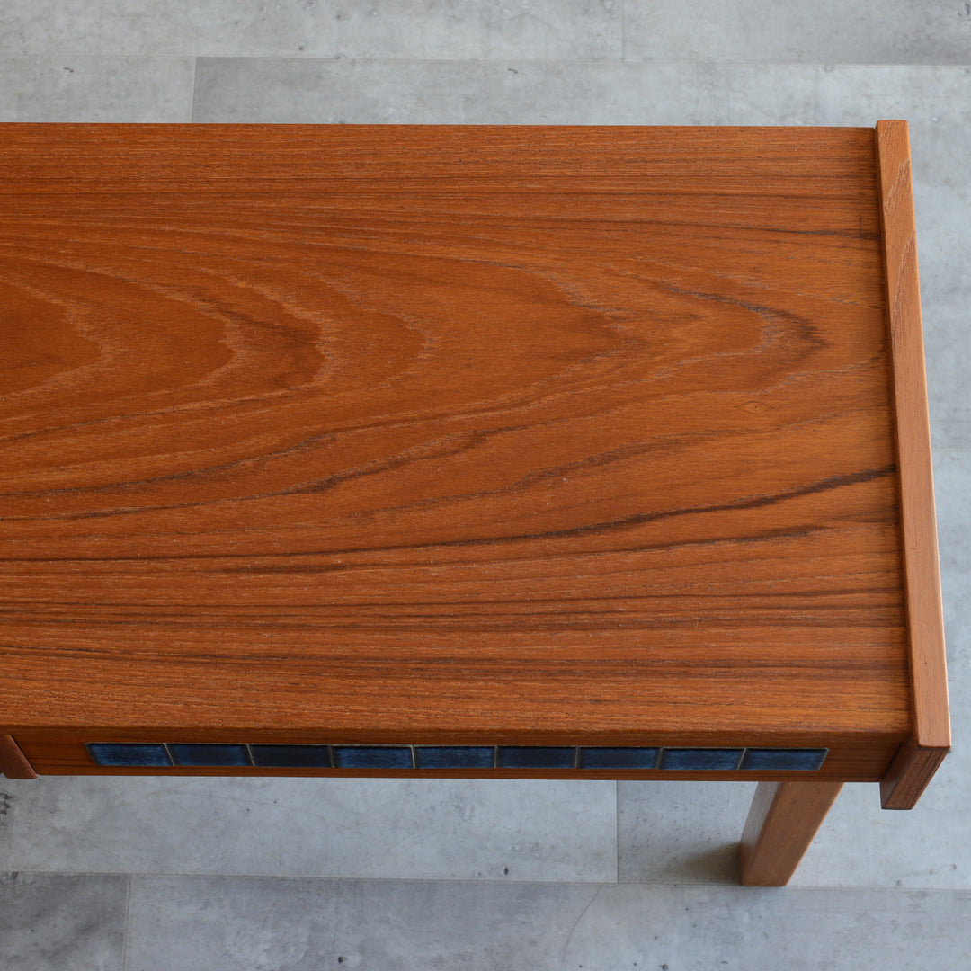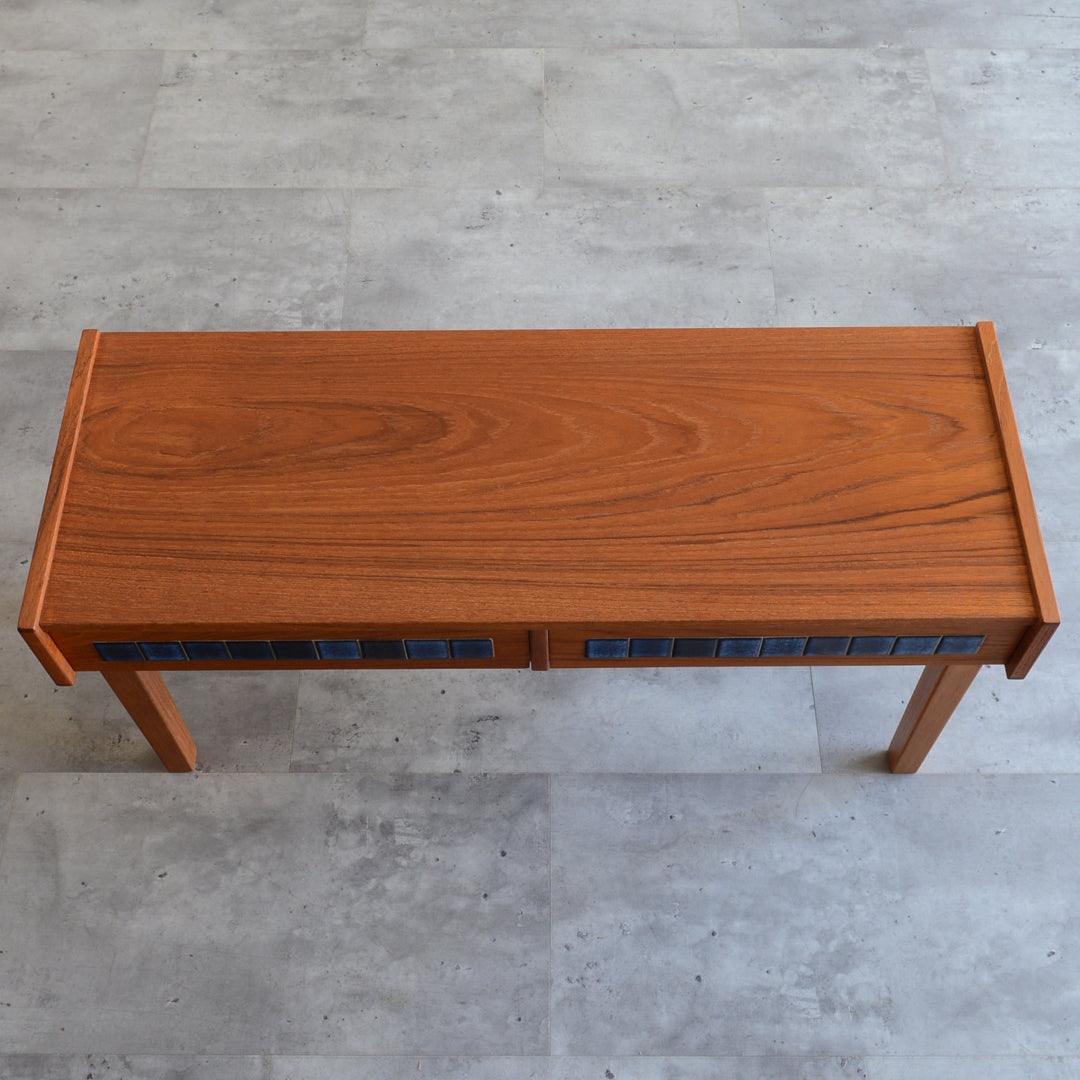 天板のチークの木目が美しく、グラデーションのブルータイルが魅力的な画になるチェスト。