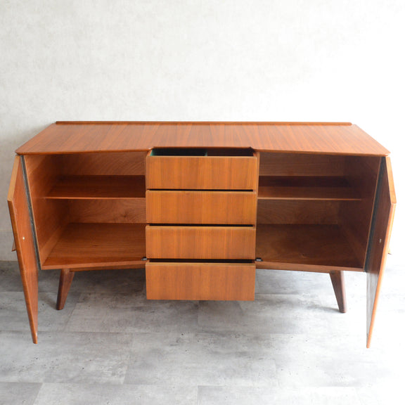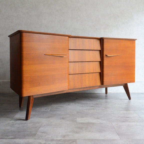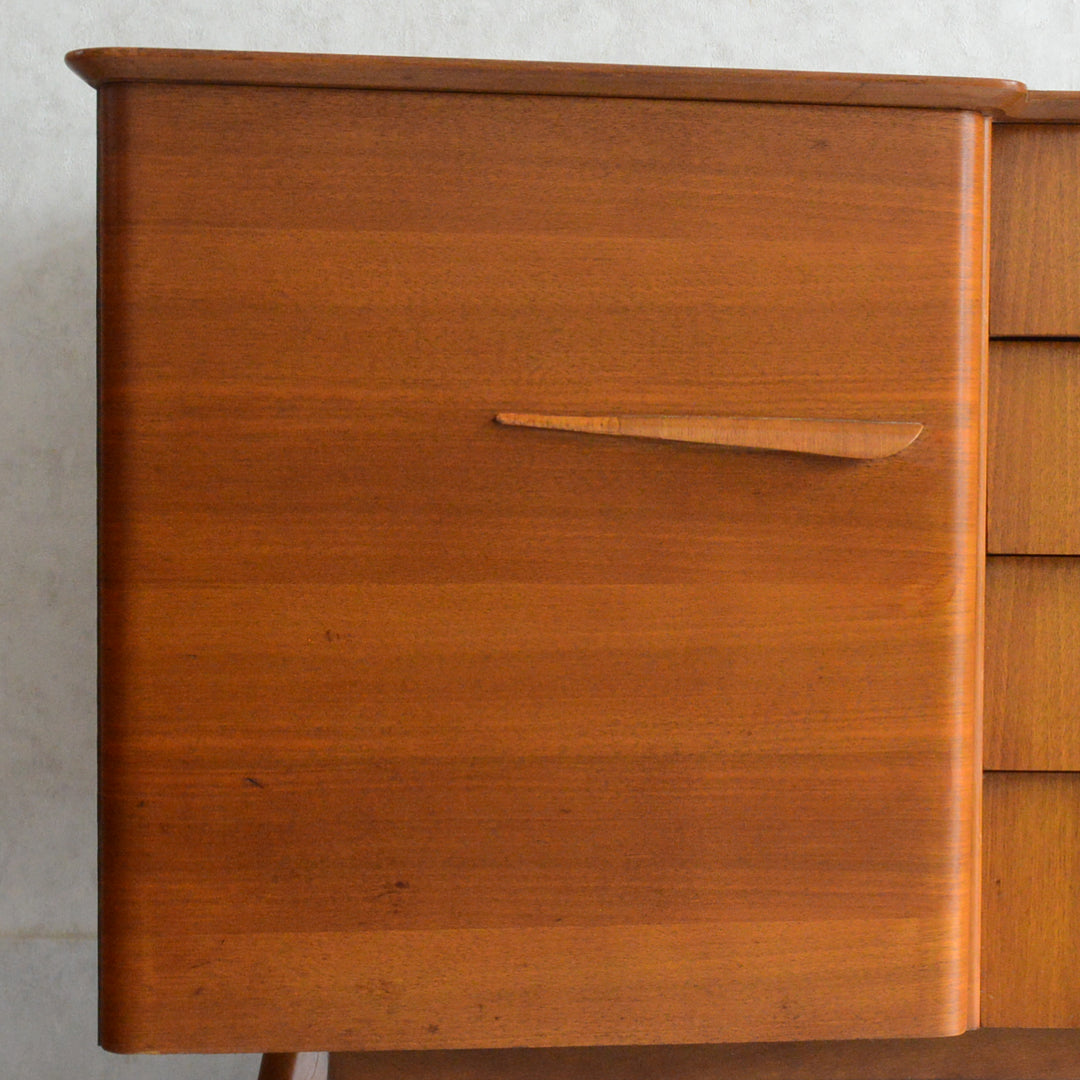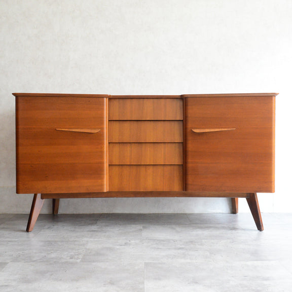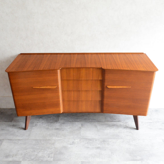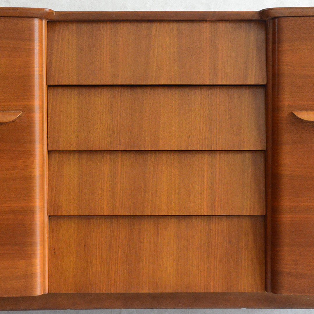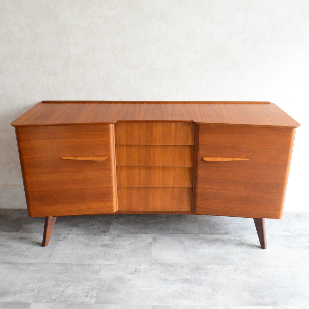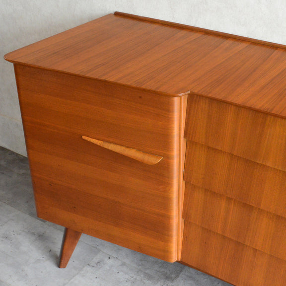 中央抽斗のスタイリッシュなデザインと扉の把手の曲線が印象的なサイドボード。