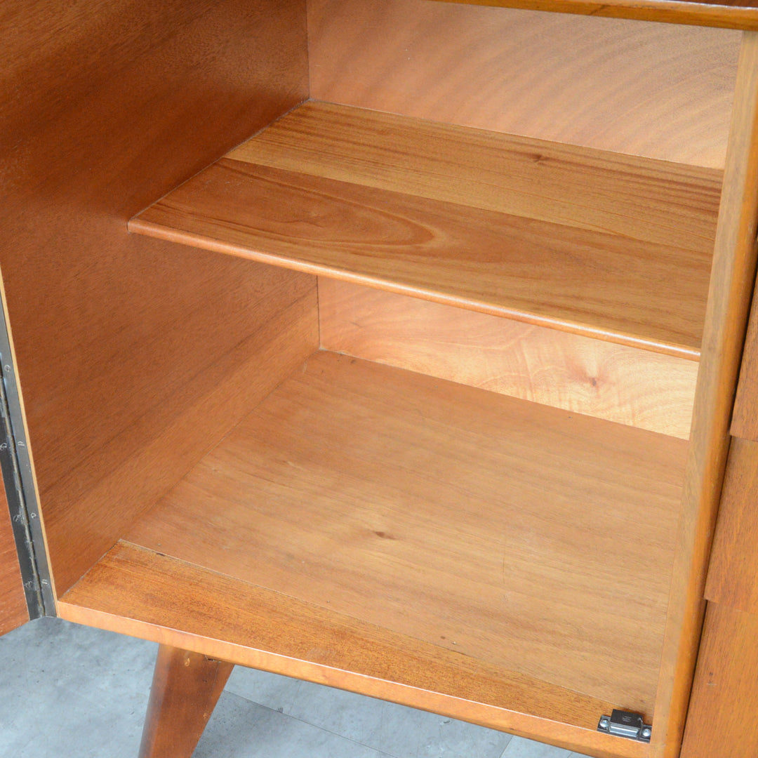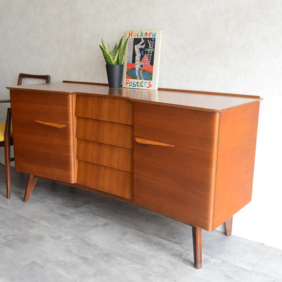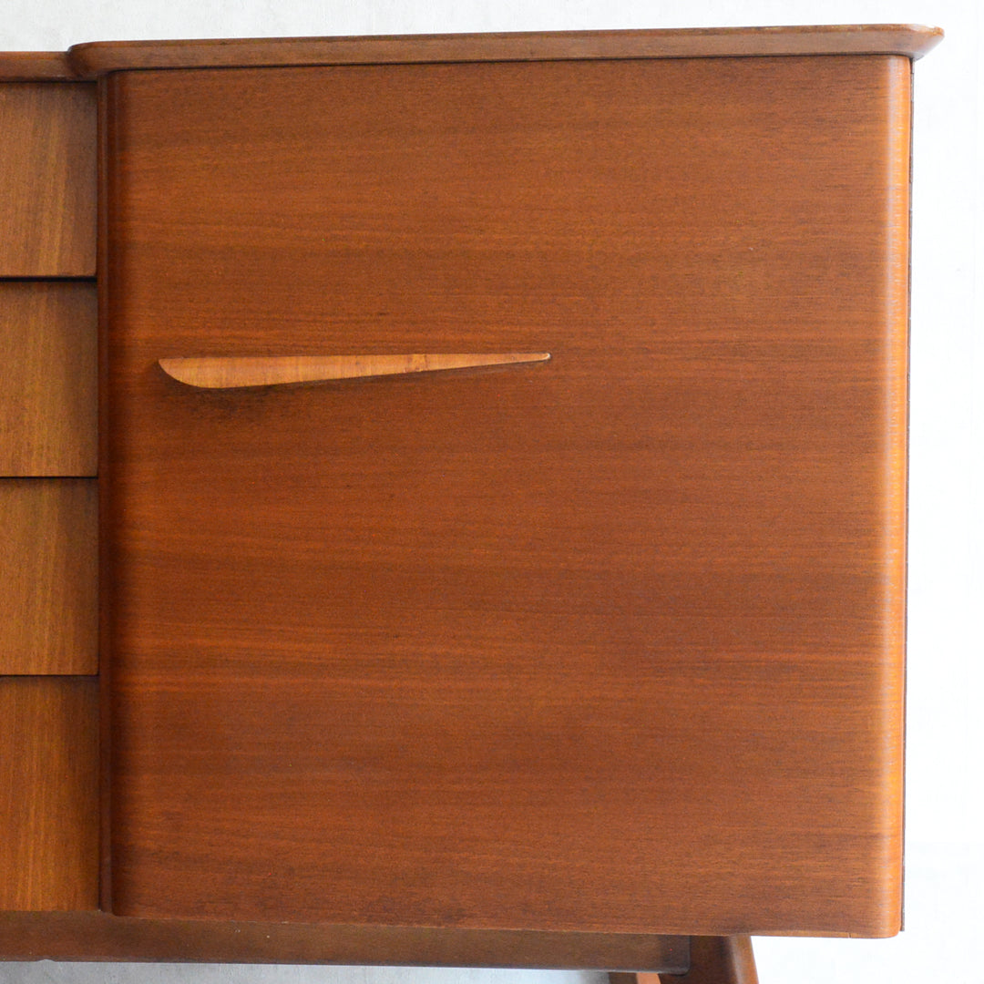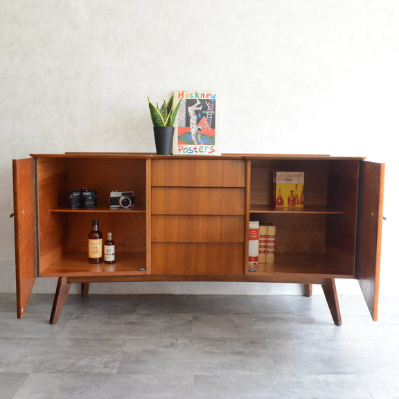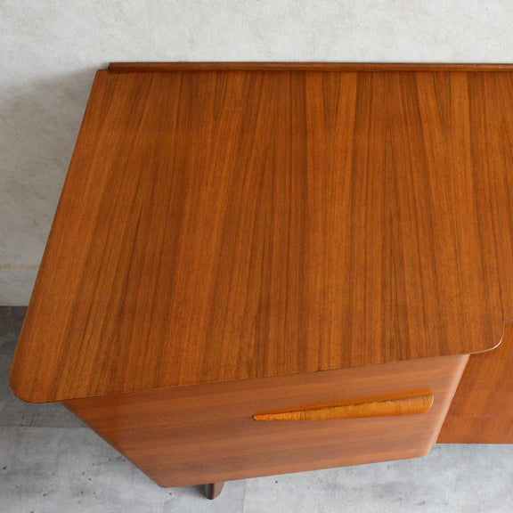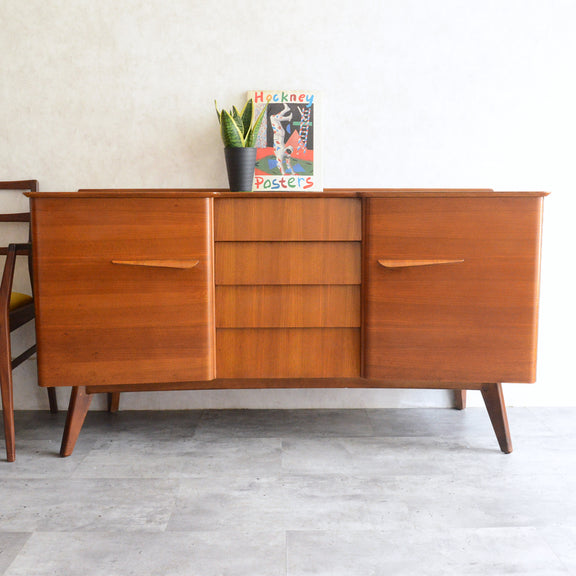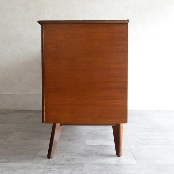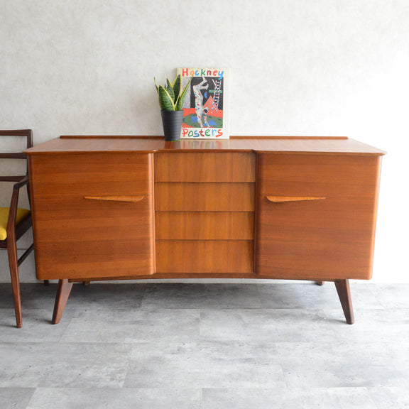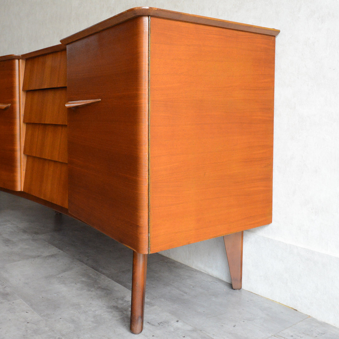 中央抽斗のスタイリッシュなデザインと扉の把手の曲線が印象的なサイドボード。