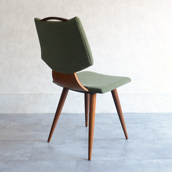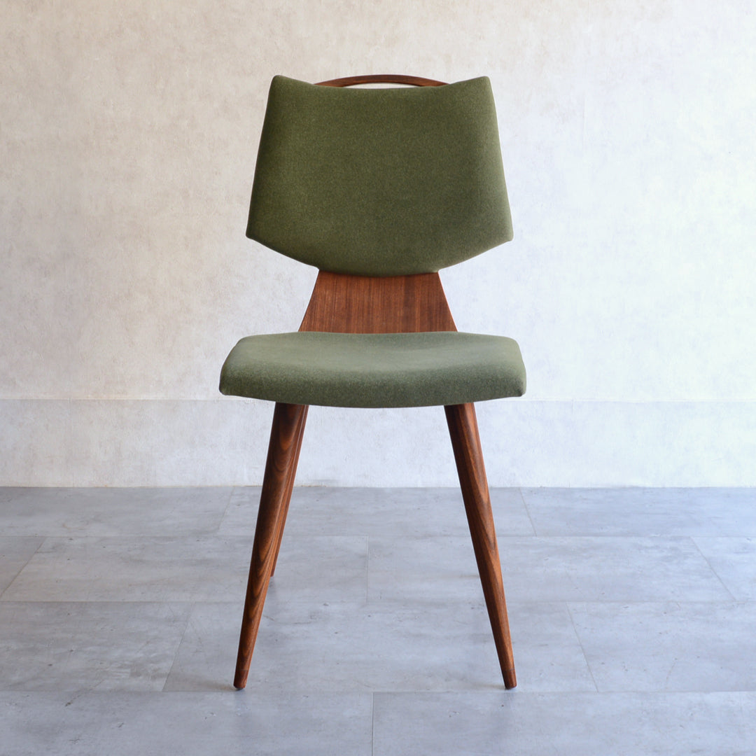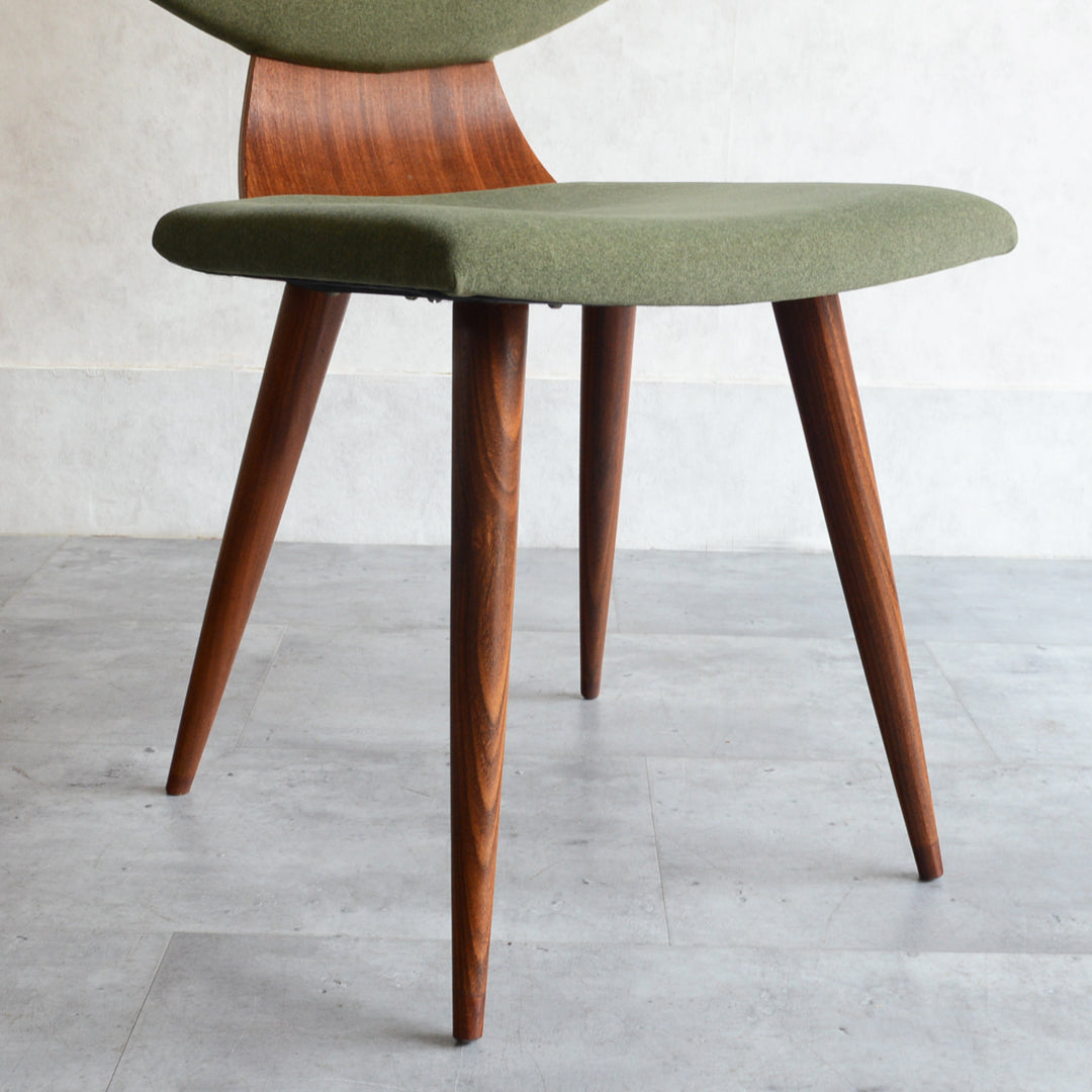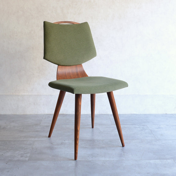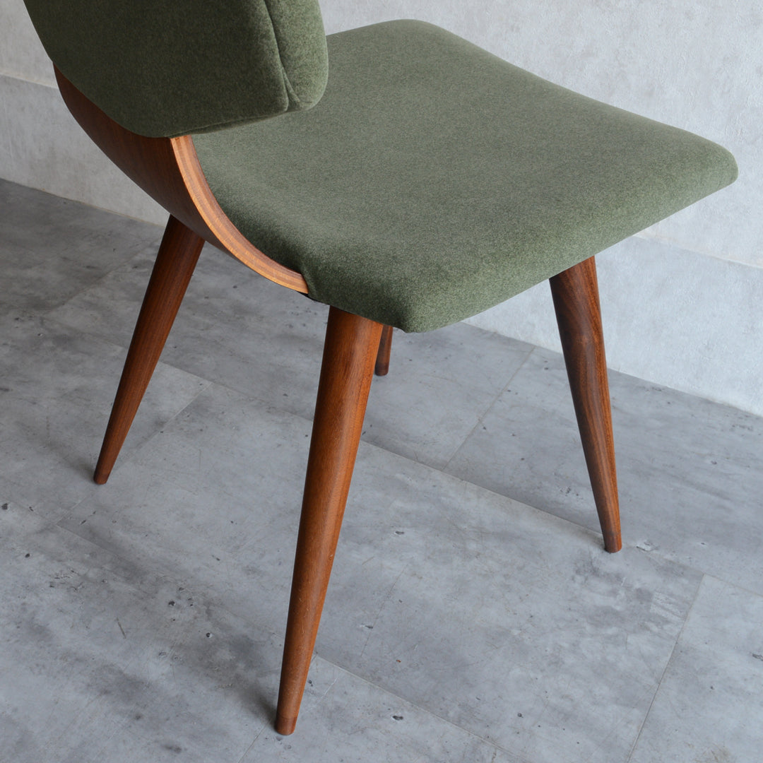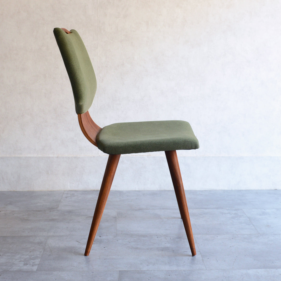 背板と座面を繋ぐ木部のカーブとテーパーの丸脚が印象的なモダンでスタイリッシュなチェアです。