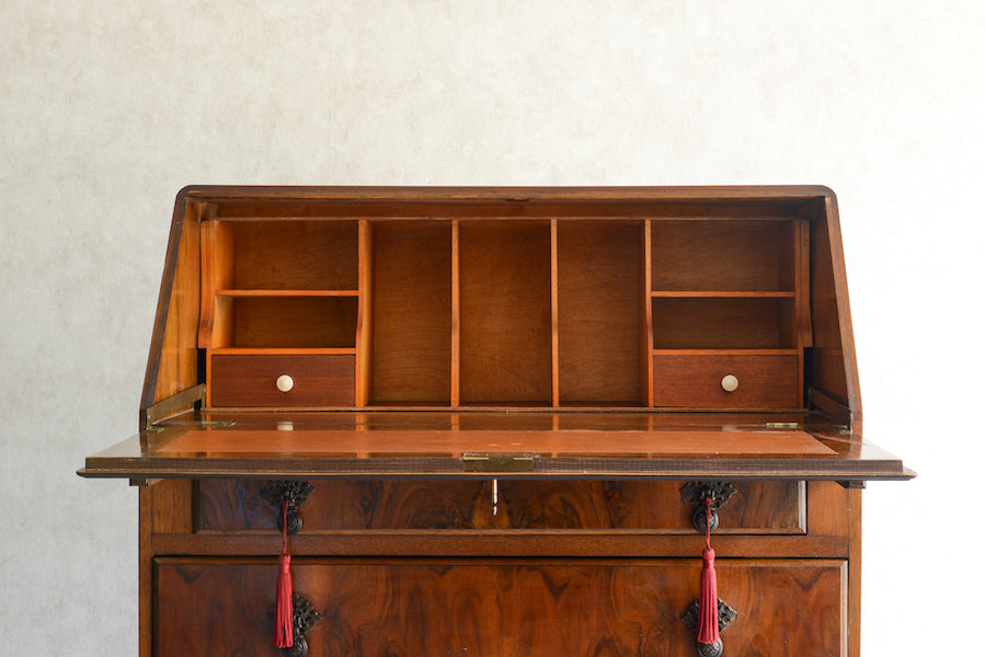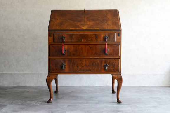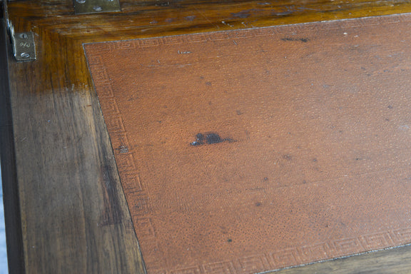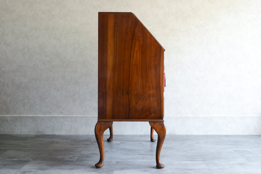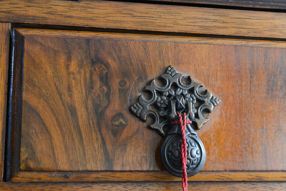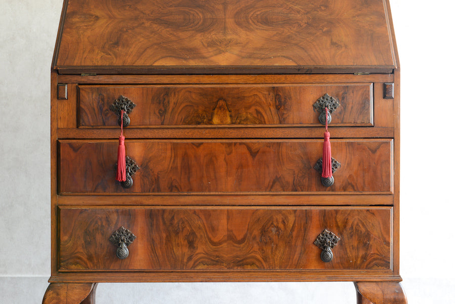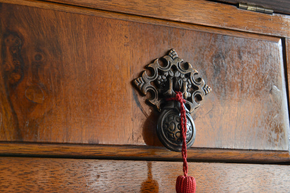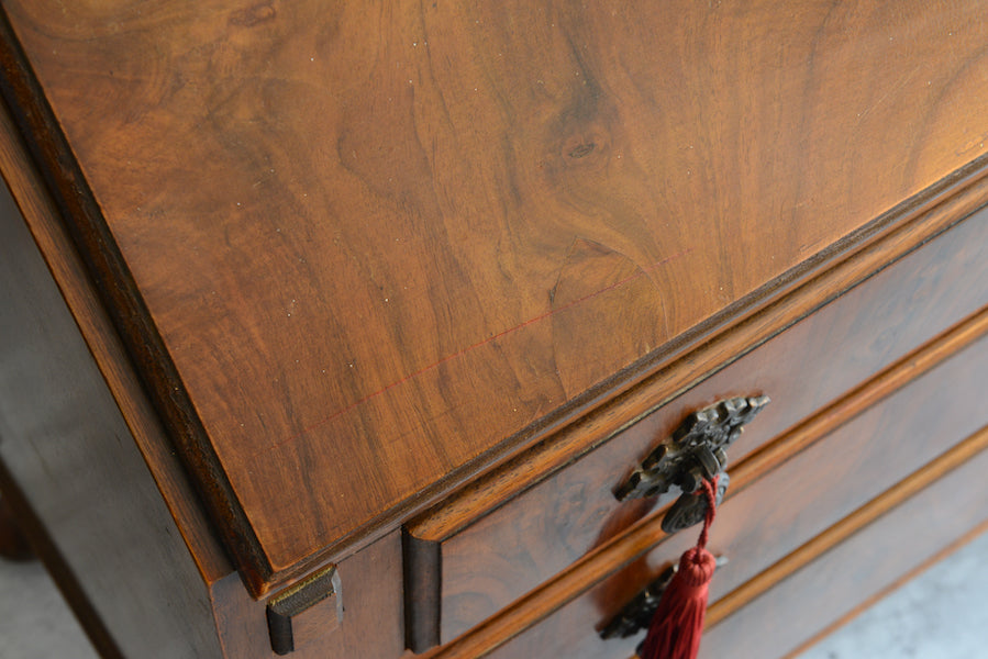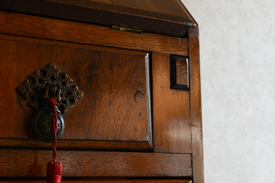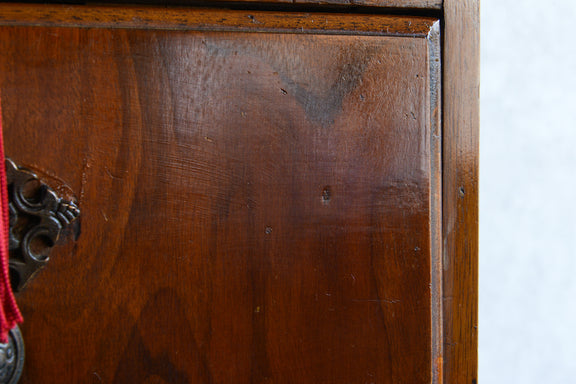 深い赤のタッセルが付いたクラシックデザインの取っ手、デスク部分のレザーの周りに雷紋が印象的なシンプルシノワズリデザイン。