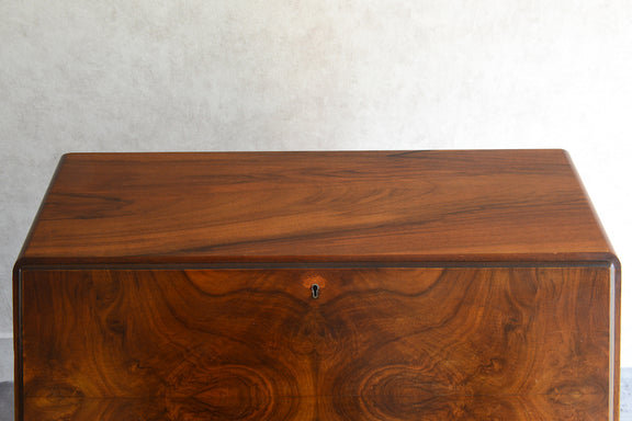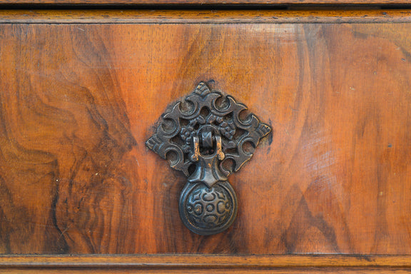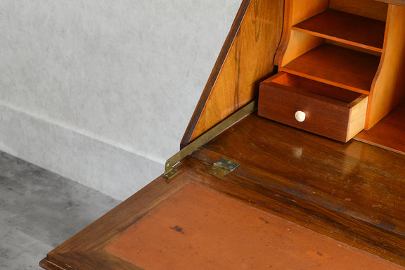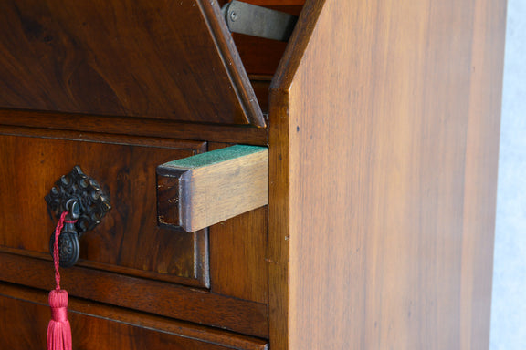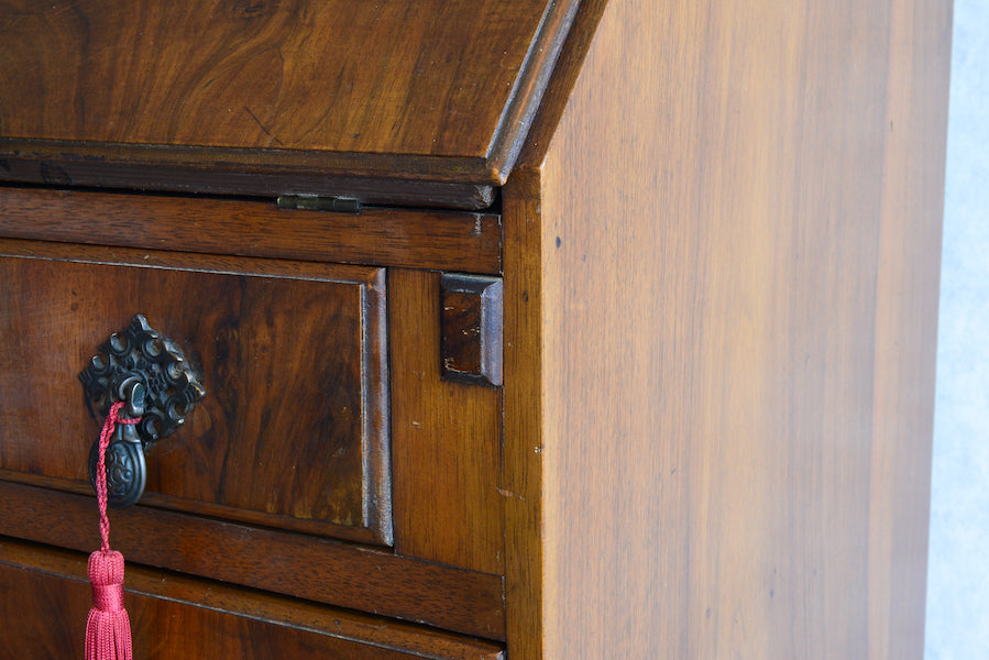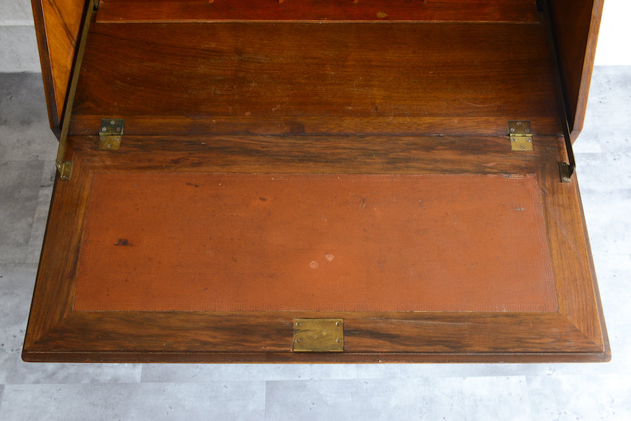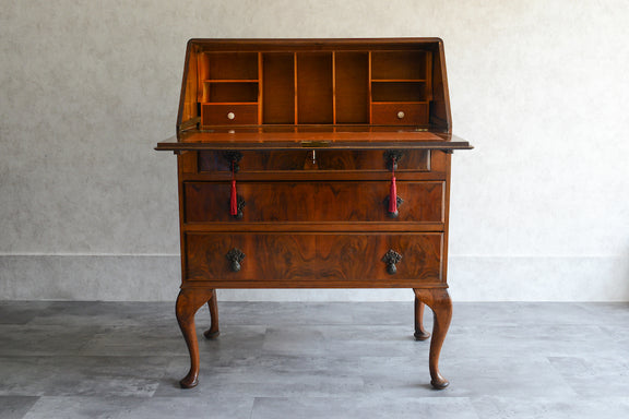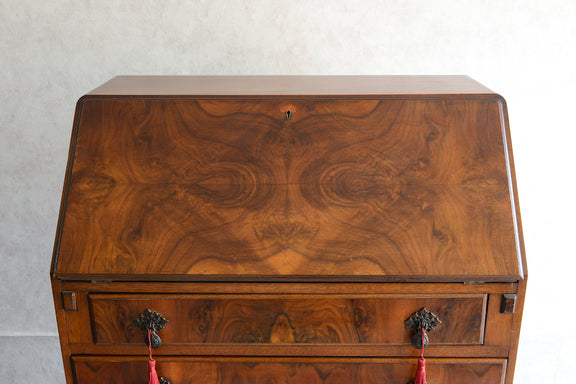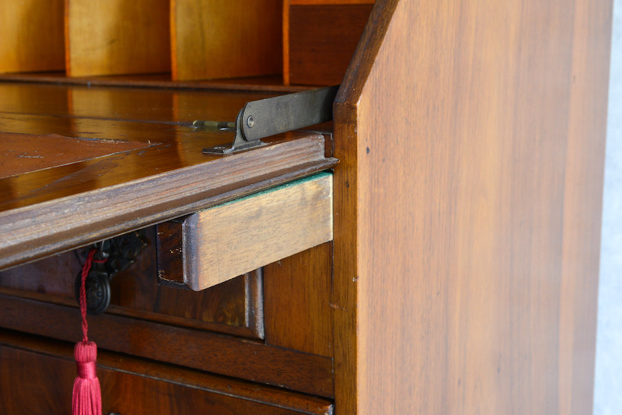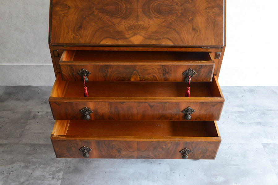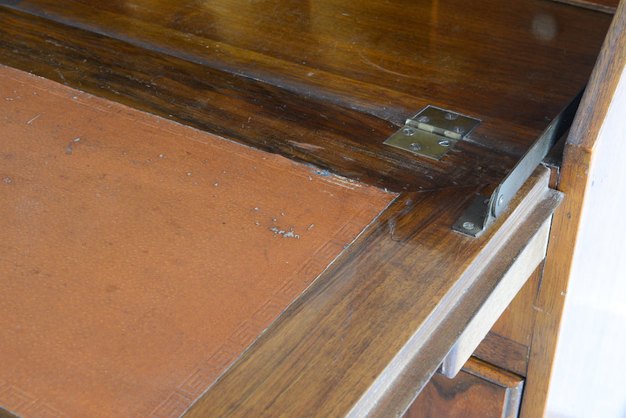 深い赤のタッセルが付いたクラシックデザインの取っ手、デスク部分のレザーの周りに雷紋が印象的なシンプルシノワズリデザイン。