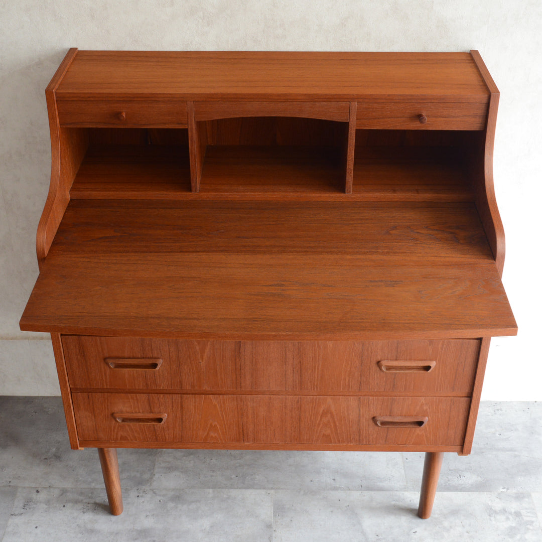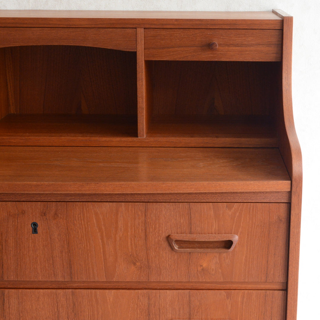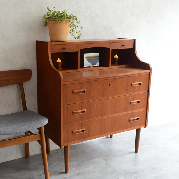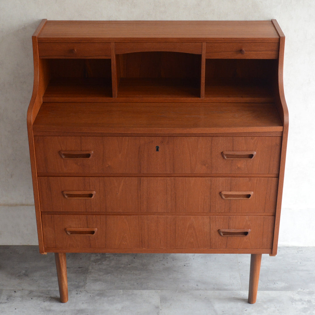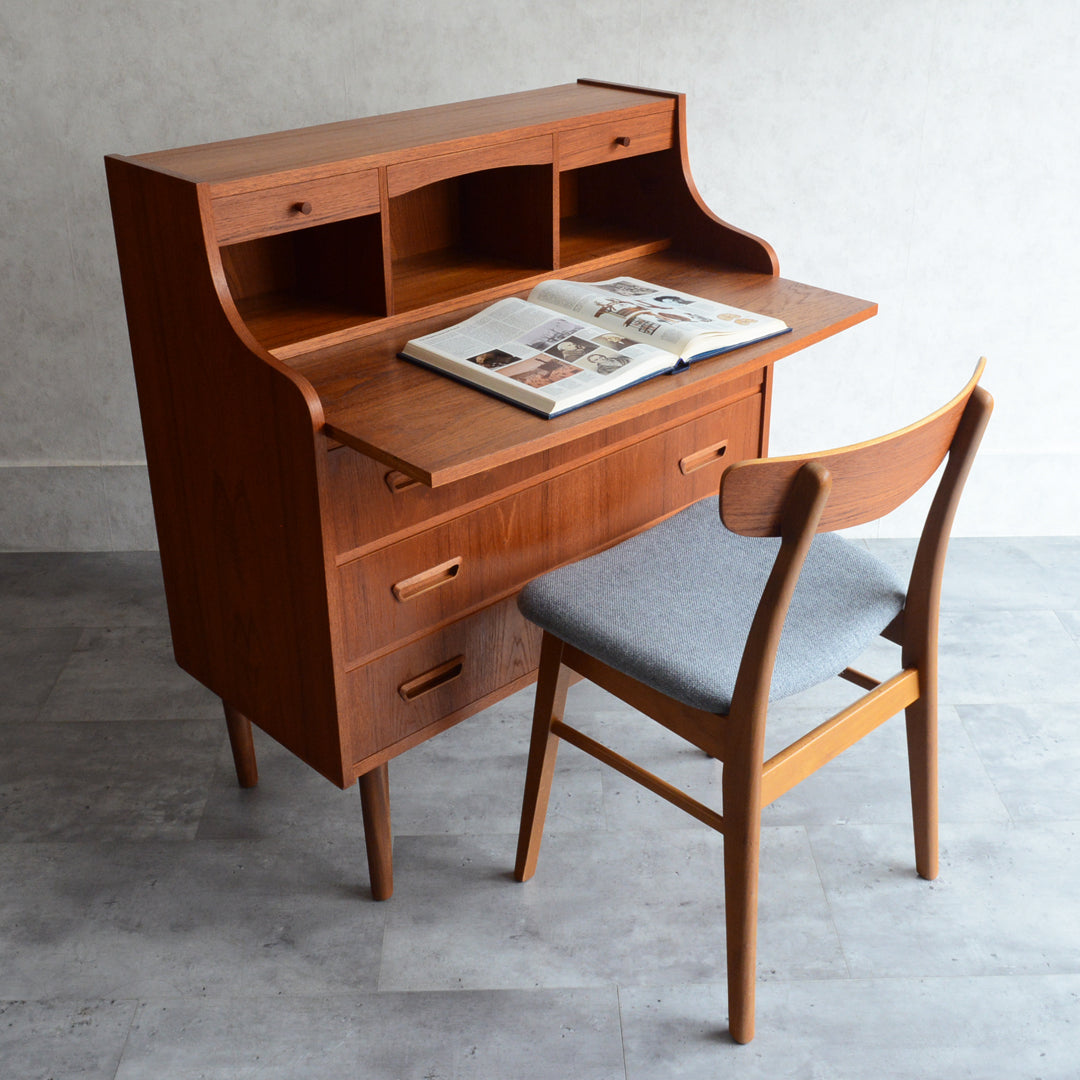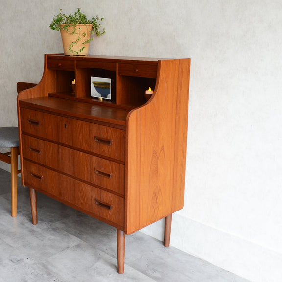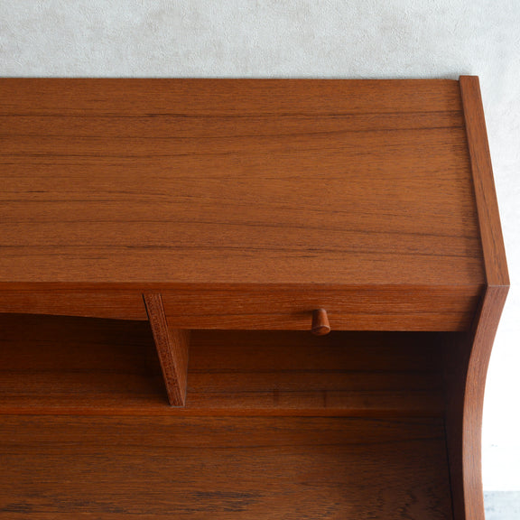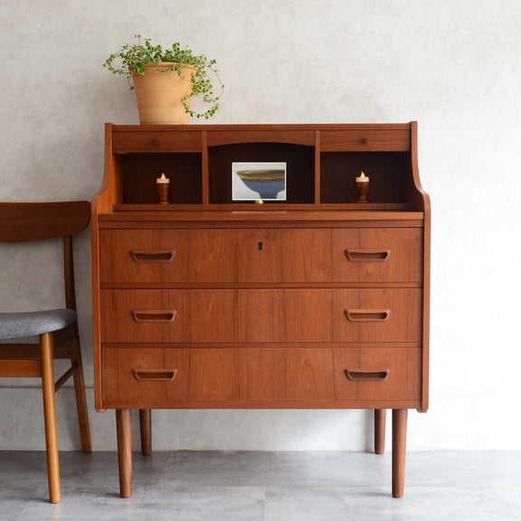 北欧のビューローは机の天板を開くのでは無く、スライド式に手前に引くタイプが多くみられます。デスクとして使用しない時間は天板を押し込んで飾り棚付きのチェストになるので、リビングでも美観を損なうこと無くお使い頂けます。