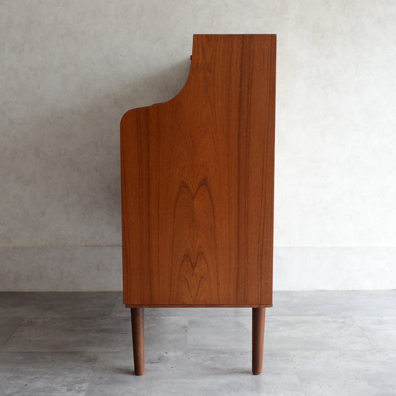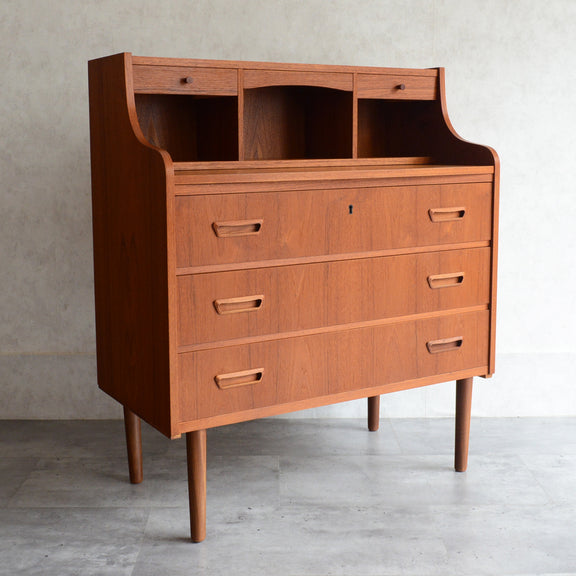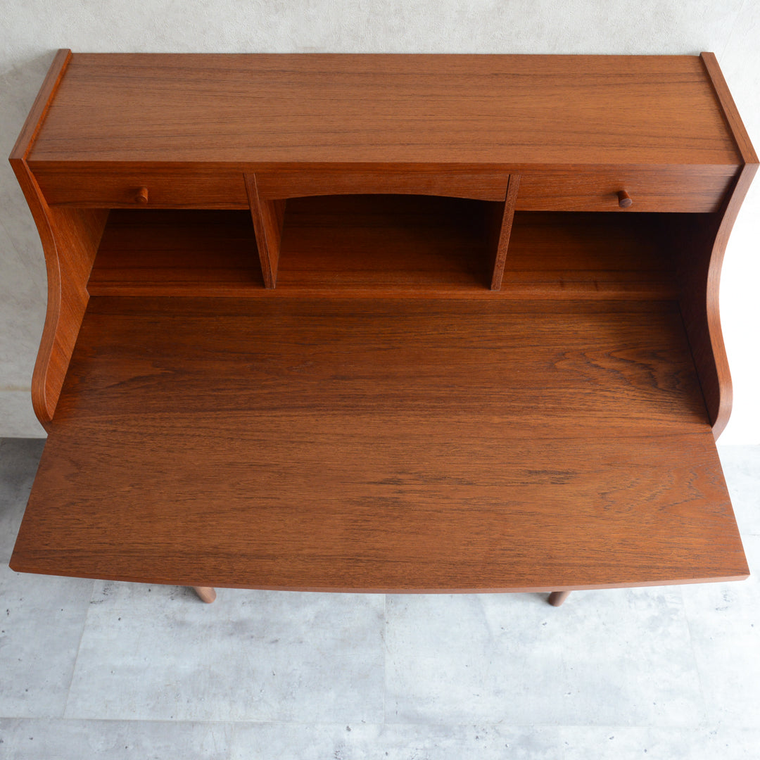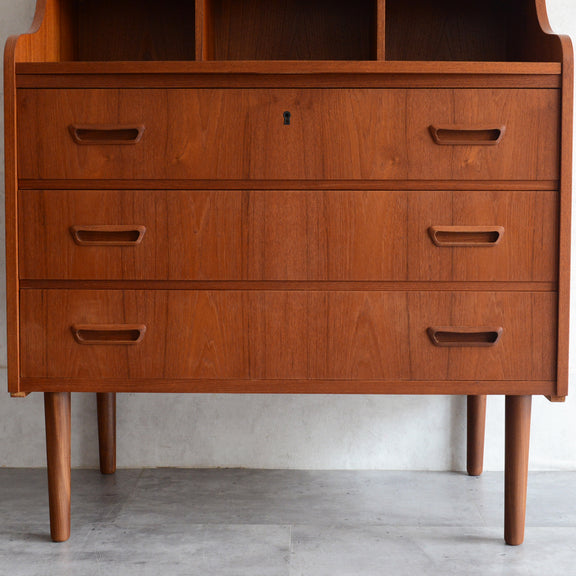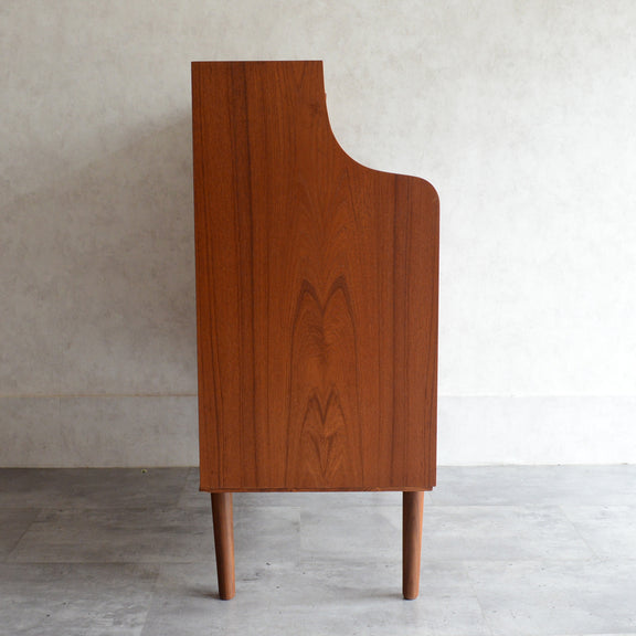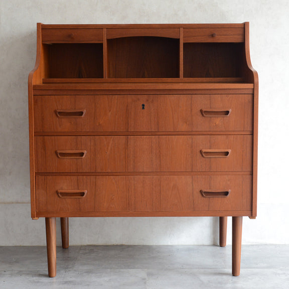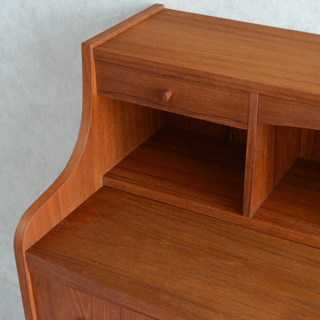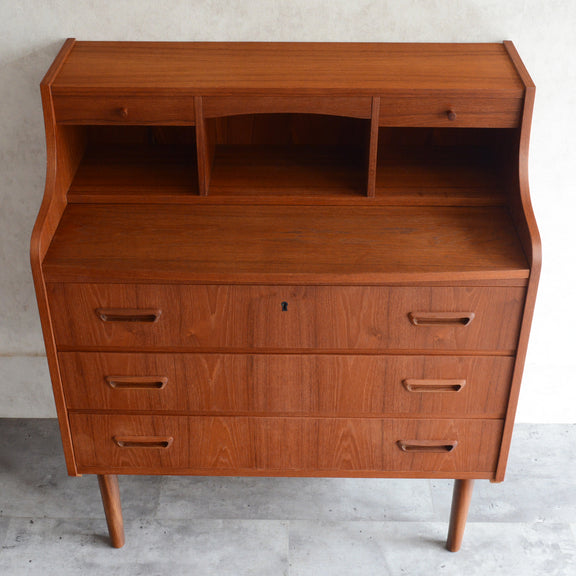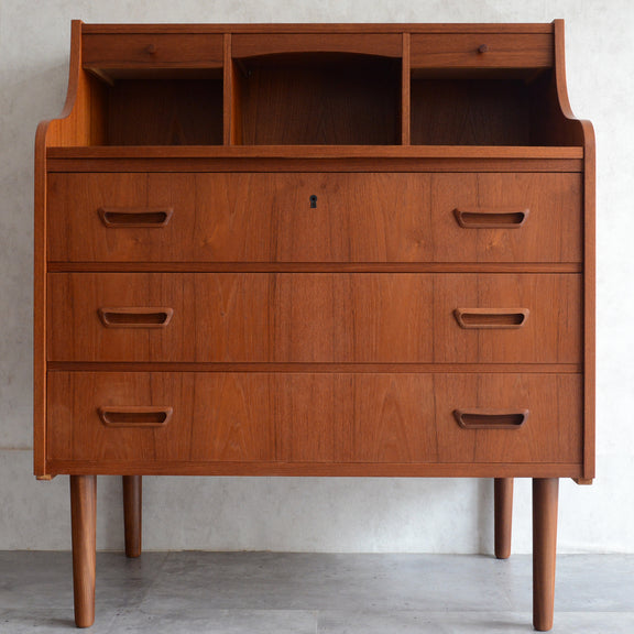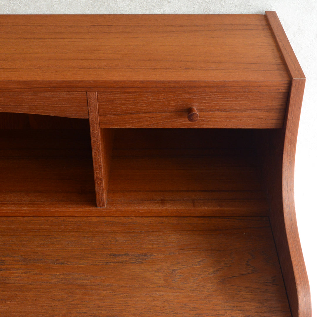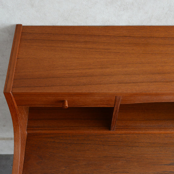 北欧のビューローは机の天板を開くのでは無く、スライド式に手前に引くタイプが多くみられます。デスクとして使用しない時間は天板を押し込んで飾り棚付きのチェストになるので、リビングでも美観を損なうこと無くお使い頂けます。