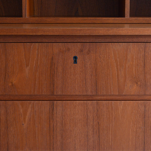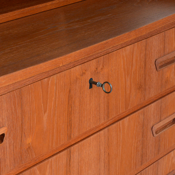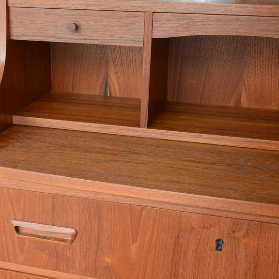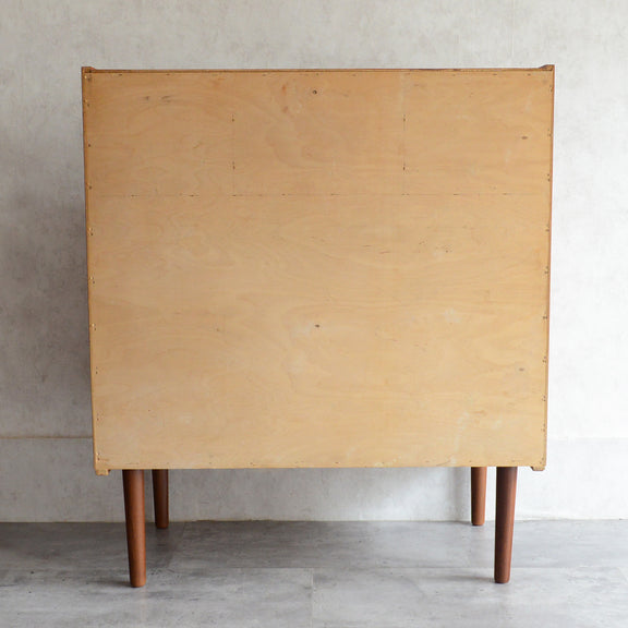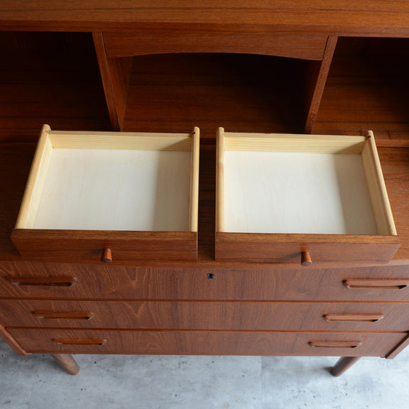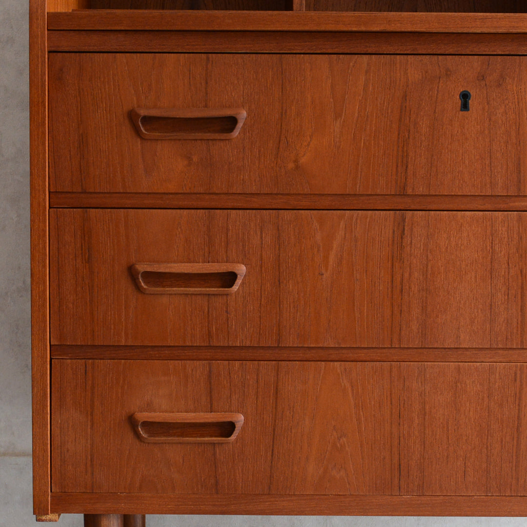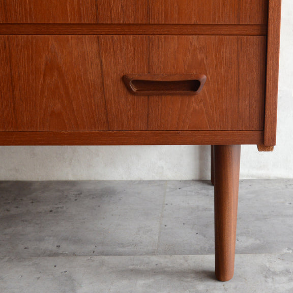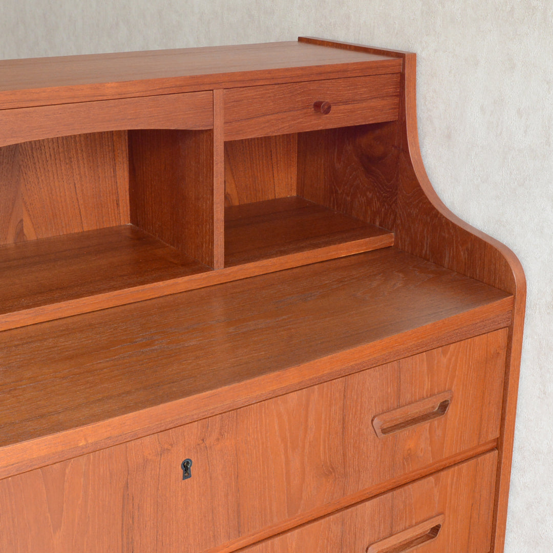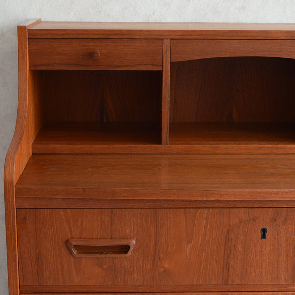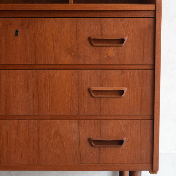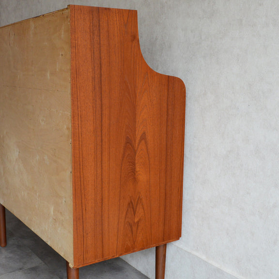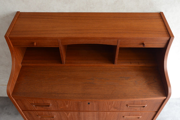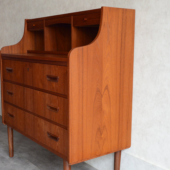 北欧のビューローは机の天板を開くのでは無く、スライド式に手前に引くタイプが多くみられます。デスクとして使用しない時間は天板を押し込んで飾り棚付きのチェストになるので、リビングでも美観を損なうこと無くお使い頂けます。