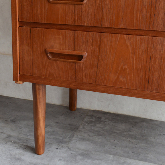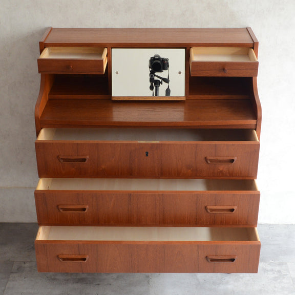 また、上段の中央小抽斗のように見える部分を下に倒すと、ミラーとなっておりドレッサーの役割も担っています。(ミラーは新品に交換済)