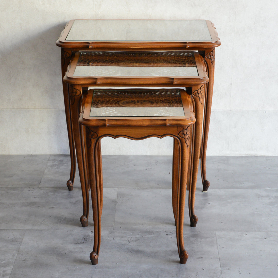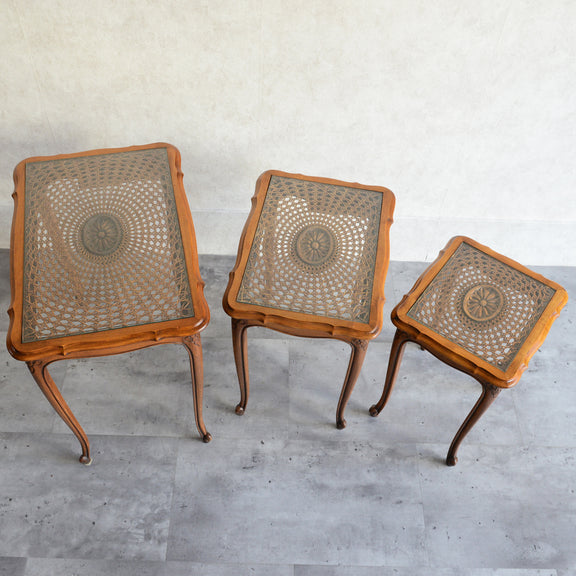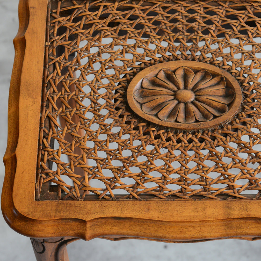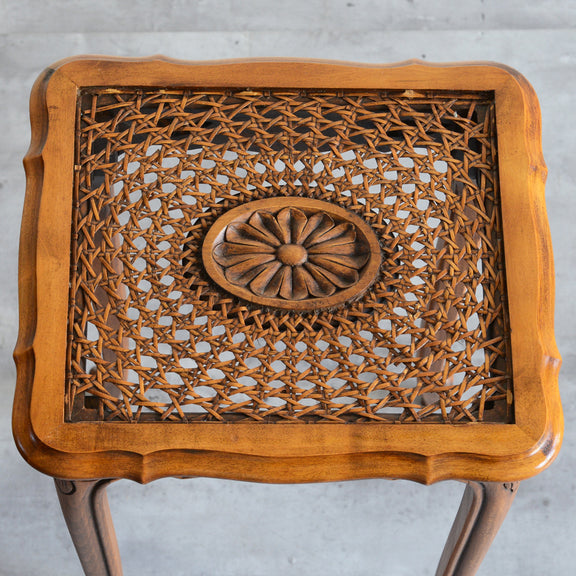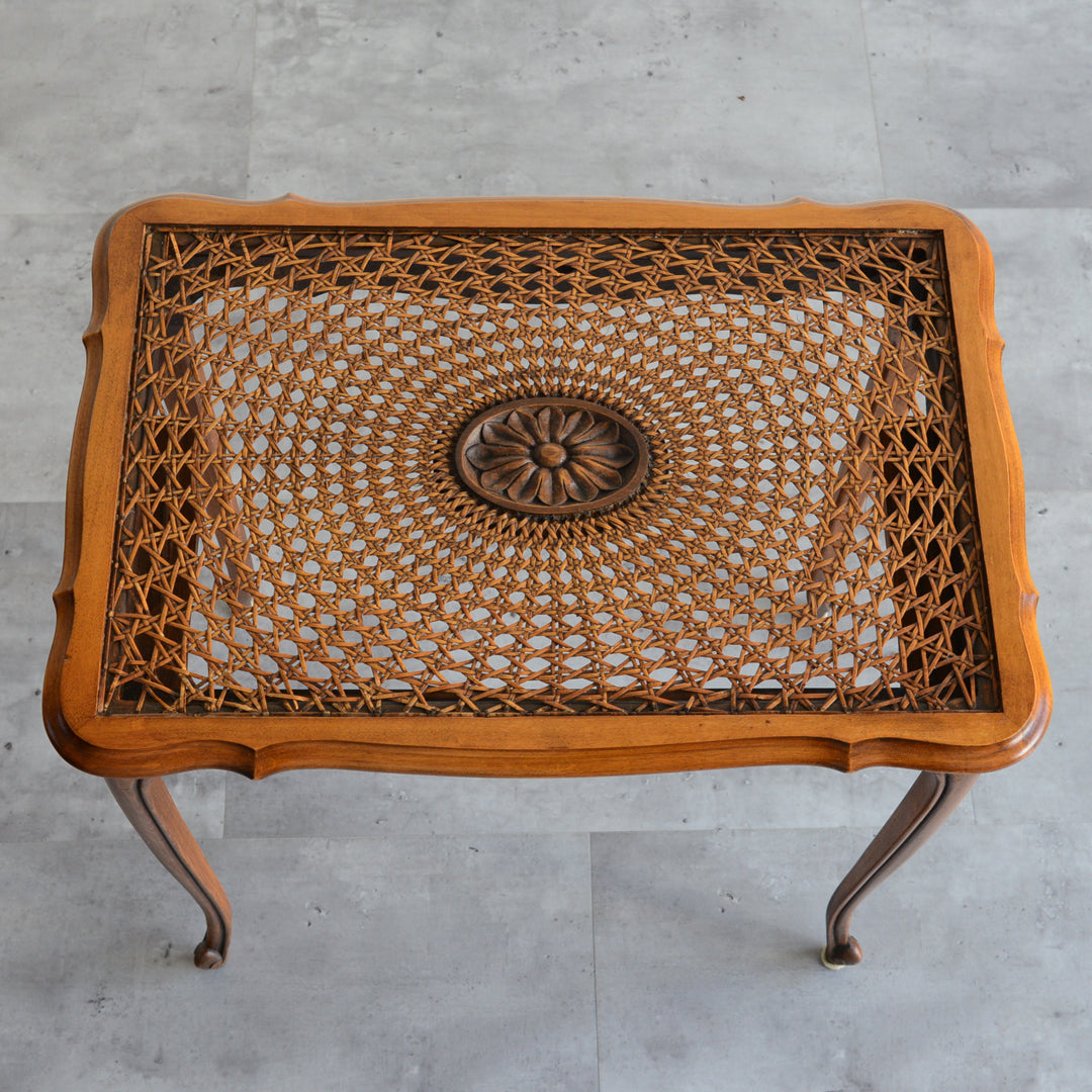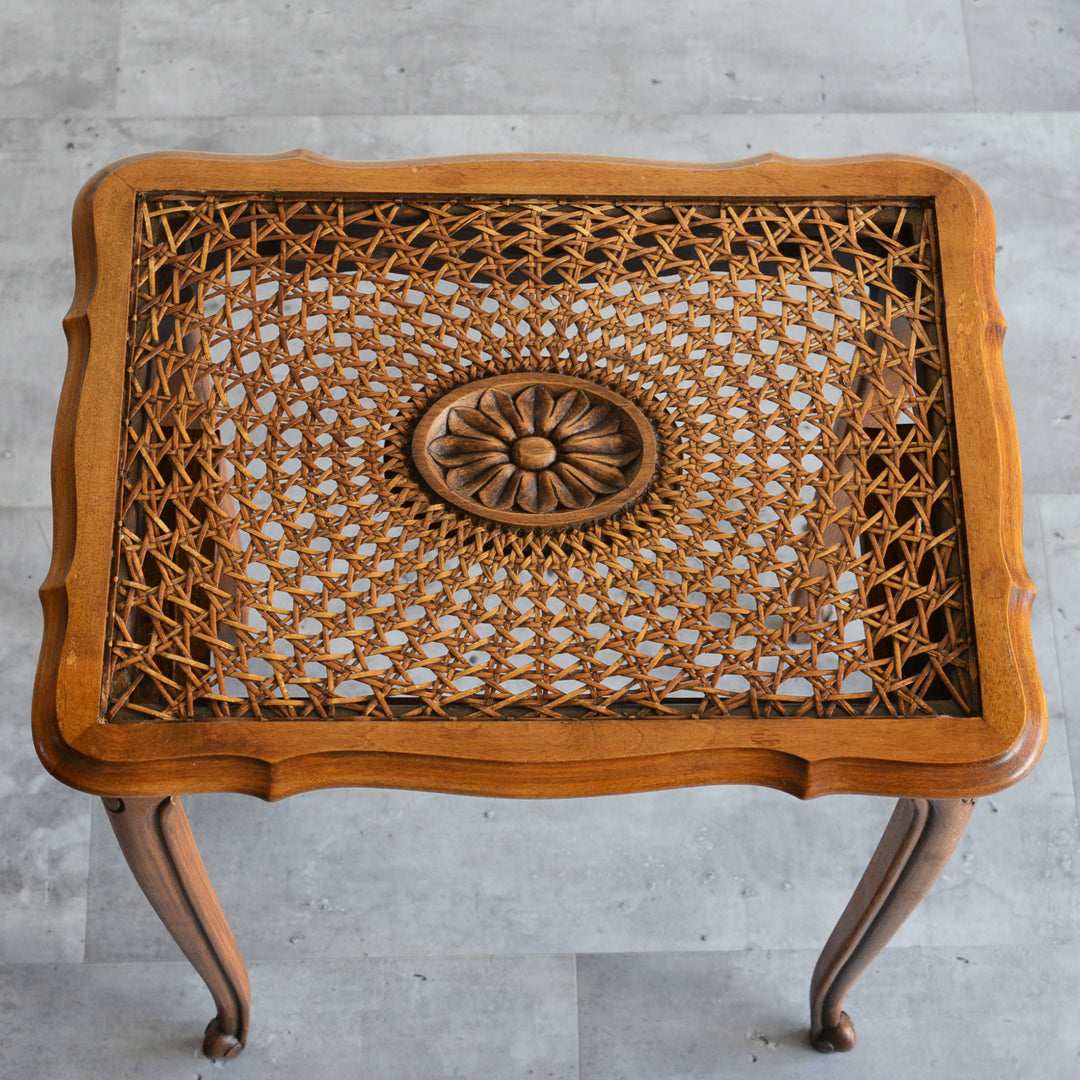 木彫の花とラタンの天板が、珍しいネストテーブルです。