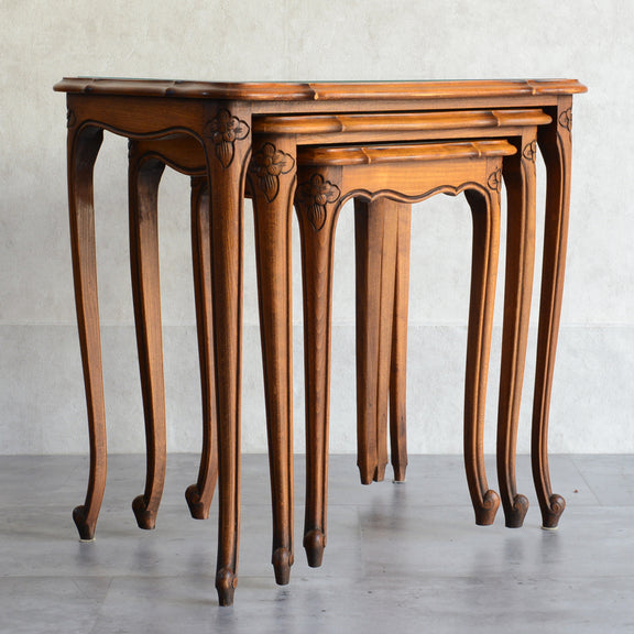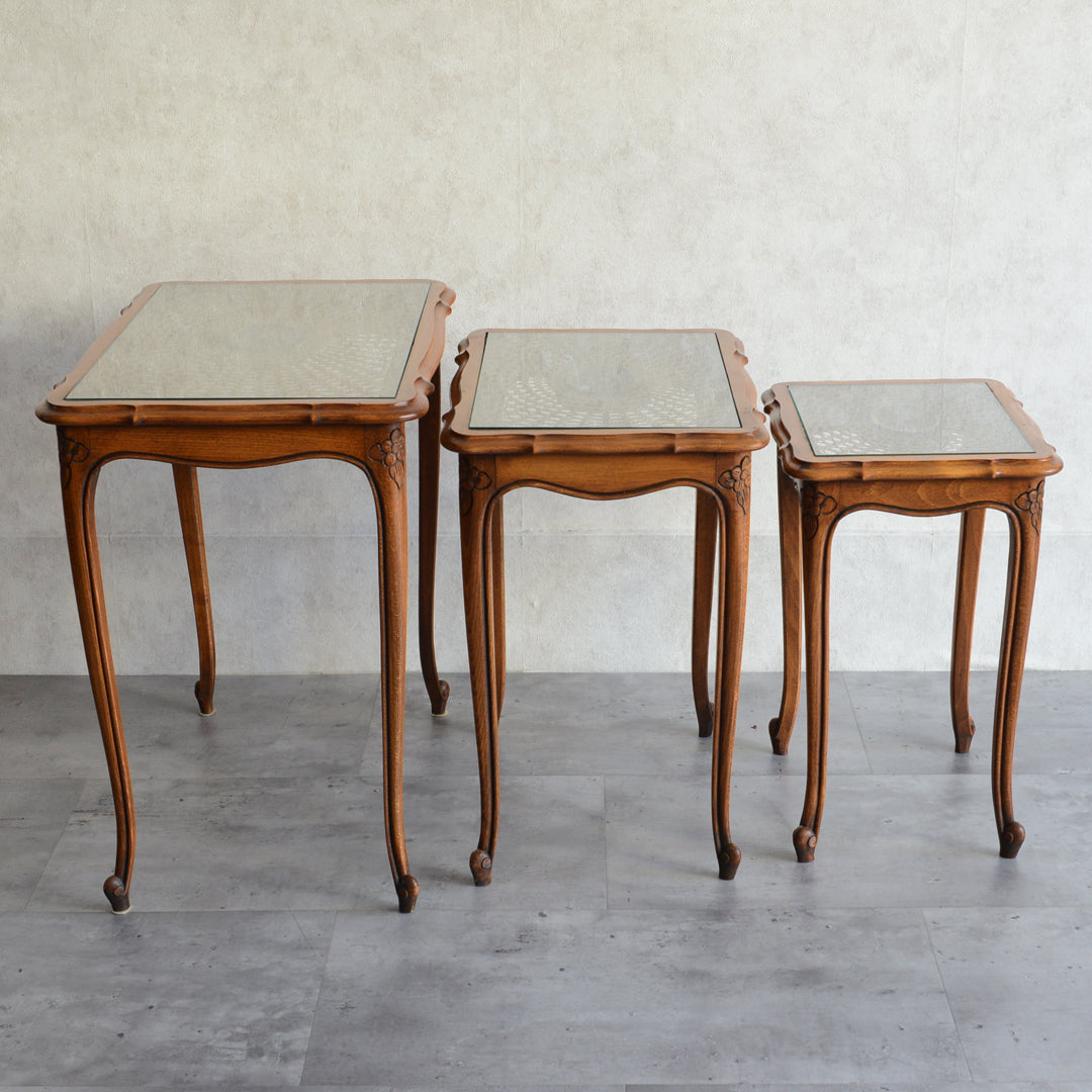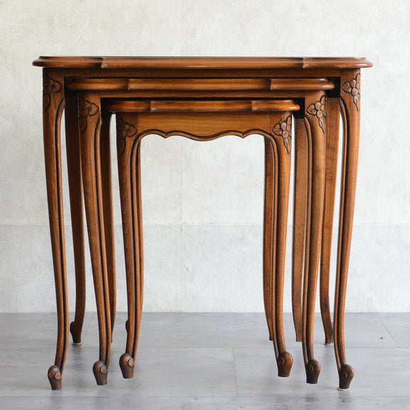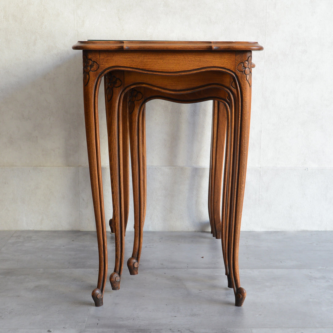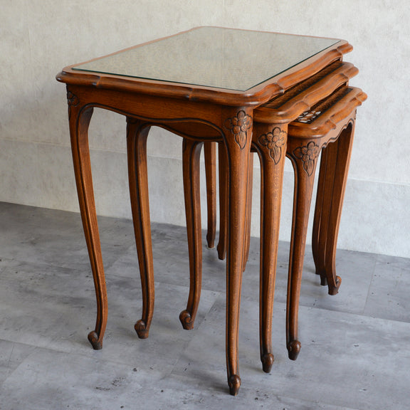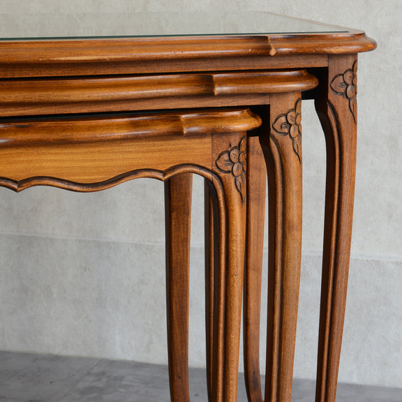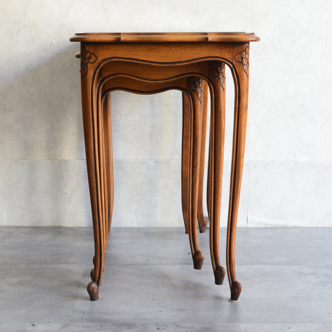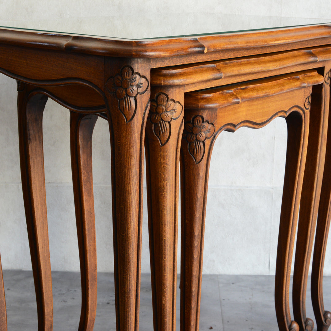 木彫の花とラタンの天板が、珍しいネストテーブルです。