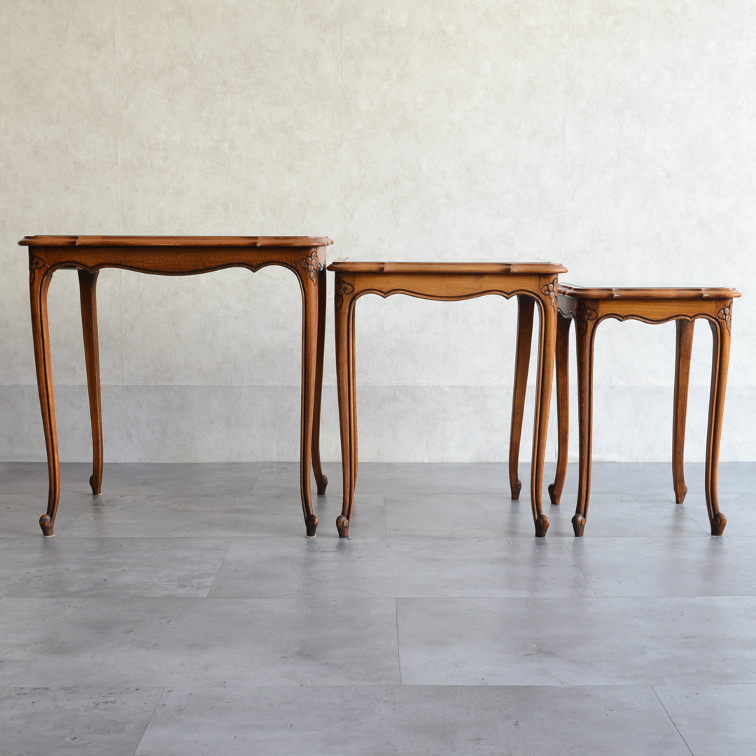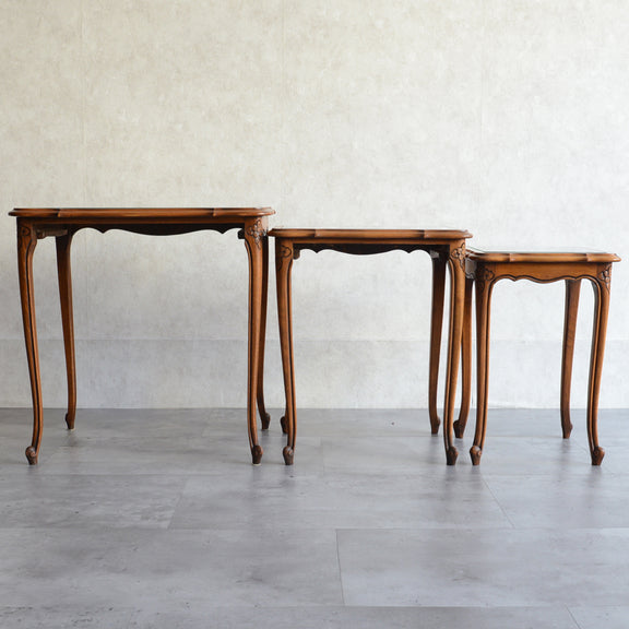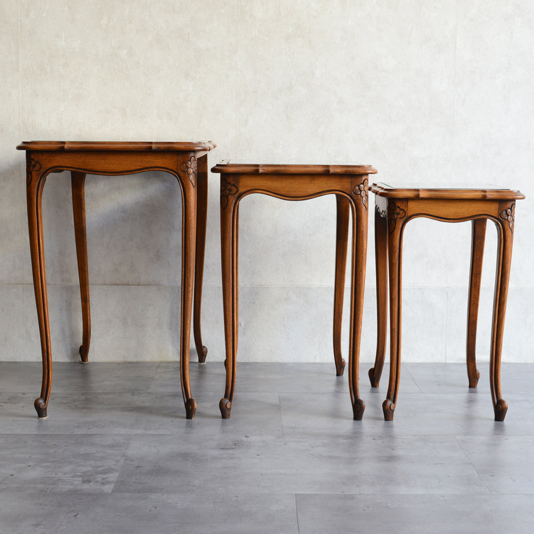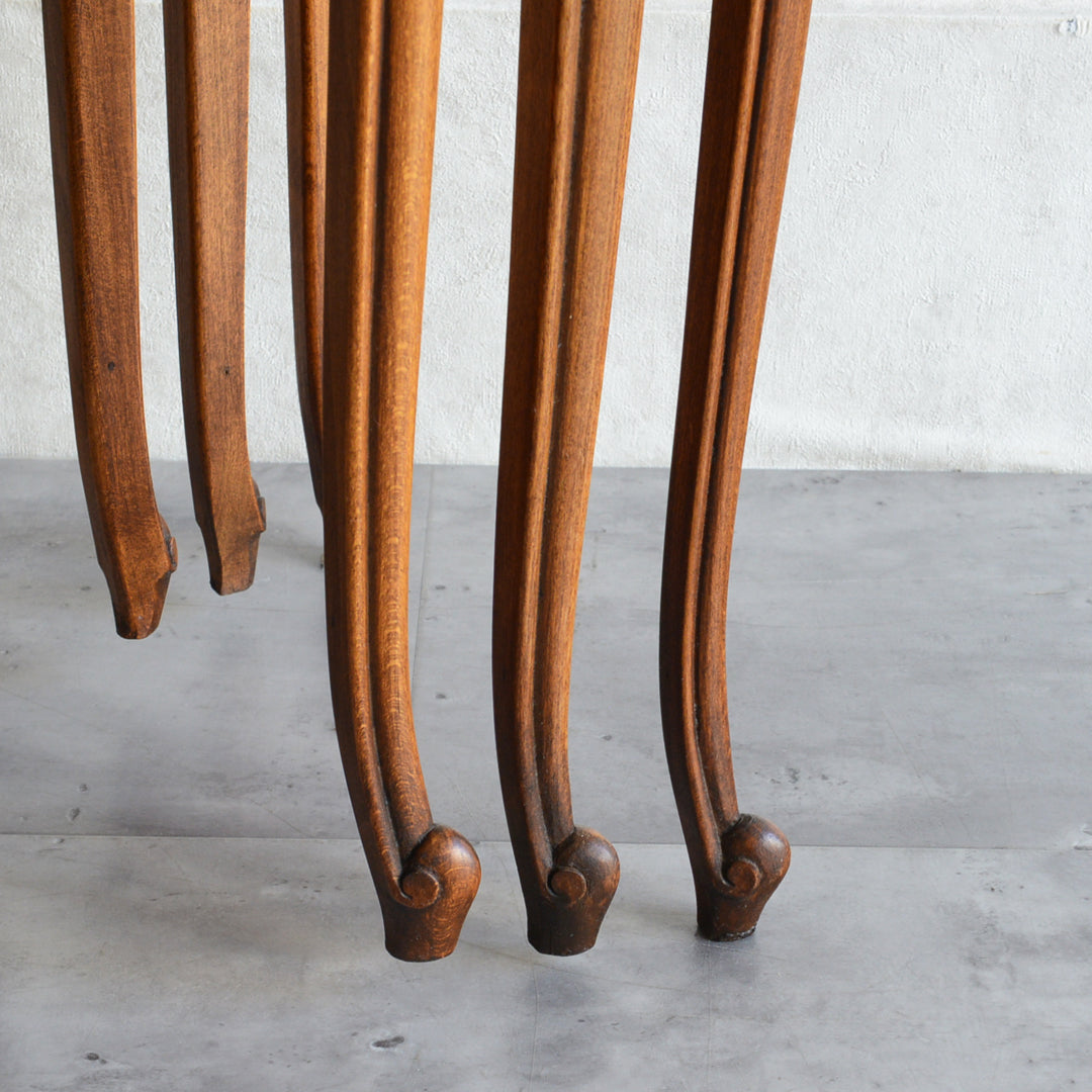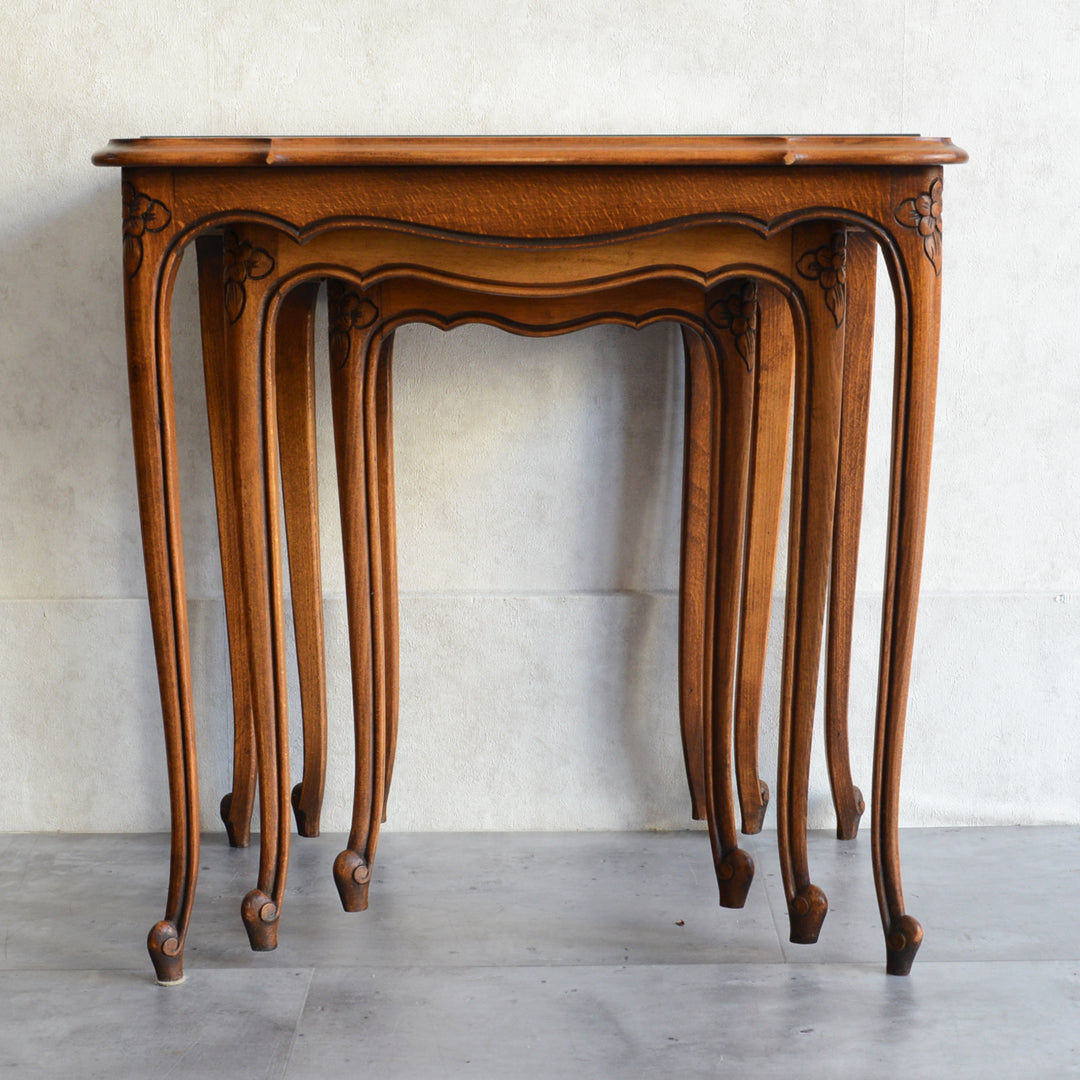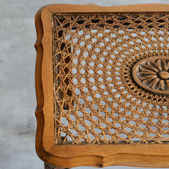 木彫の花とラタンの天板が、珍しいネストテーブルです。