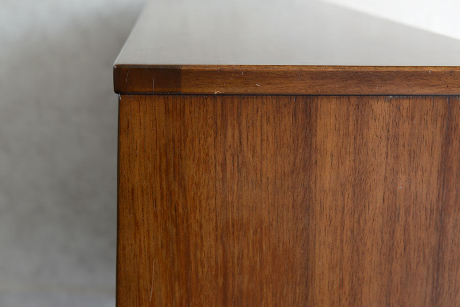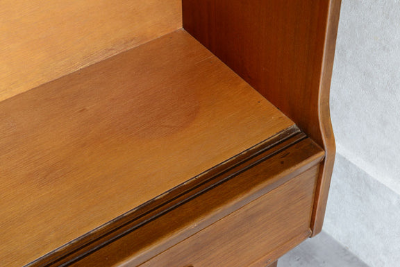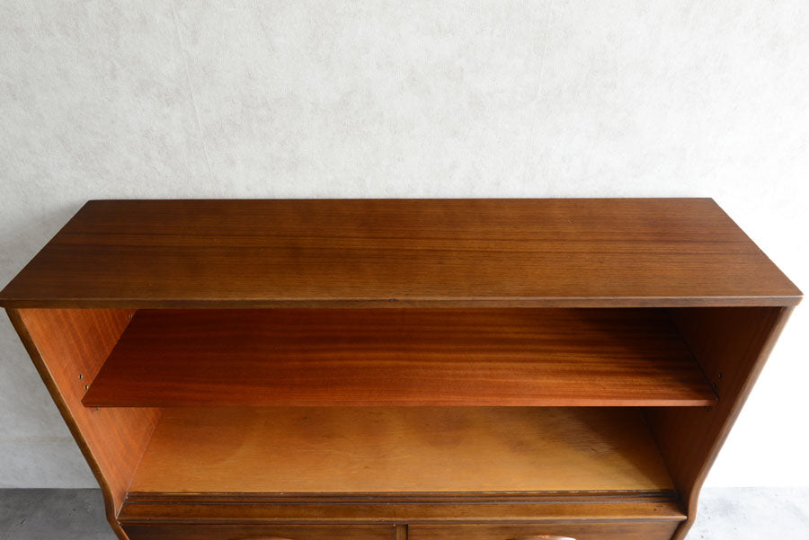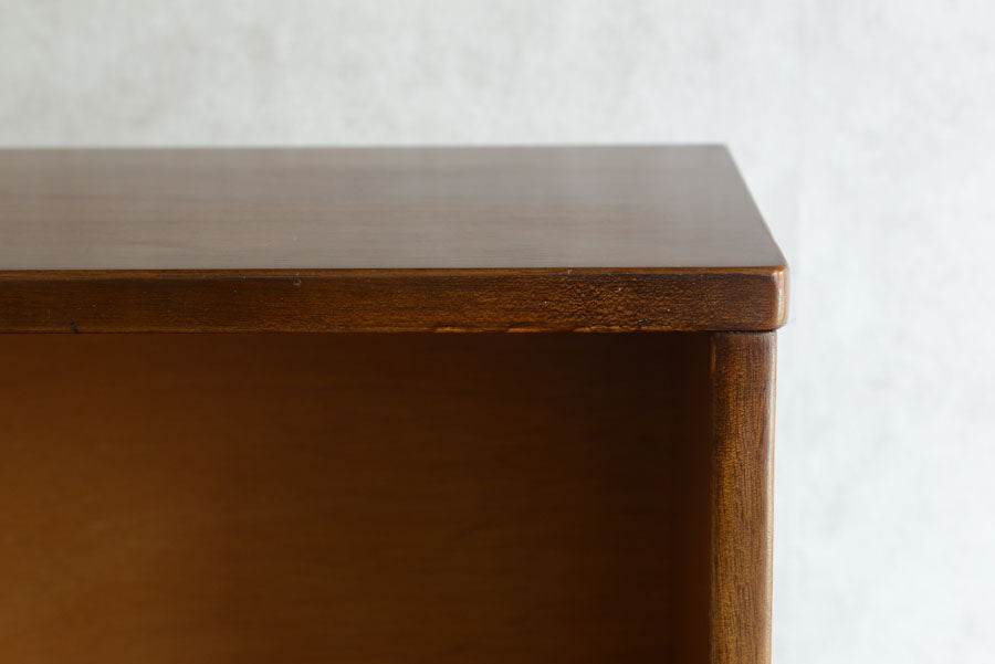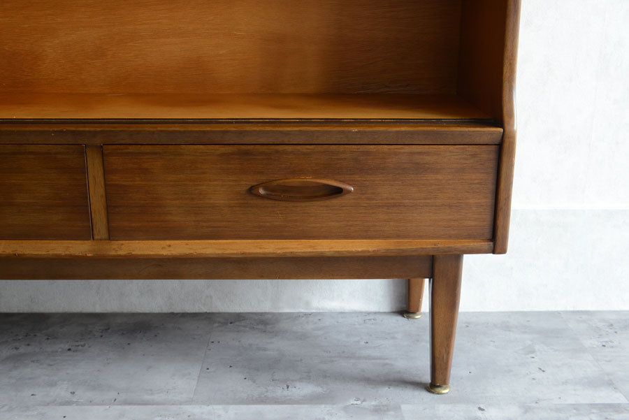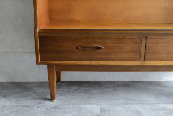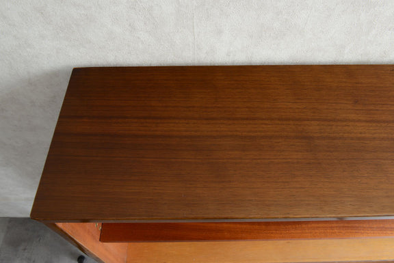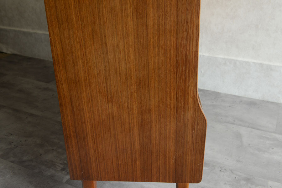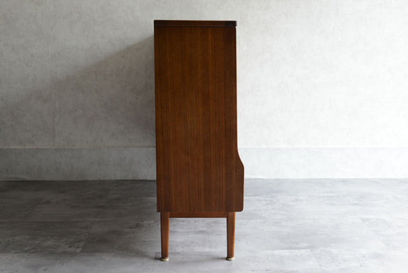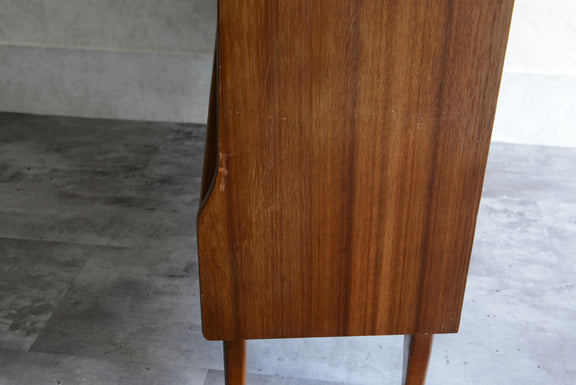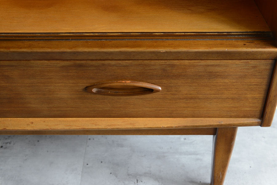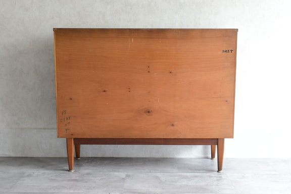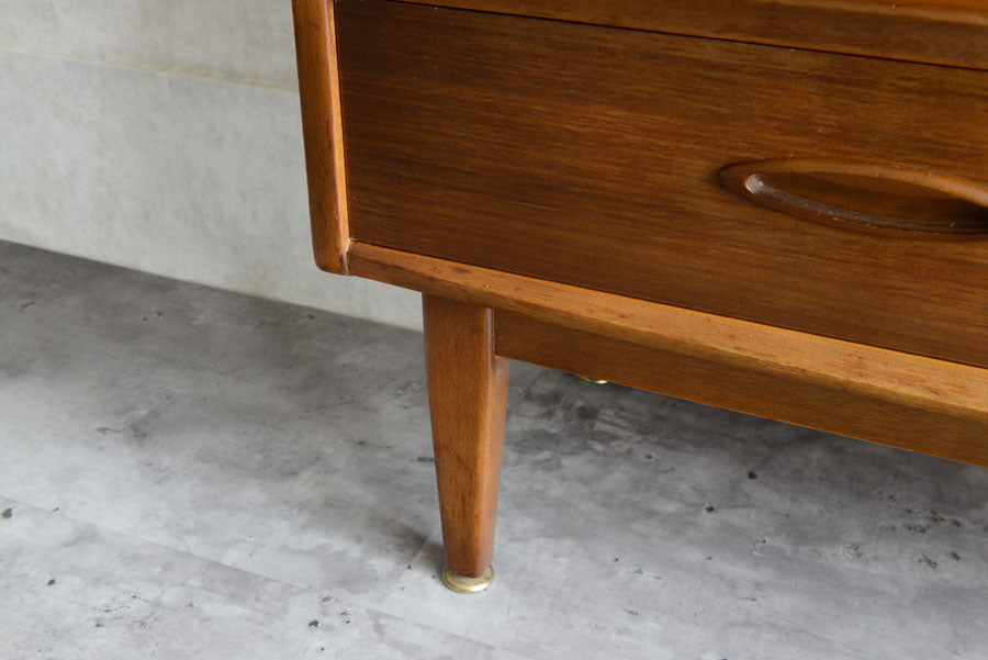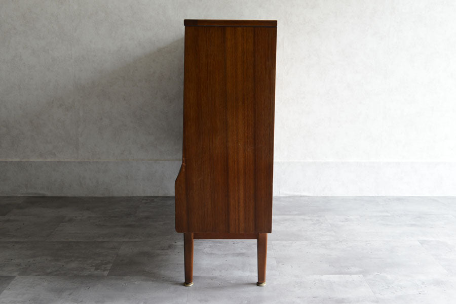 ジェンティーク独特の葉っぱの様な引き出しの取手と、金属が付いた脚部がミッドセンチュリーらしいコンパクトなキャビネット
