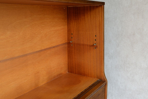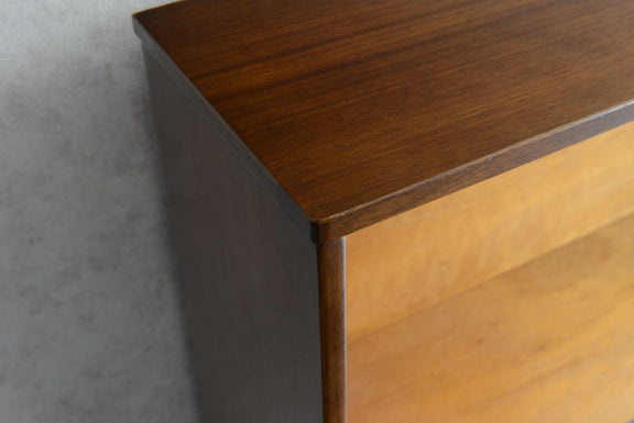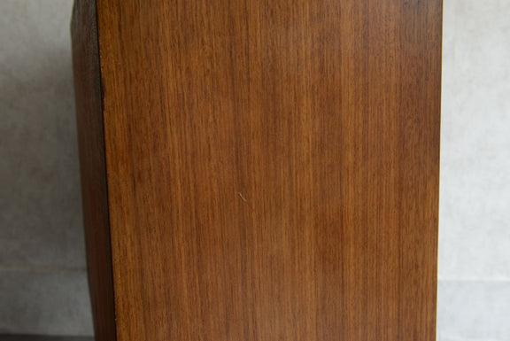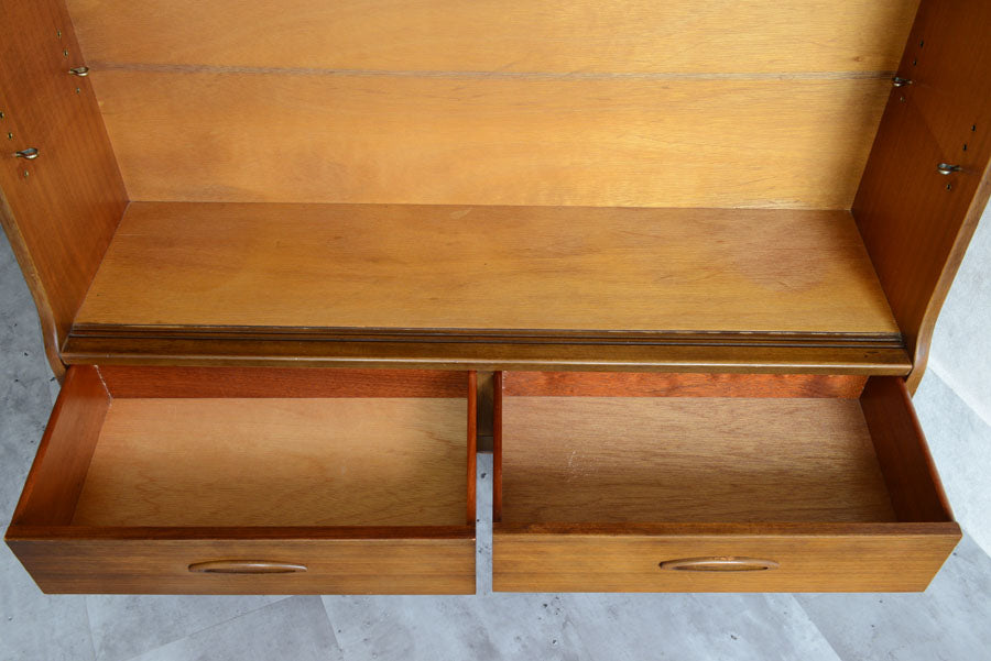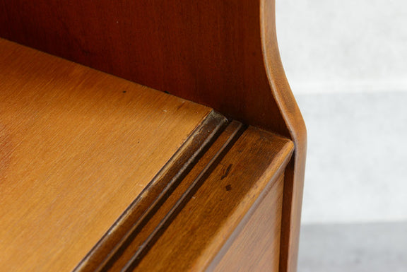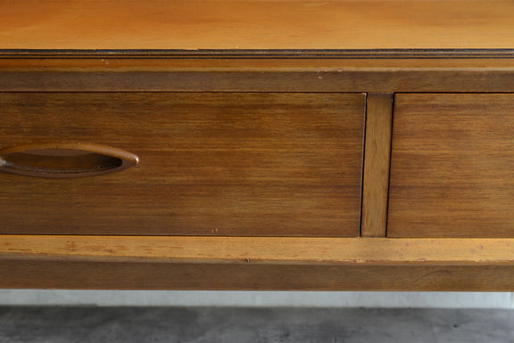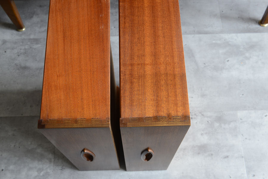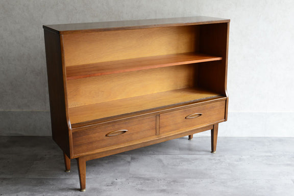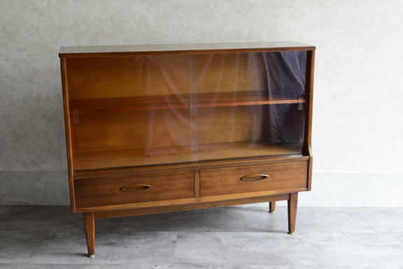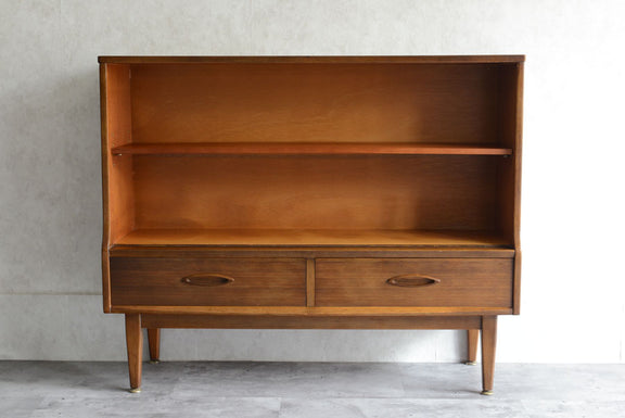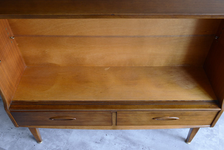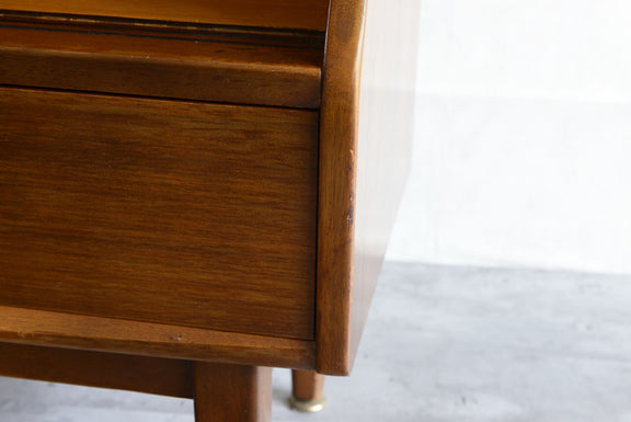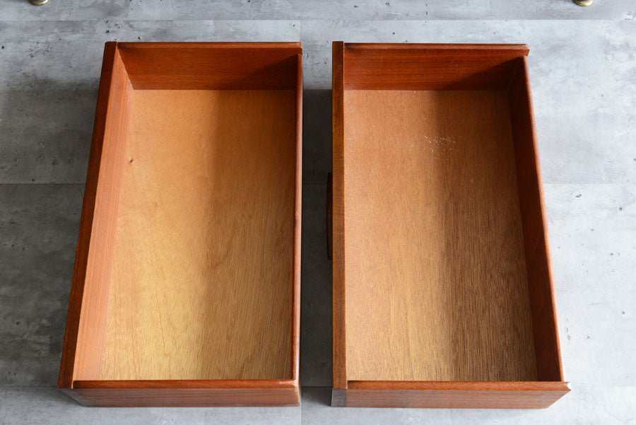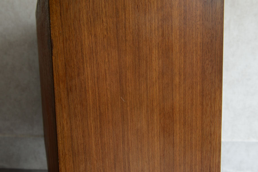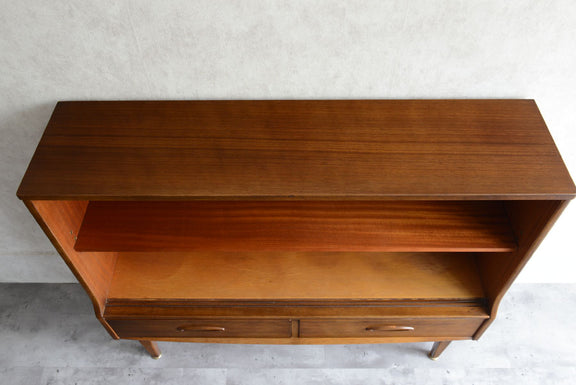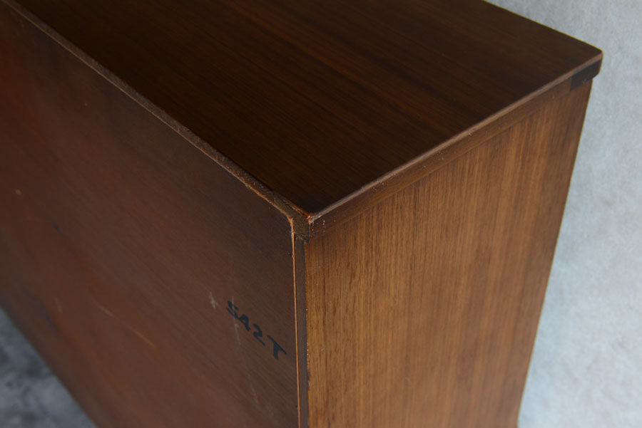 ジェンティーク独特の葉っぱの様な引き出しの取手と、金属が付いた脚部がミッドセンチュリーらしいコンパクトなキャビネット