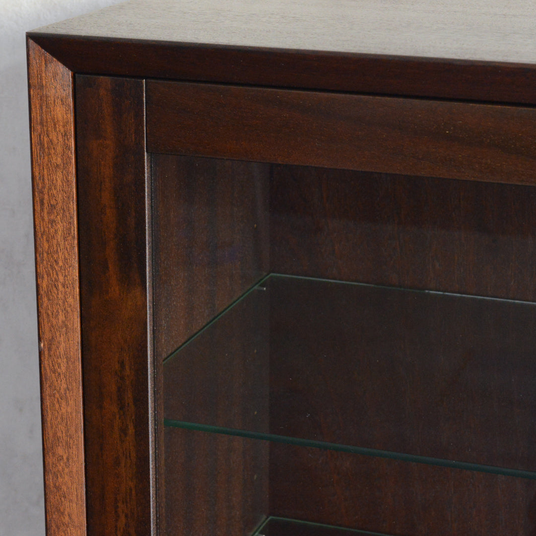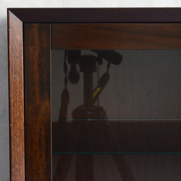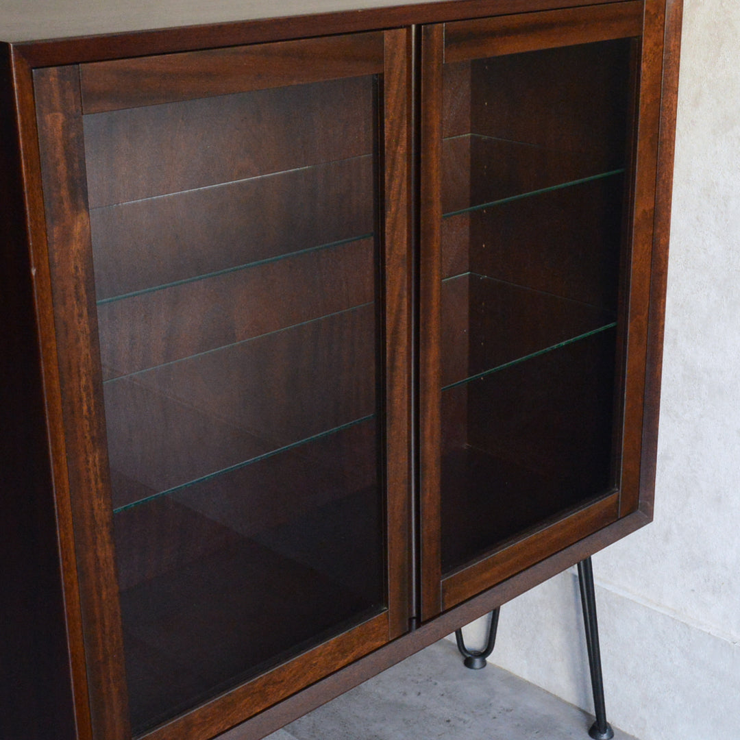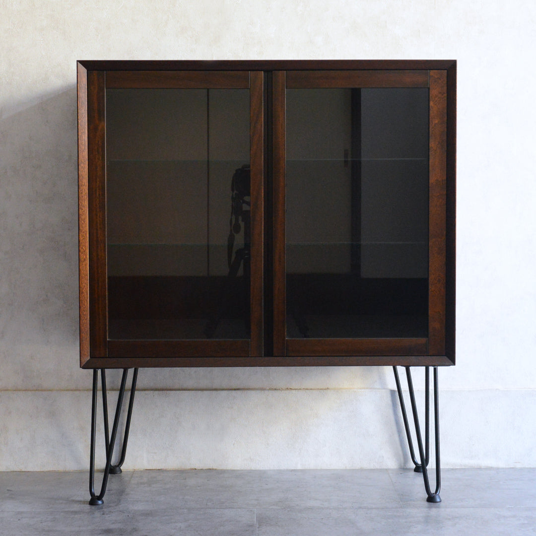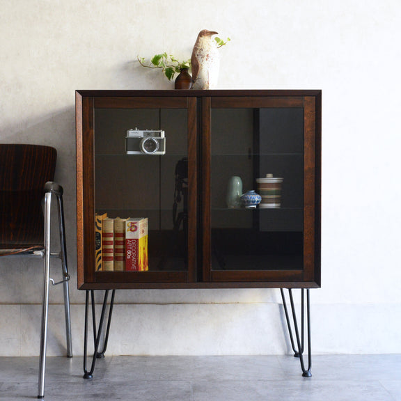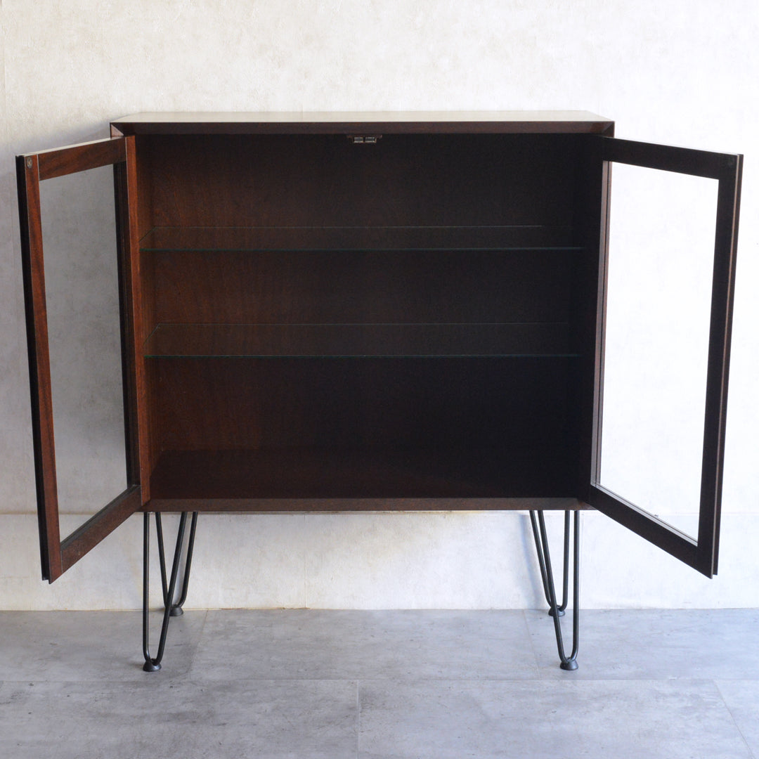 カスタムでアイアンレッグが加えられ、モダンな佇まいとなったシンプルなガラスキャビネット