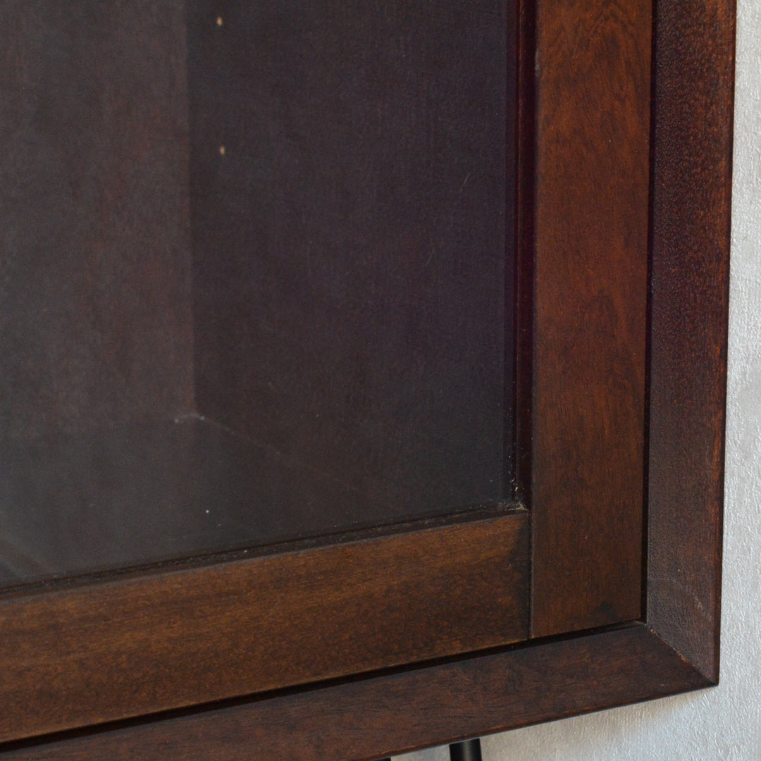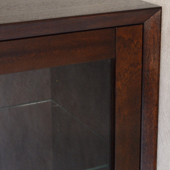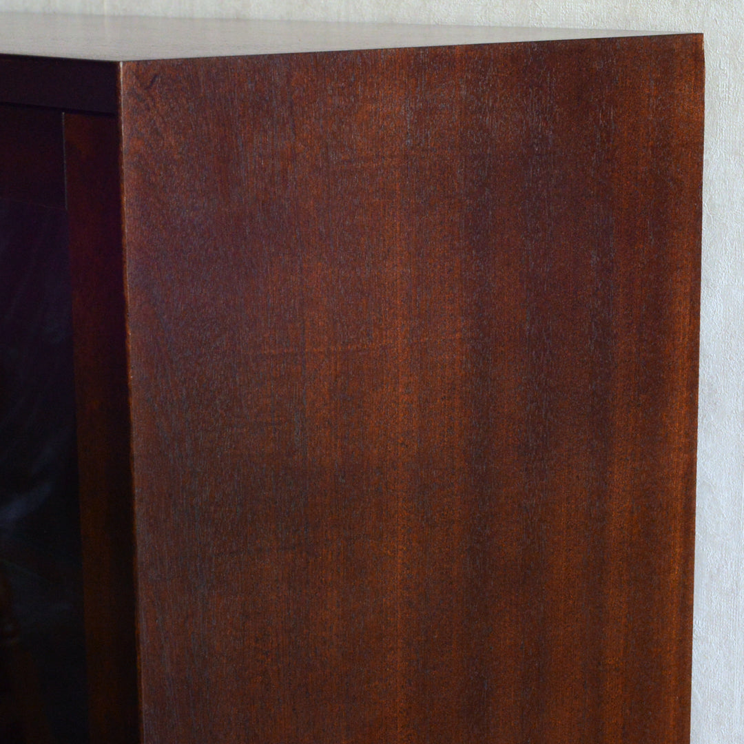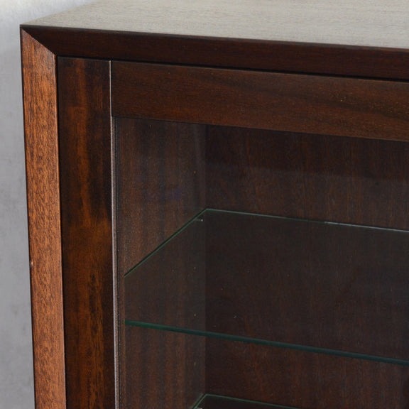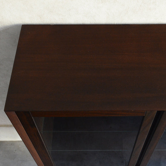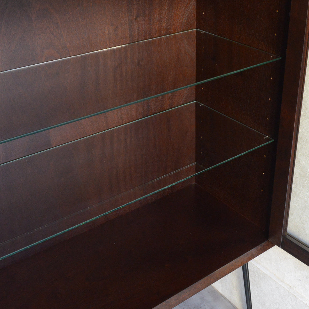 カスタムでアイアンレッグが加えられ、モダンな佇まいとなったシンプルなガラスキャビネット