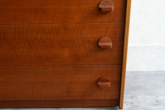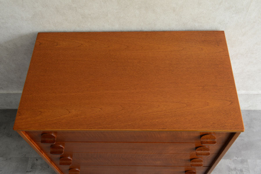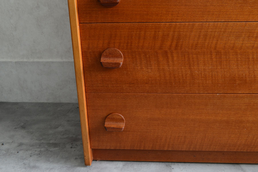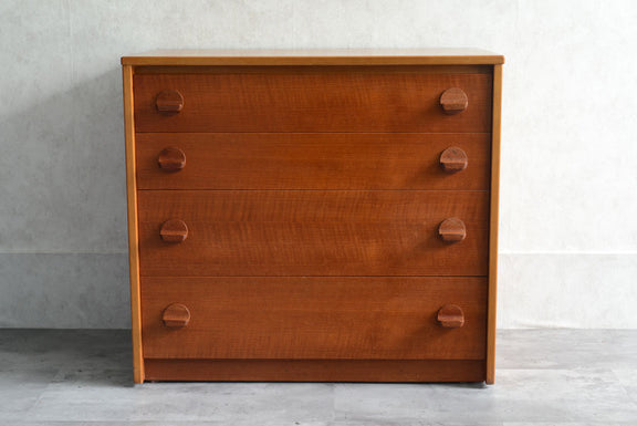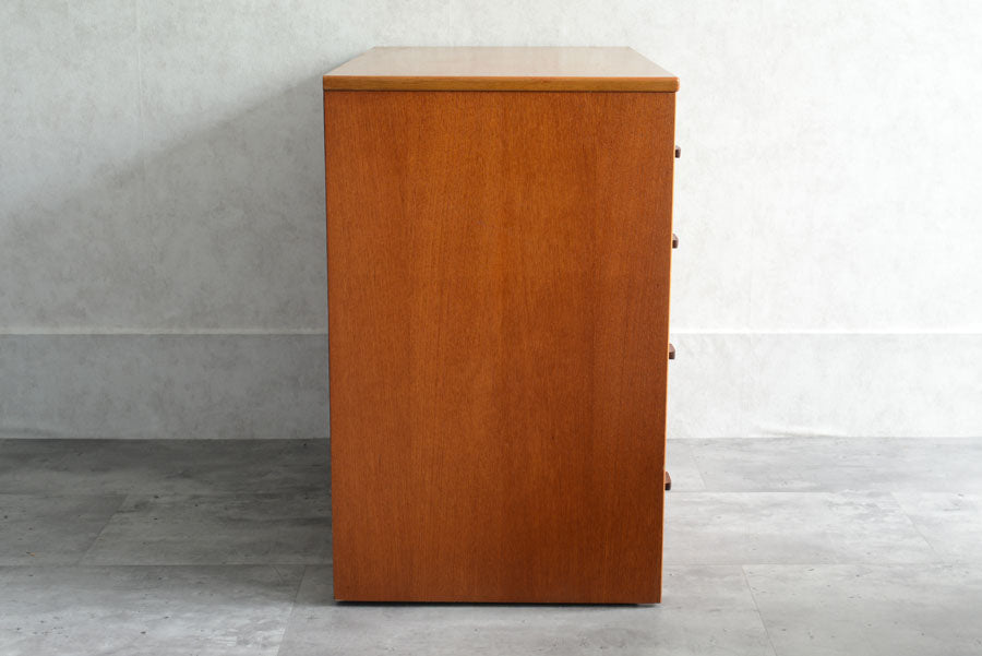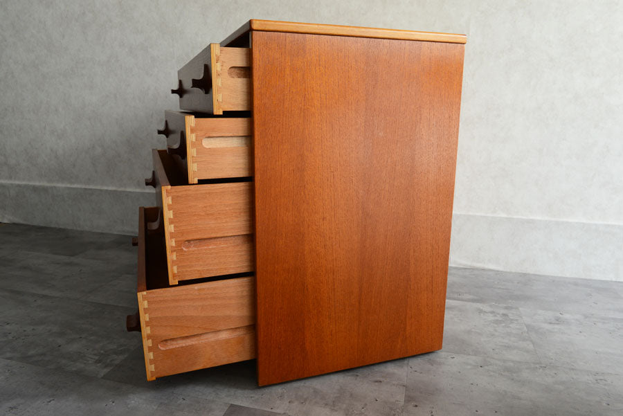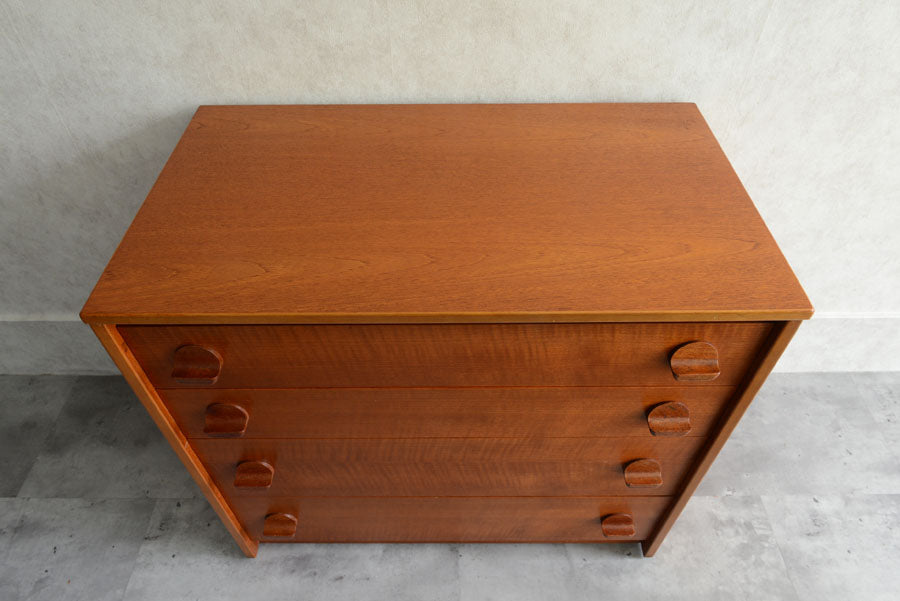 引き出しの取っ手がチークを彫り出したSTAGらしいデザインの4段チェスト。チークの杢目が美しい直線的でシンプルなデザインです。
