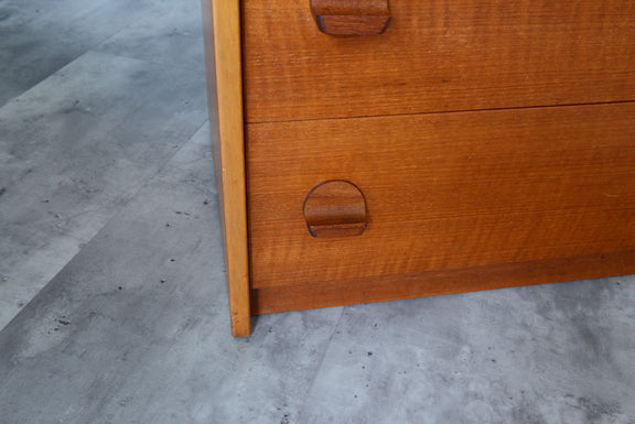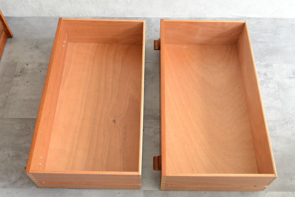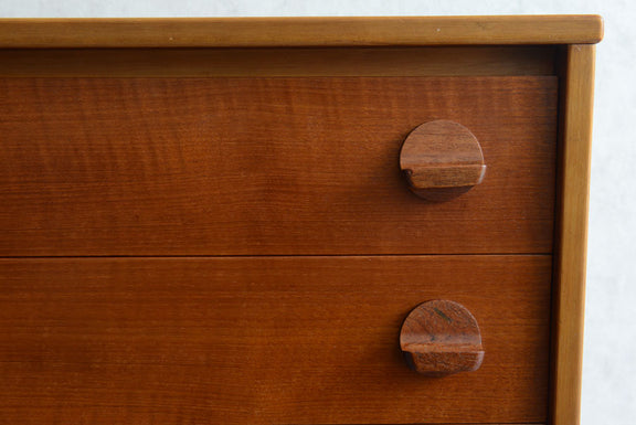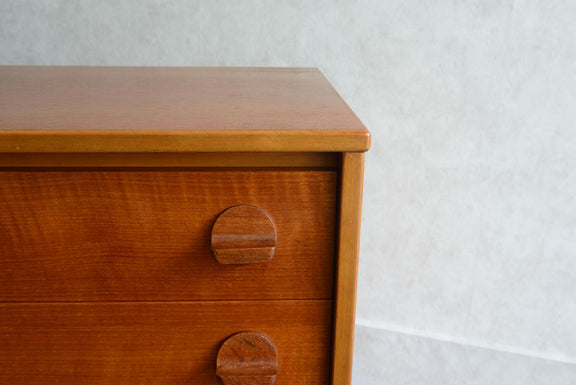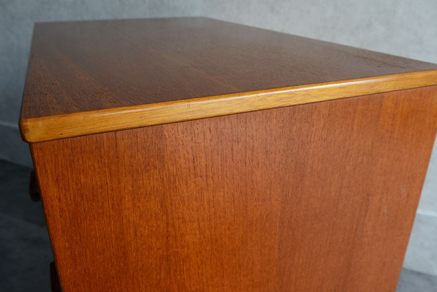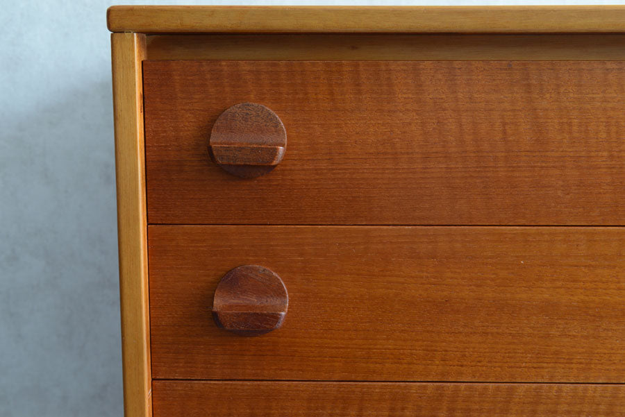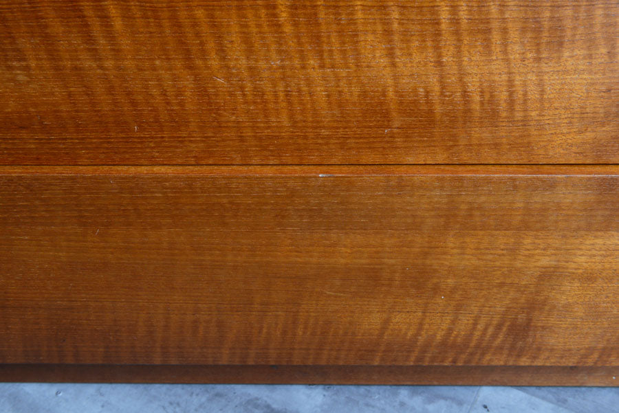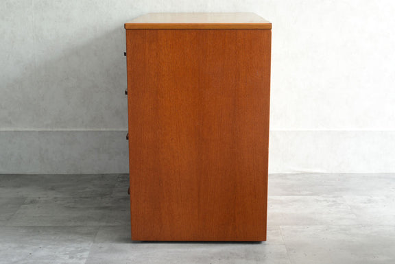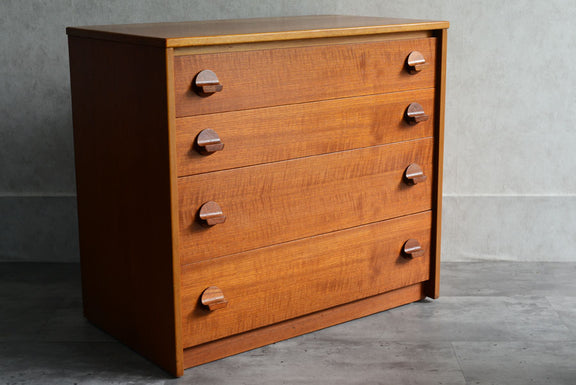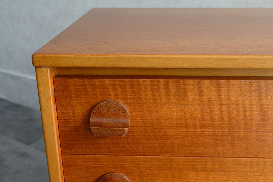 引き出しの取っ手がチークを彫り出したSTAGらしいデザインの4段チェスト。チークの杢目が美しい直線的でシンプルなデザインです。
