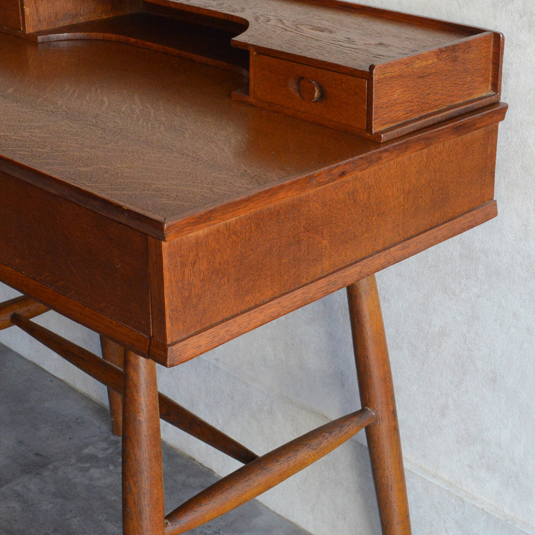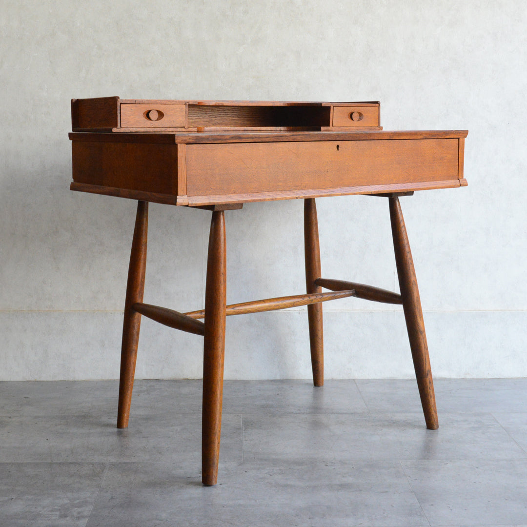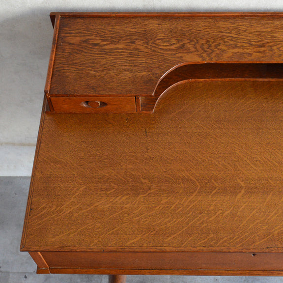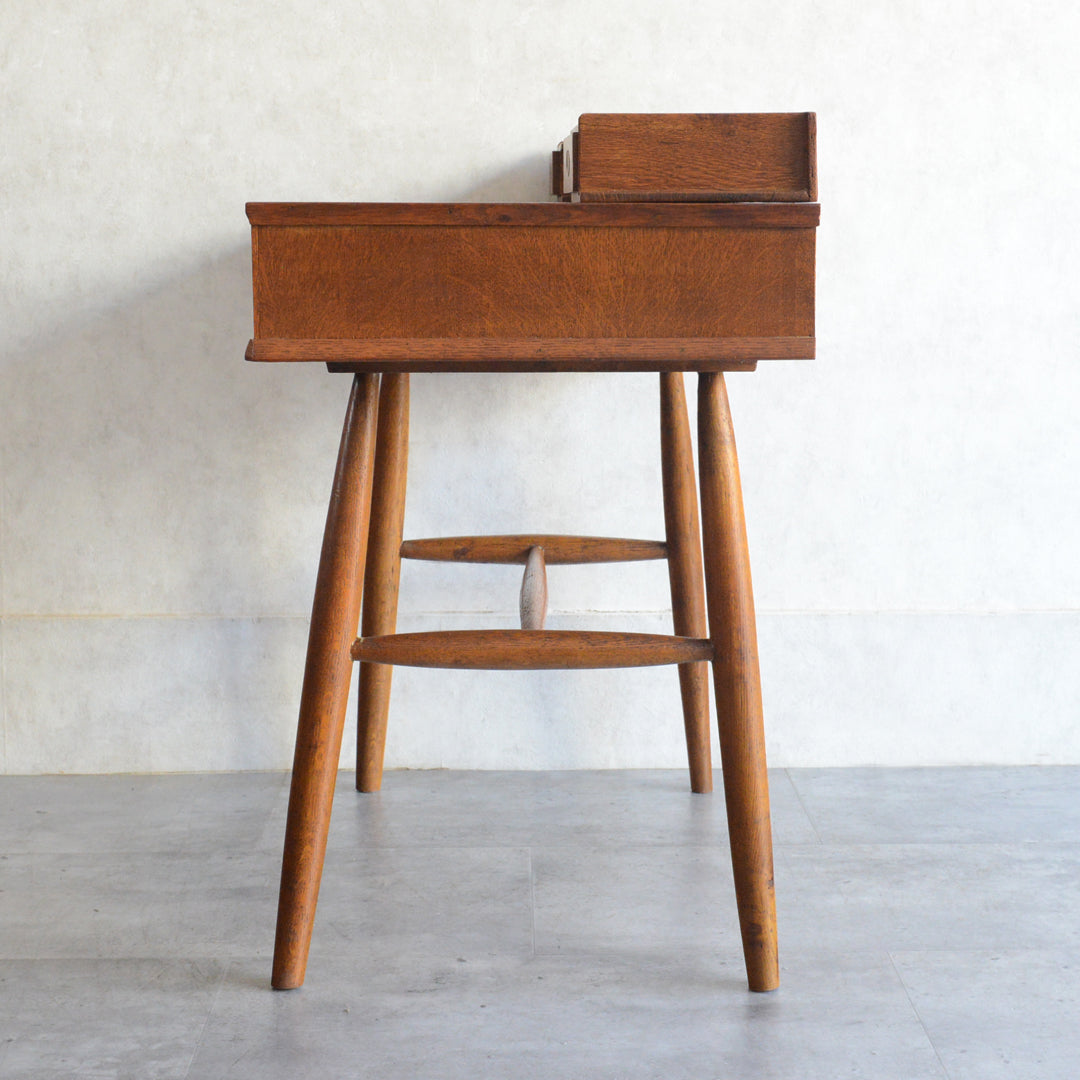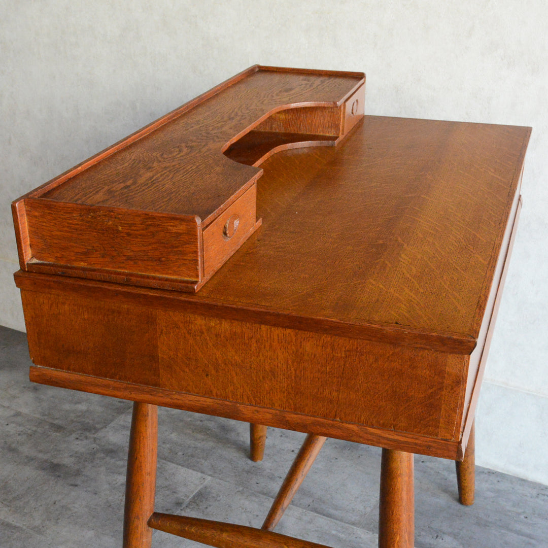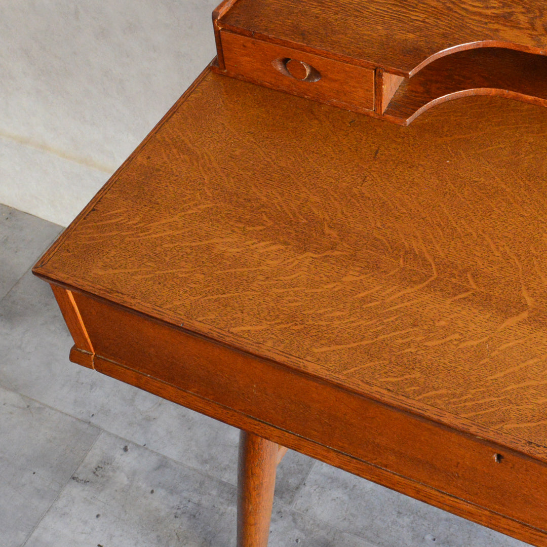 オーク材特有の虎斑の木目が美しいヴィンテージ感溢れるデスク。すらりと伸びた脚部がシンプルで抜け感がある佇まい。