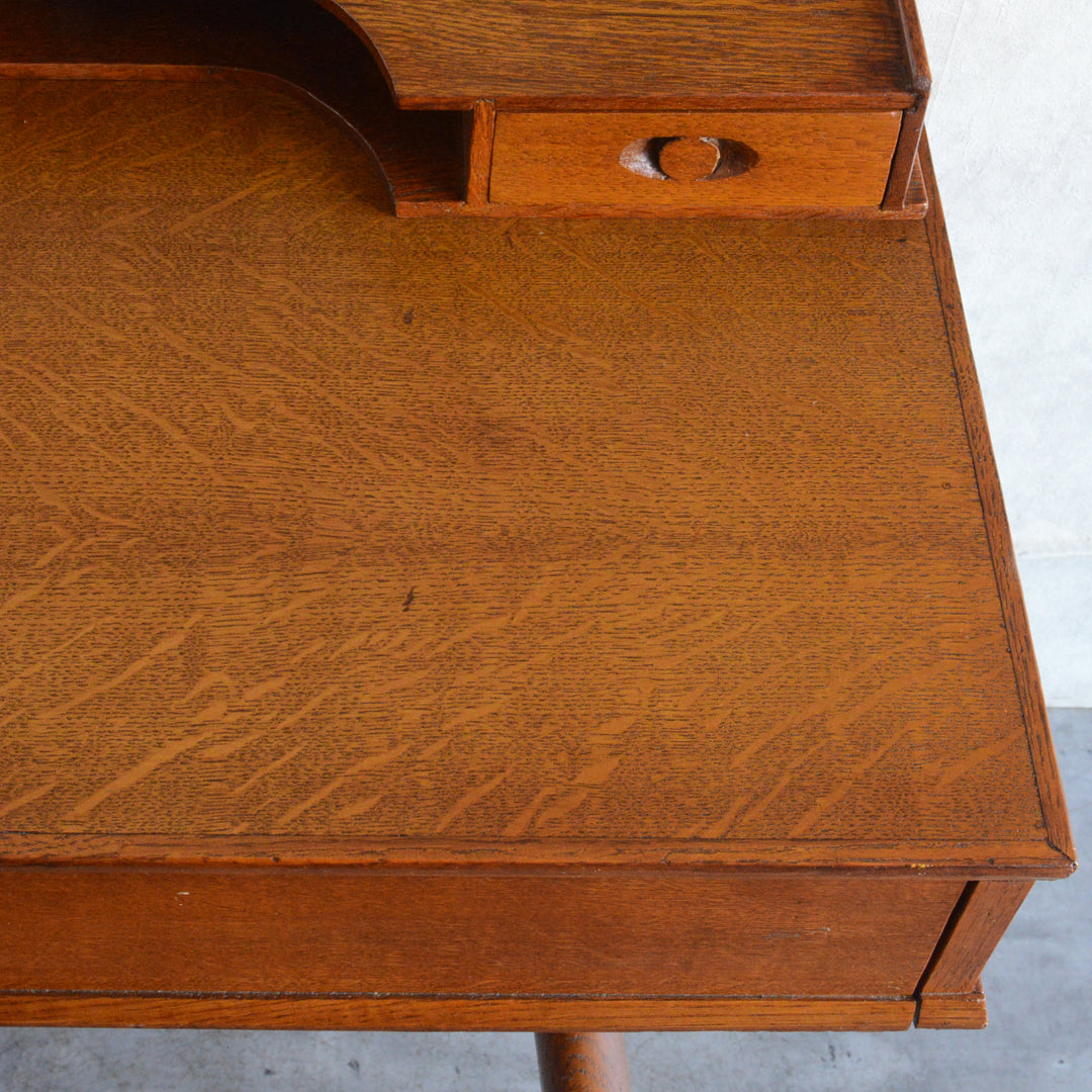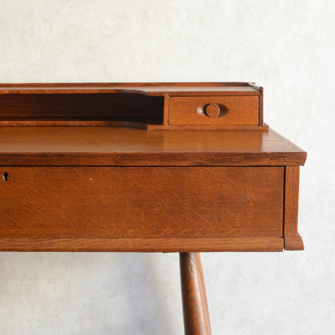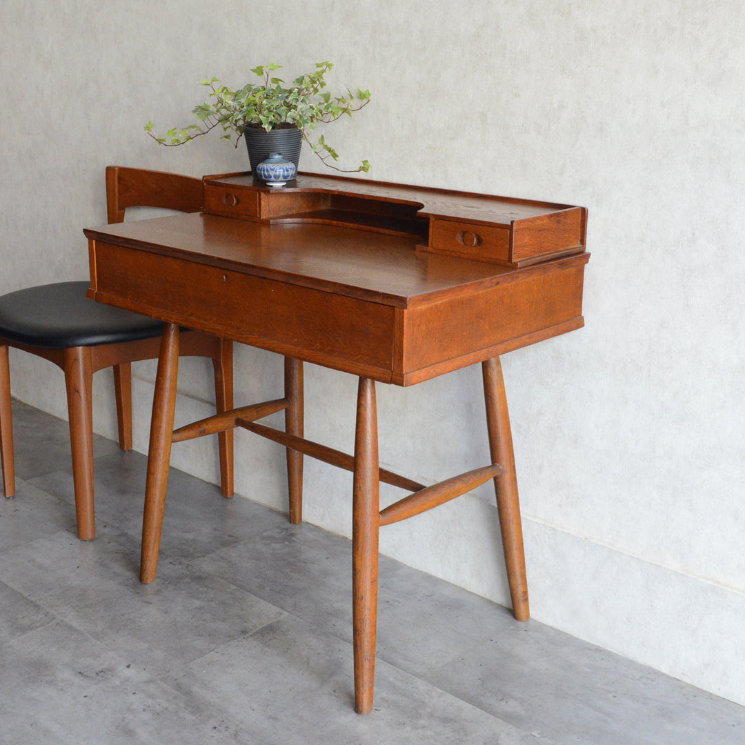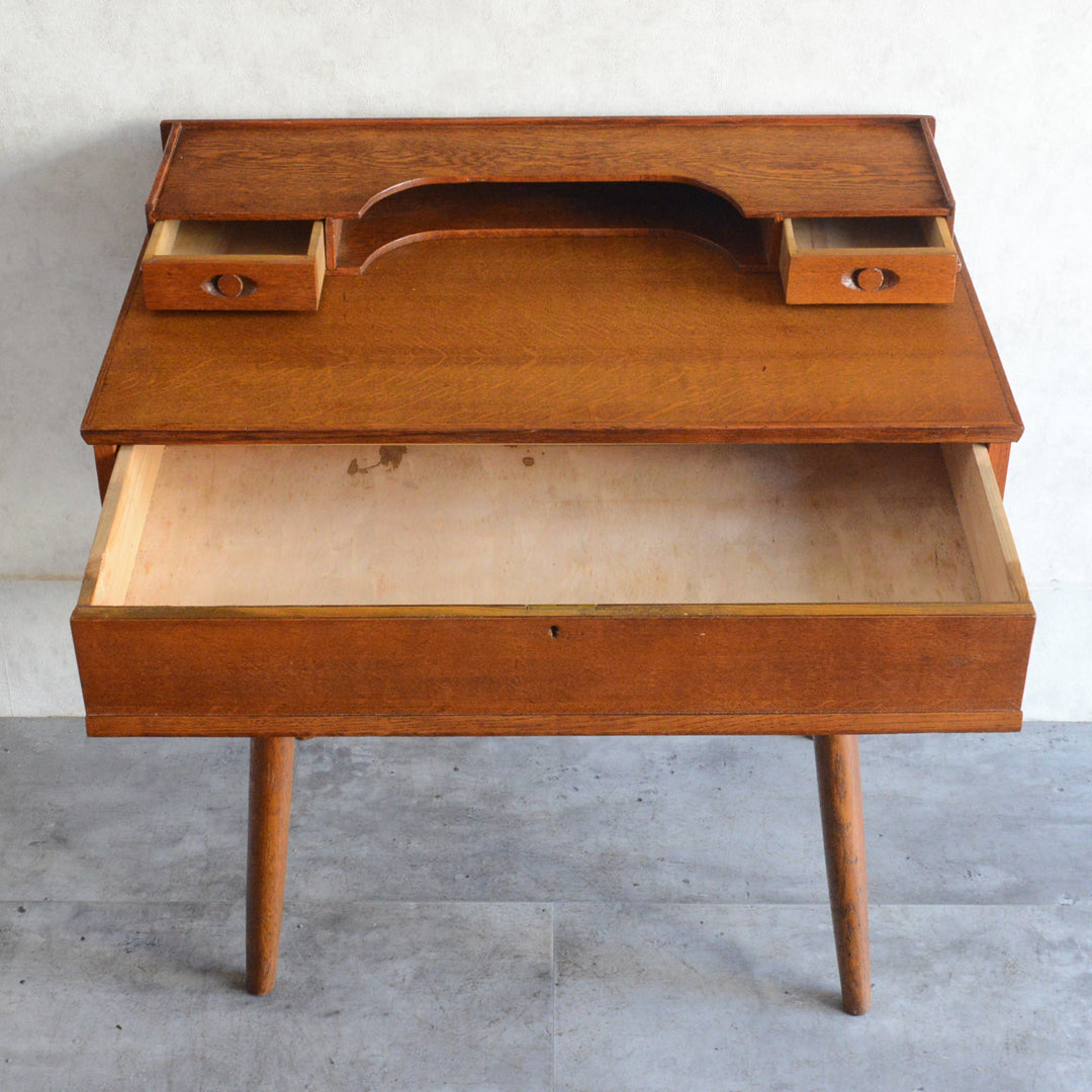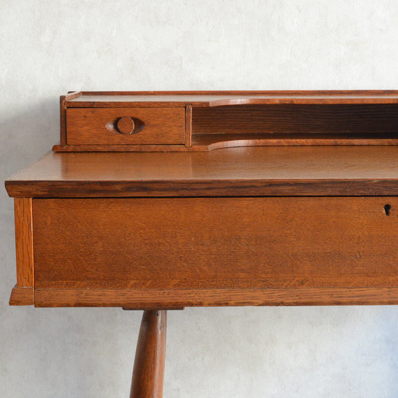 オーク材特有の虎斑の木目が美しいヴィンテージ感溢れるデスク。すらりと伸びた脚部がシンプルで抜け感がある佇まい。
