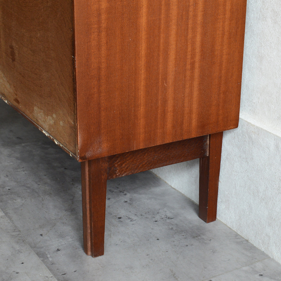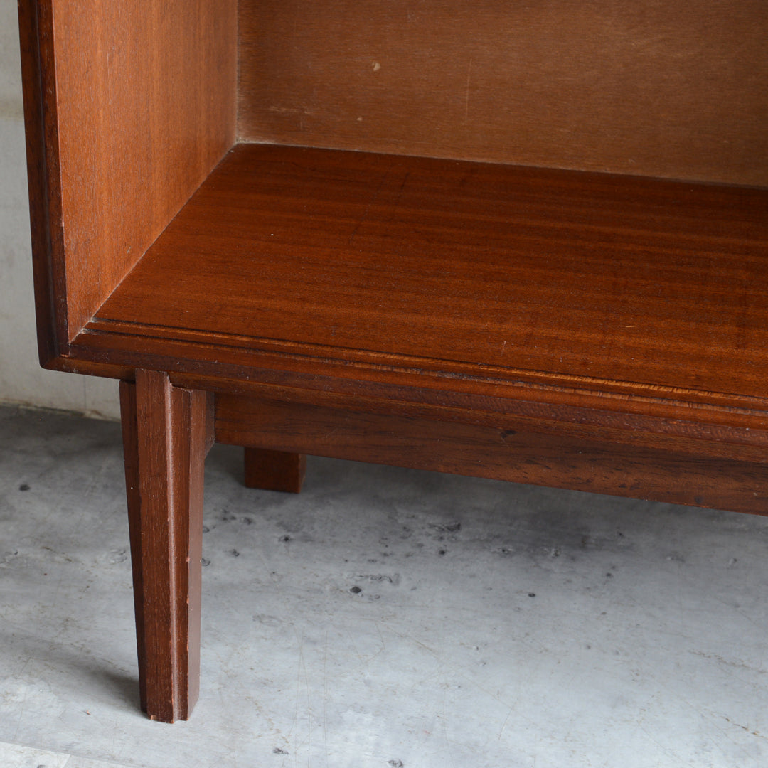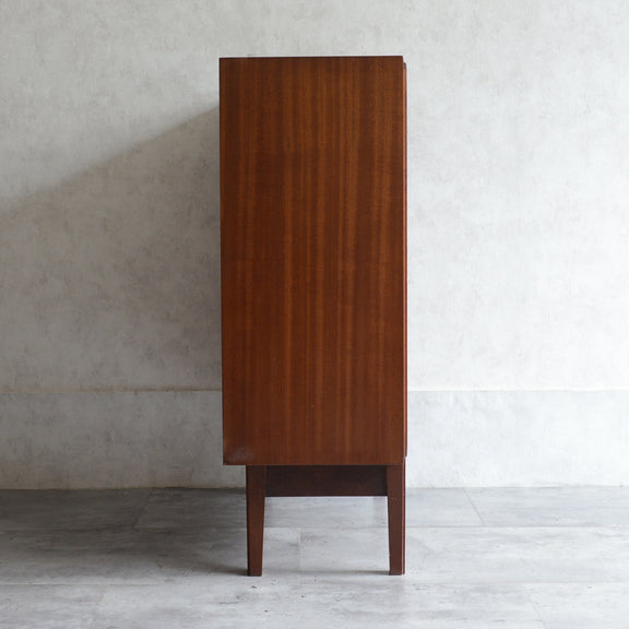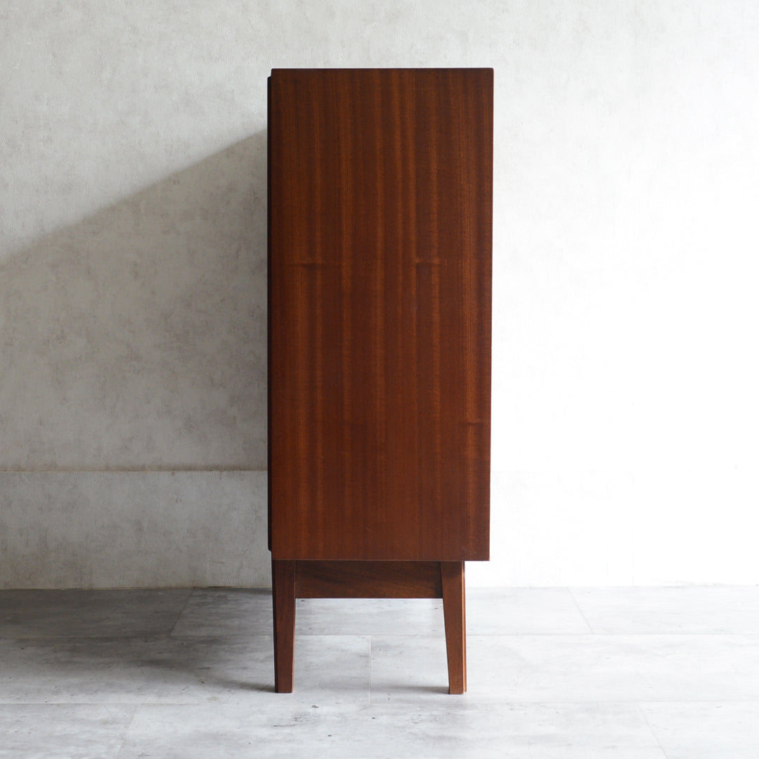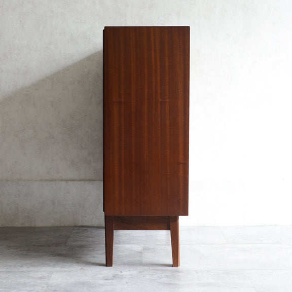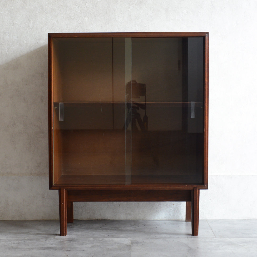 脚付きのミッドセンチュリーらしいデザインのガラス扉キャビネット。縞目模様が特徴のトーラ材の木目が美しく、正面縁や脚部の造作も凝っています。