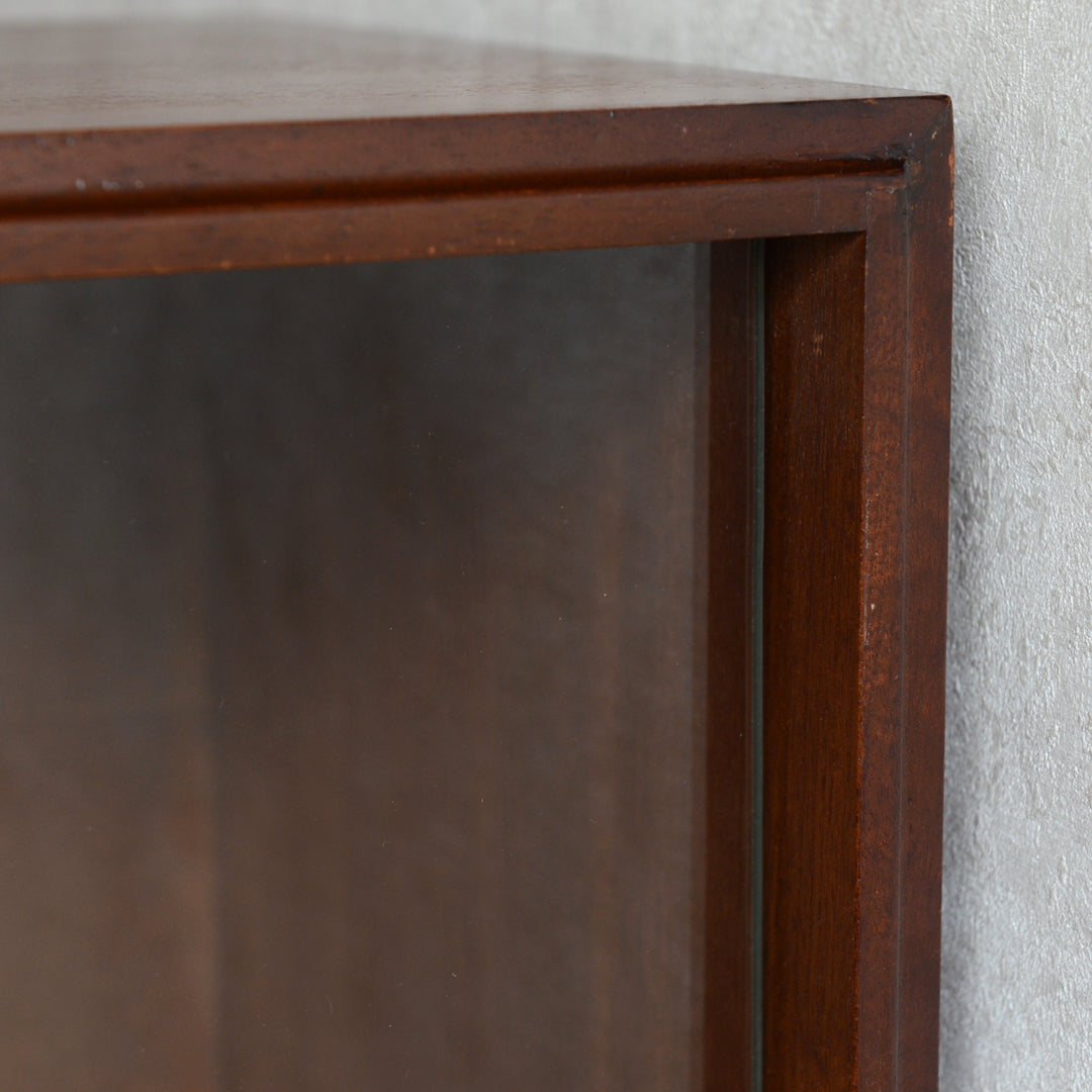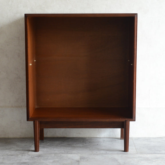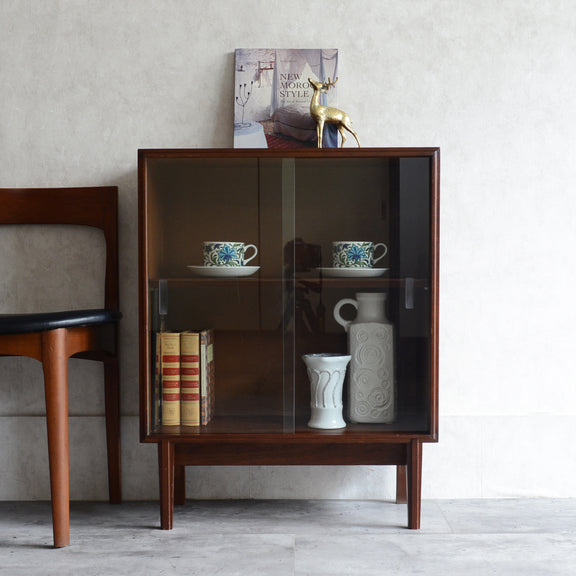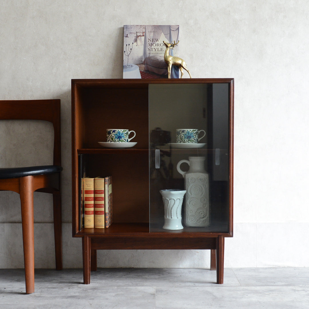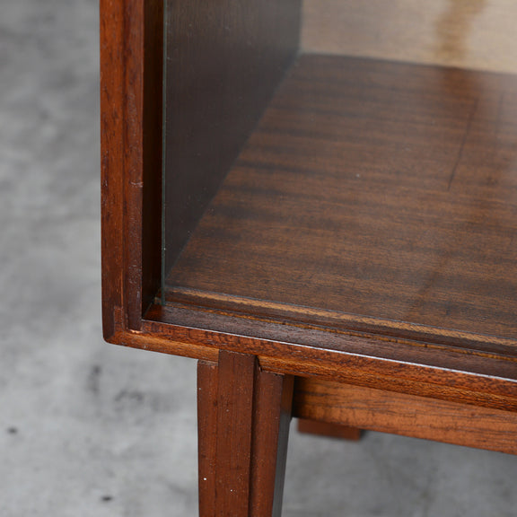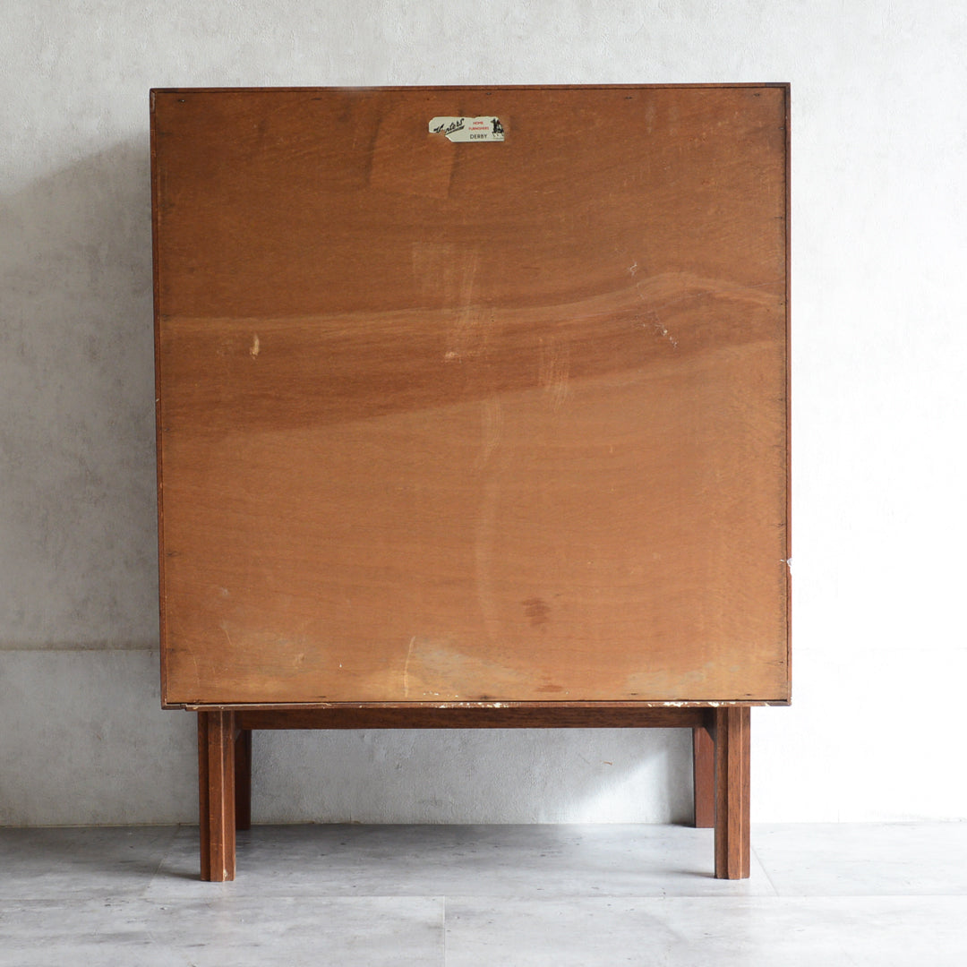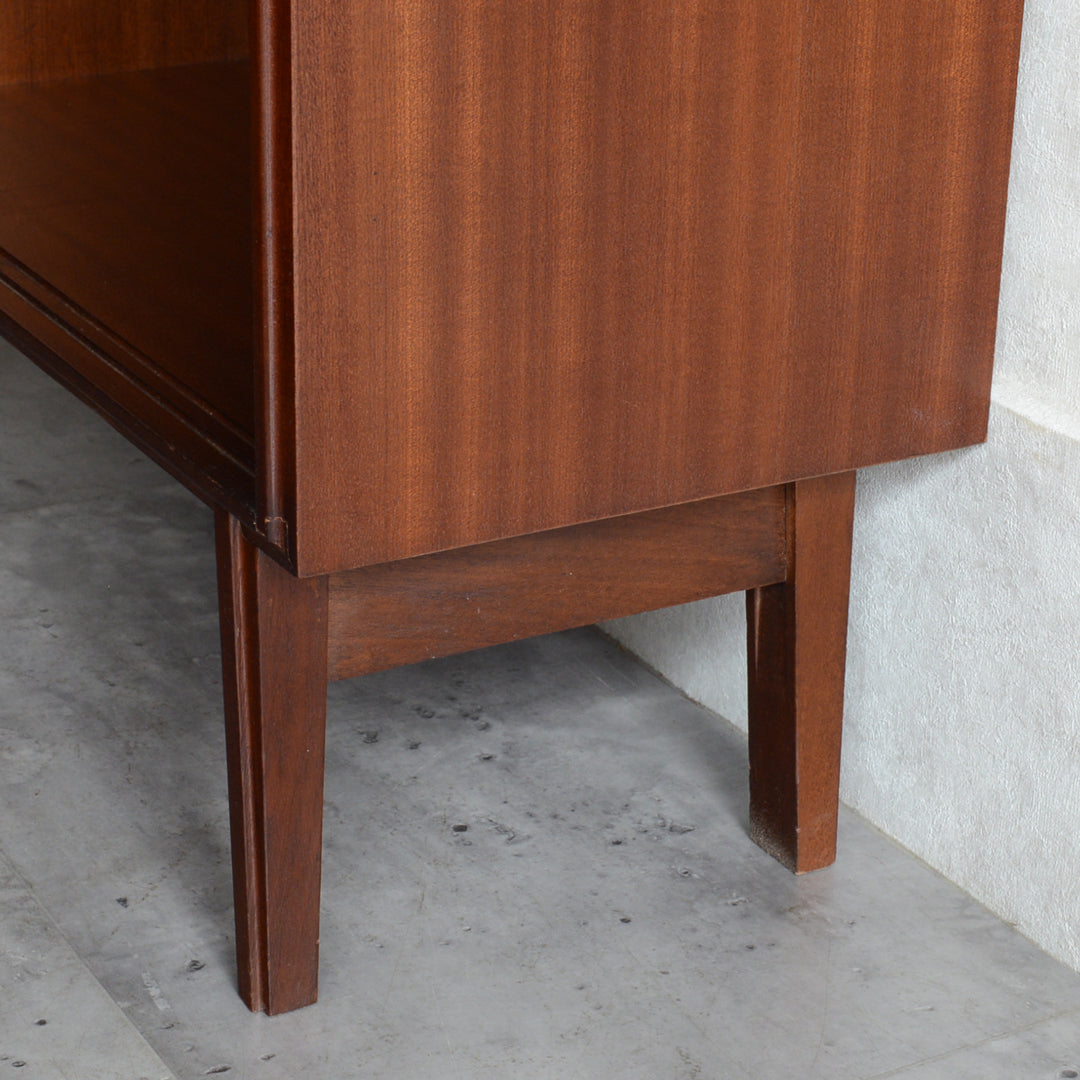 脚付きのミッドセンチュリーらしいデザインのガラス扉キャビネット。縞目模様が特徴のトーラ材の木目が美しく、正面縁や脚部の造作も凝っています。