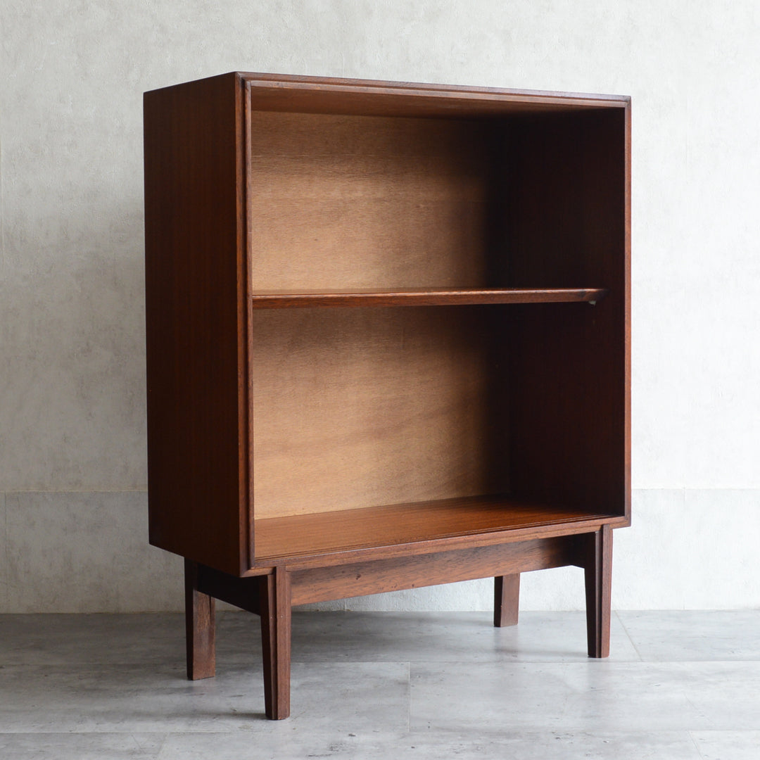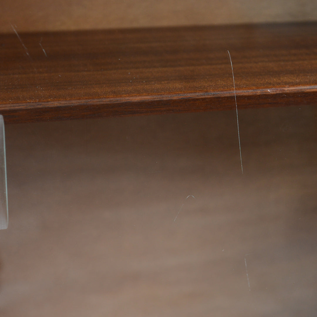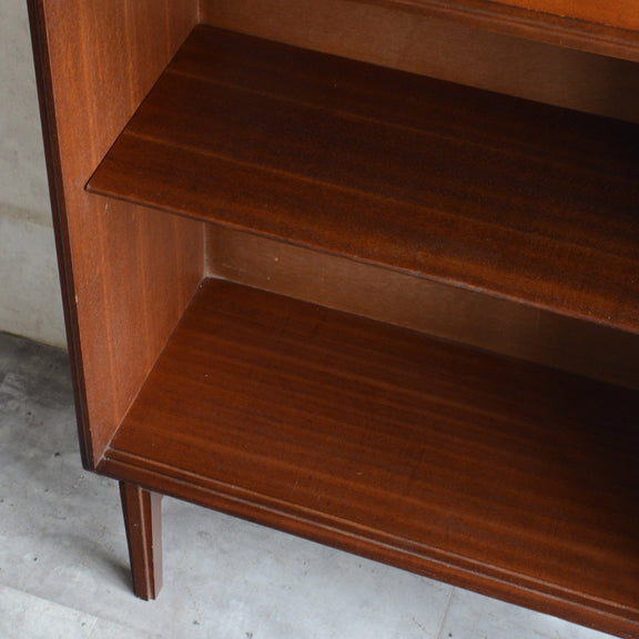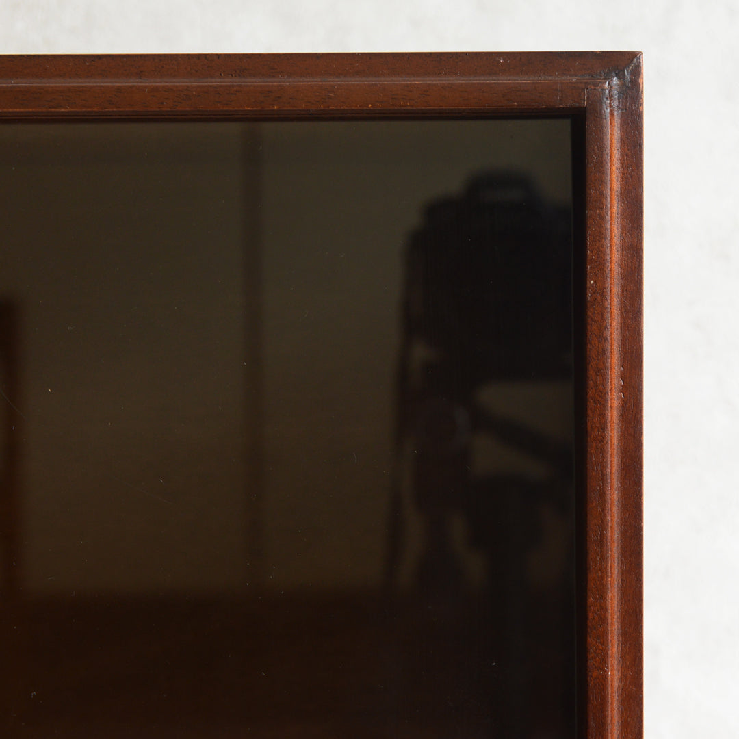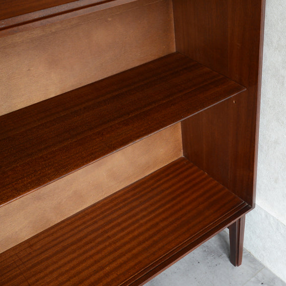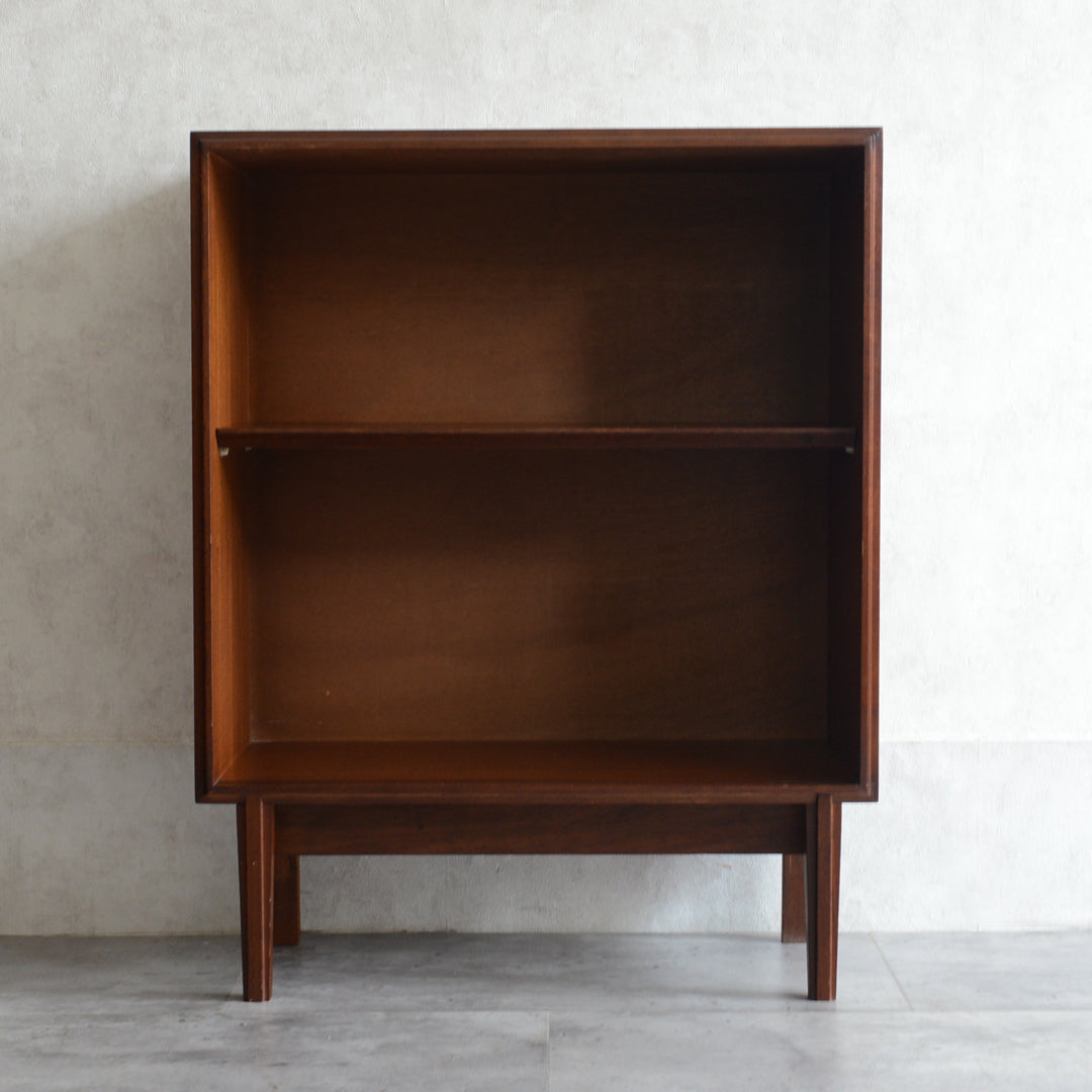 脚付きのミッドセンチュリーらしいデザインのガラス扉キャビネット。縞目模様が特徴のトーラ材の木目が美しく、正面縁や脚部の造作も凝っています。