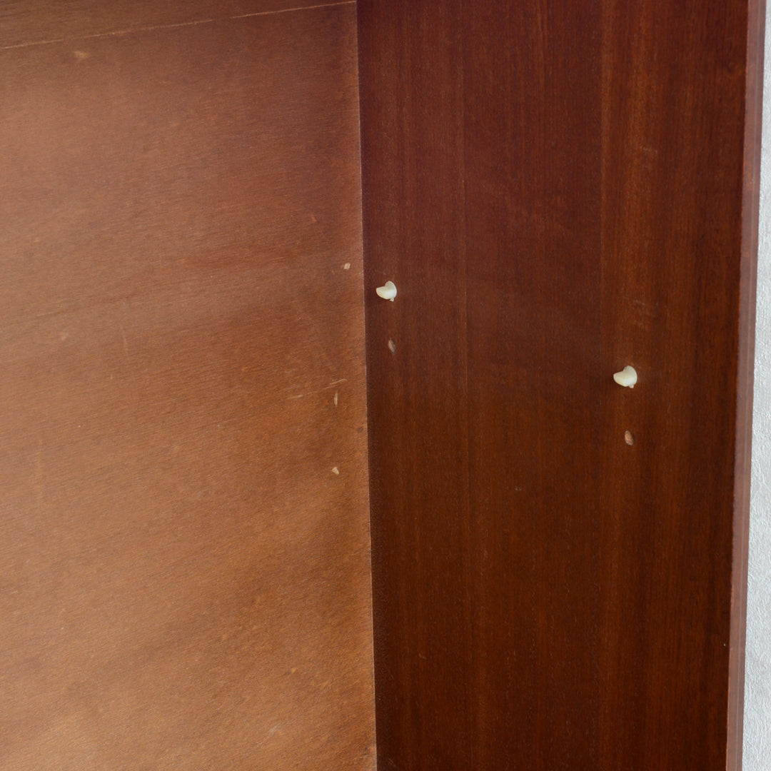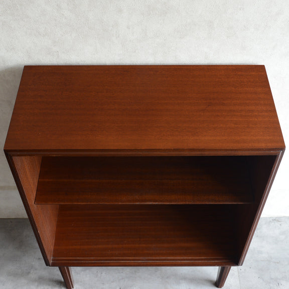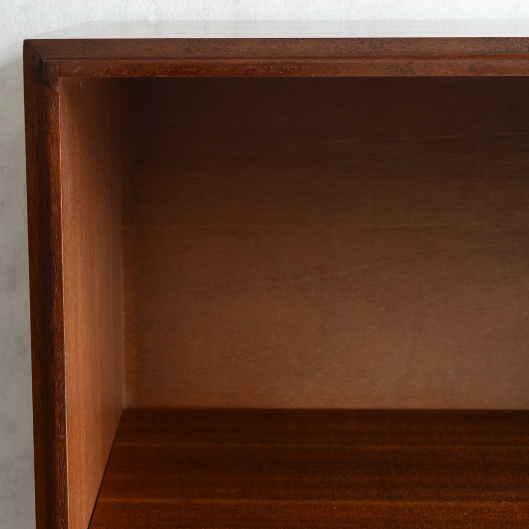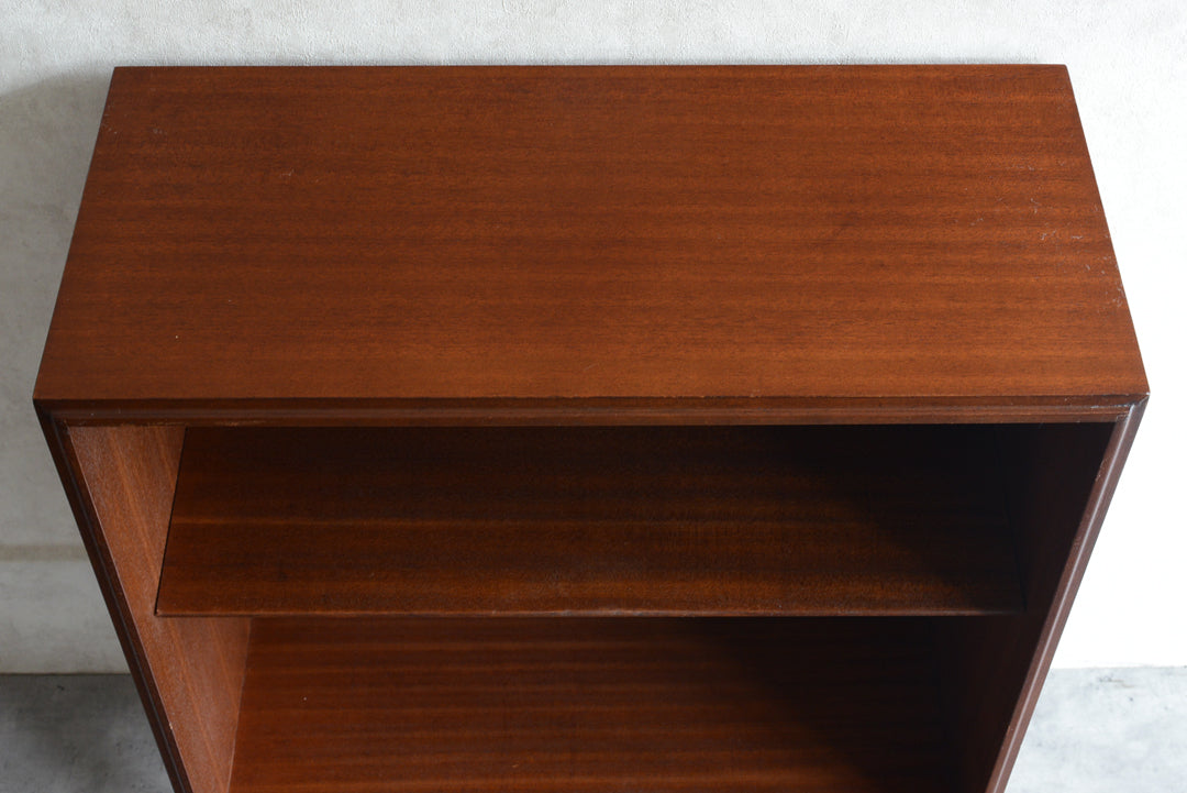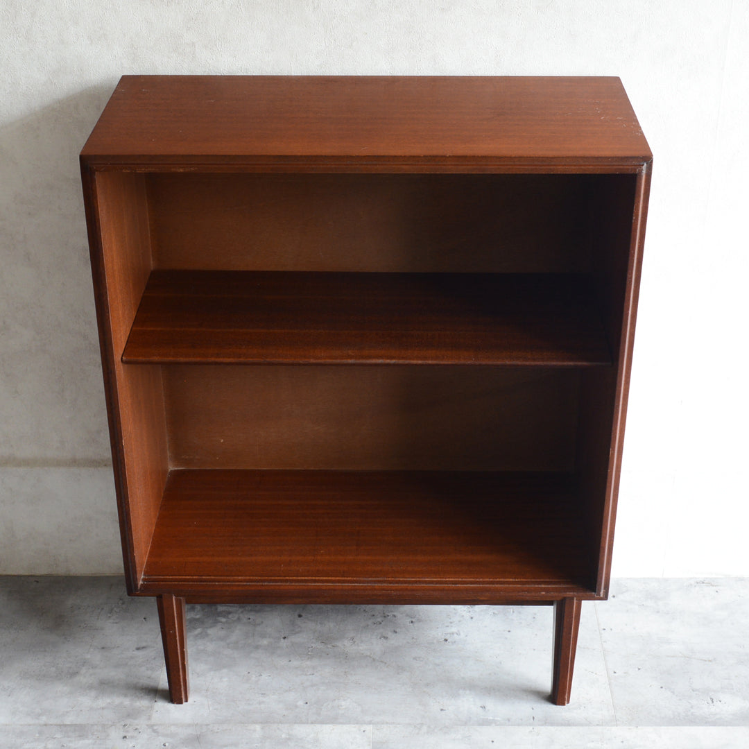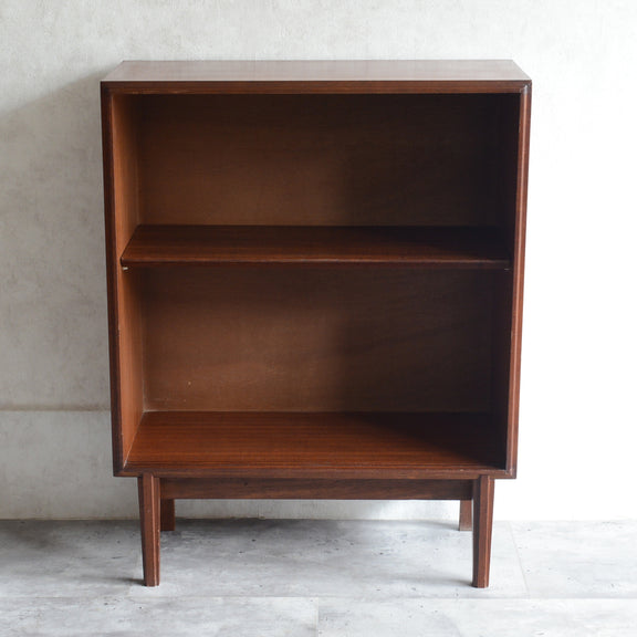 脚付きのミッドセンチュリーらしいデザインのガラス扉キャビネット。縞目模様が特徴のトーラ材の木目が美しく、正面縁や脚部の造作も凝っています。
