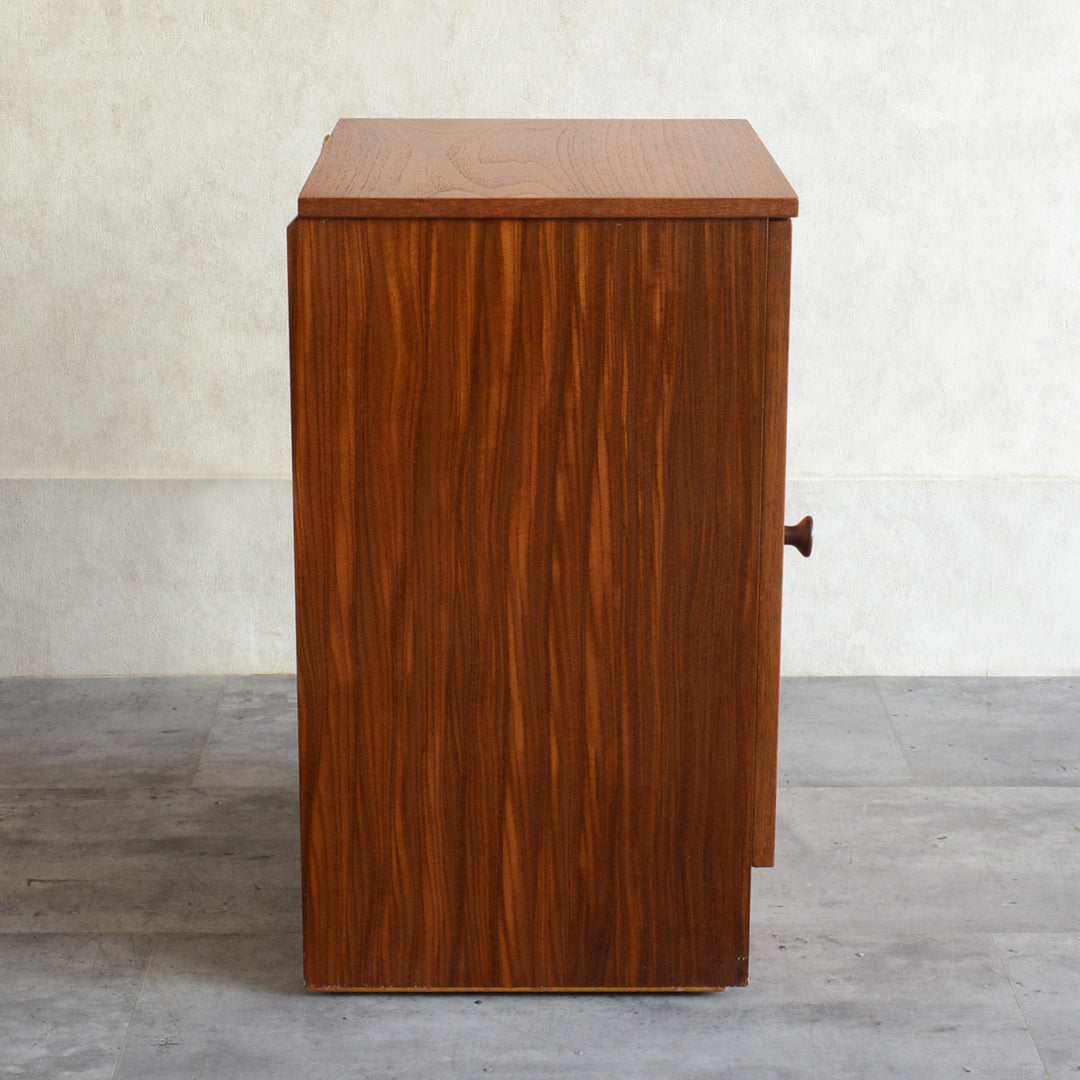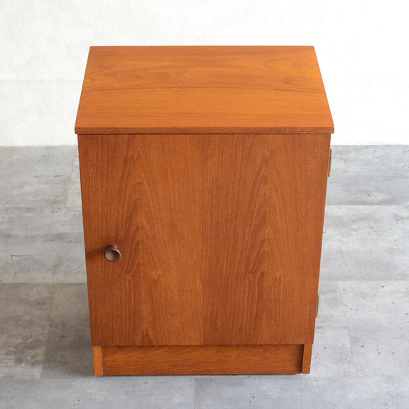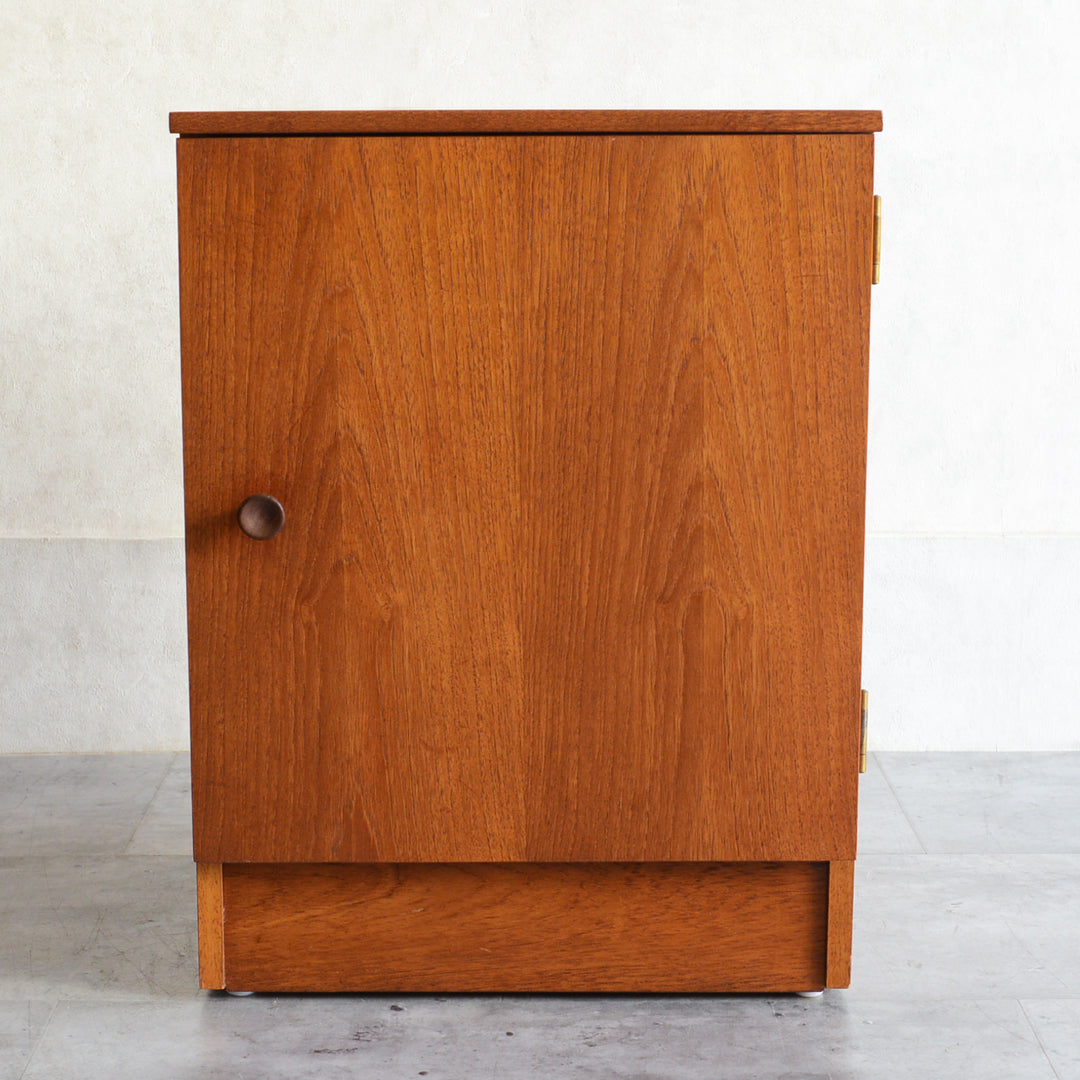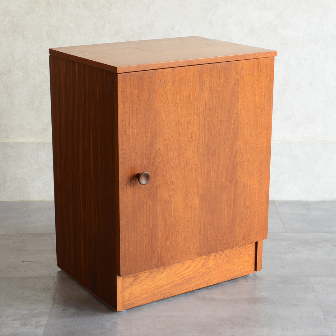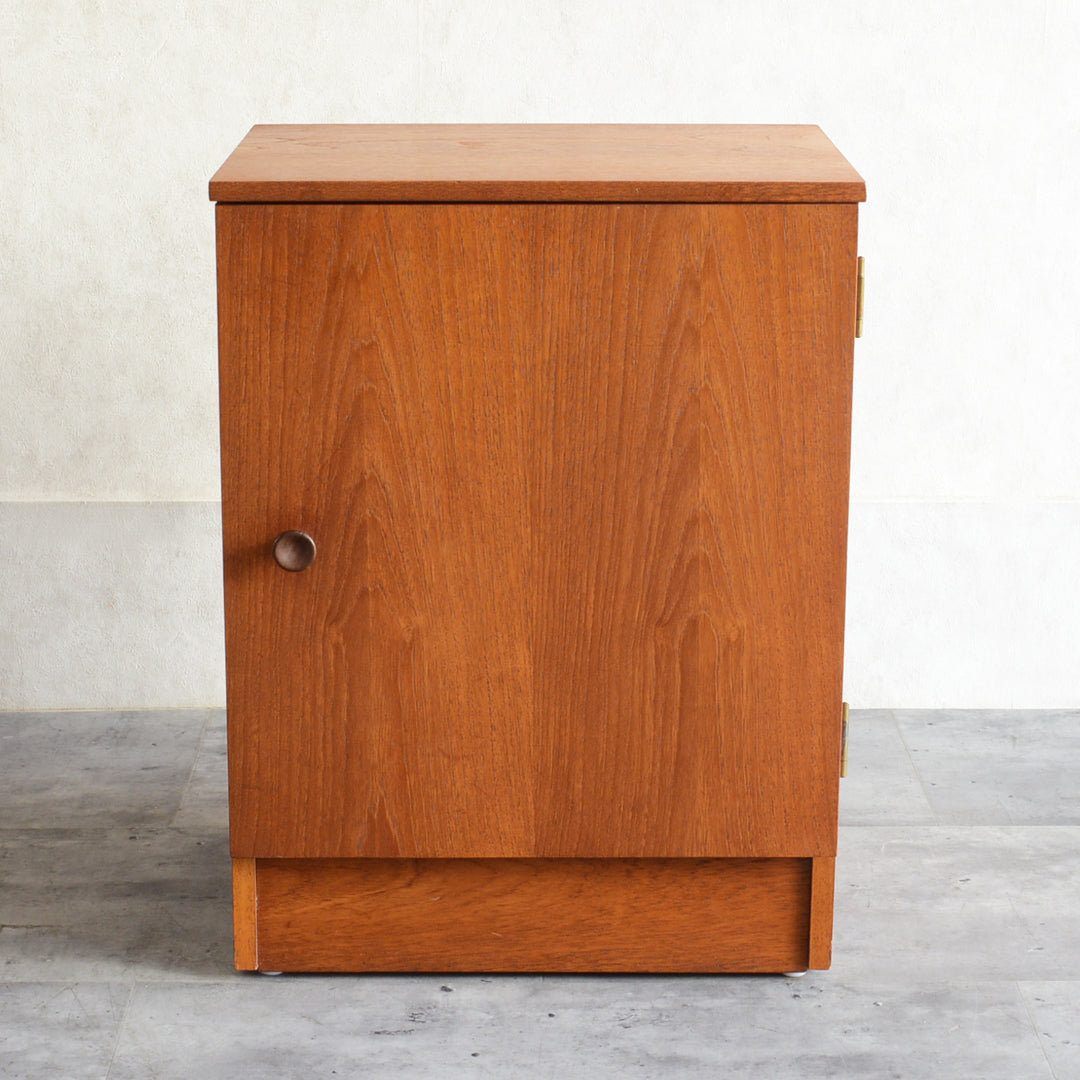 ヴィンテージチークの木目が特に美しく、シンプルなデザインながらも存在感ある佇まいのキャビネット。ナイトテーブルとしてもお勧めです。