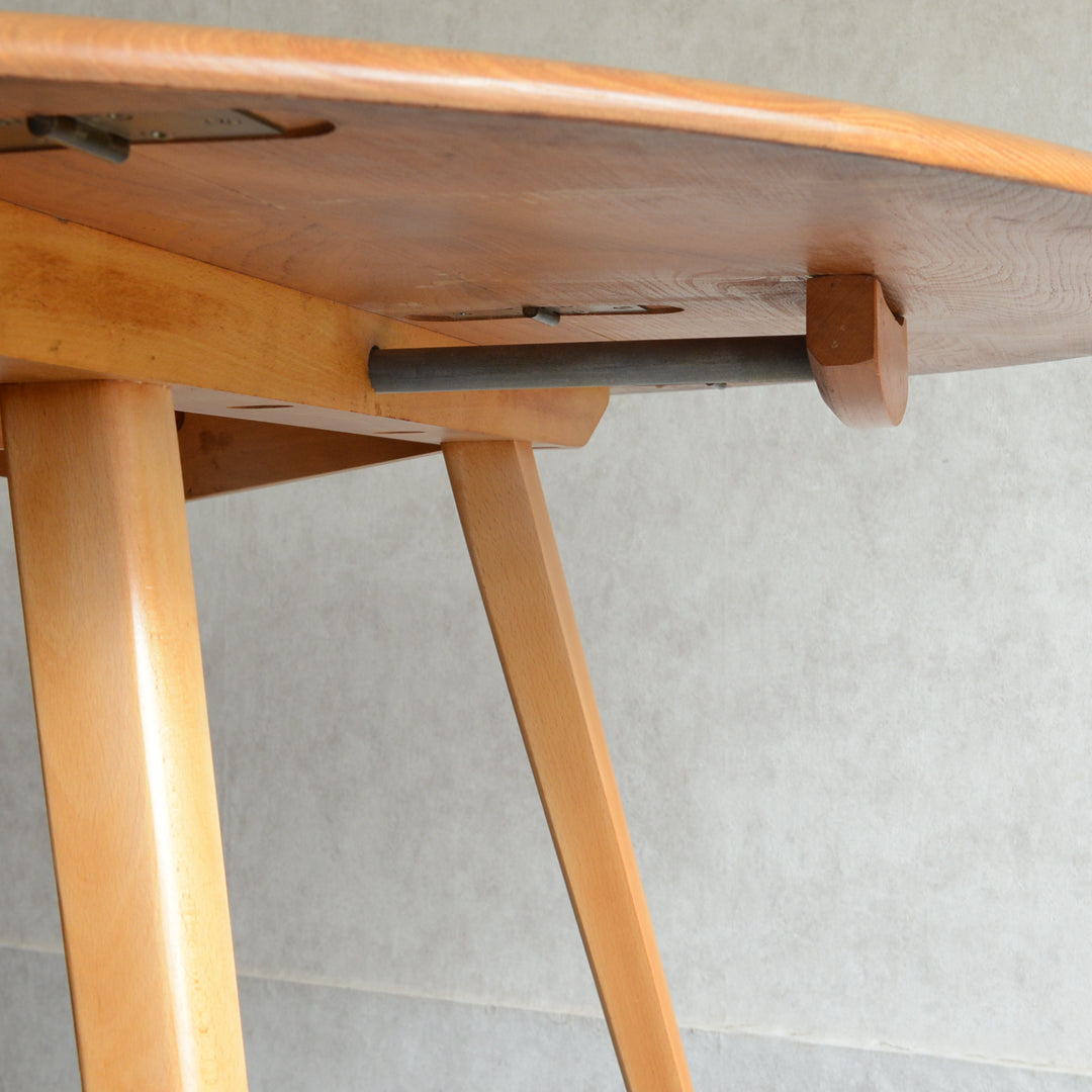 ドロップリーフテーブルは、天板下の木製の引手を押し引きすることにより金属製のバーが作動し、天板の左右部分を開閉することができます。