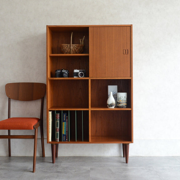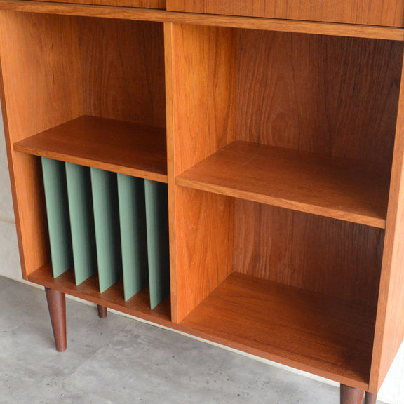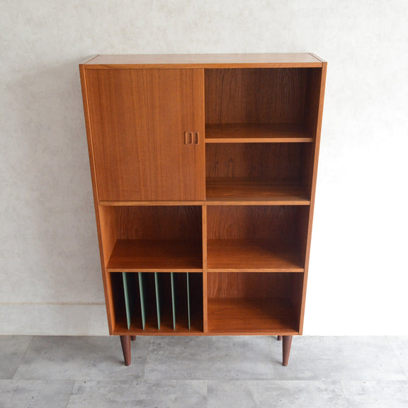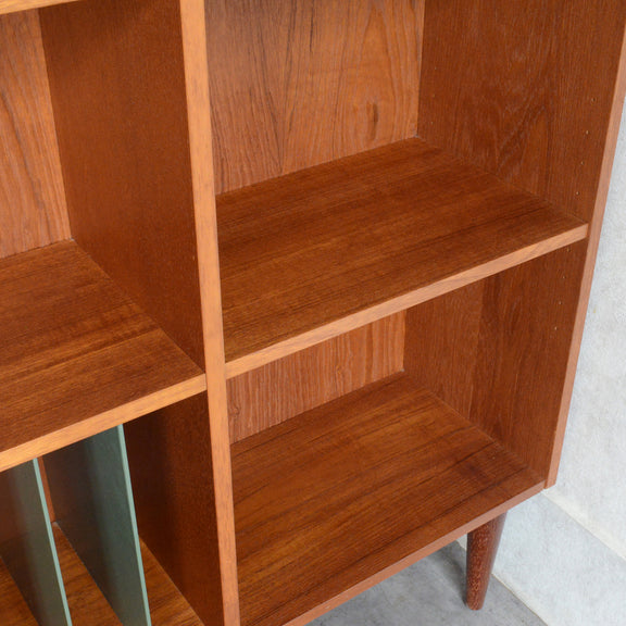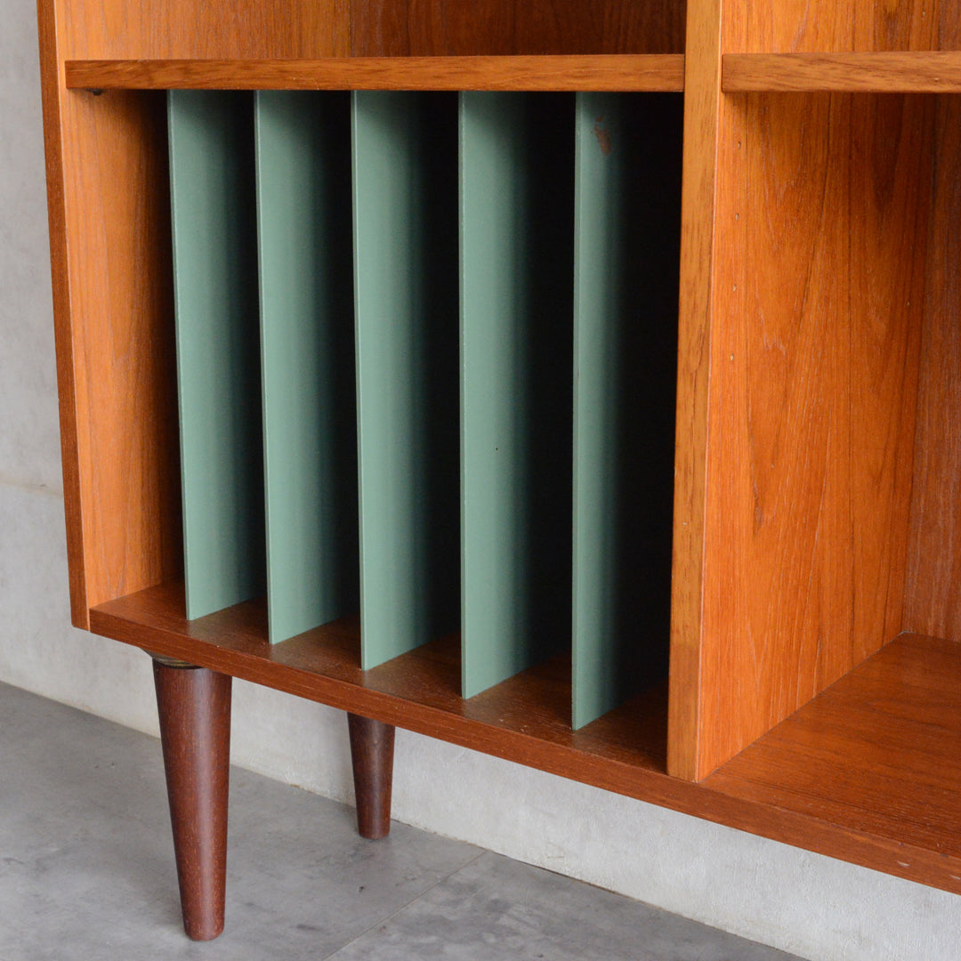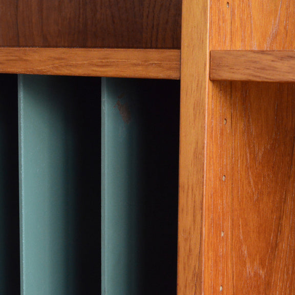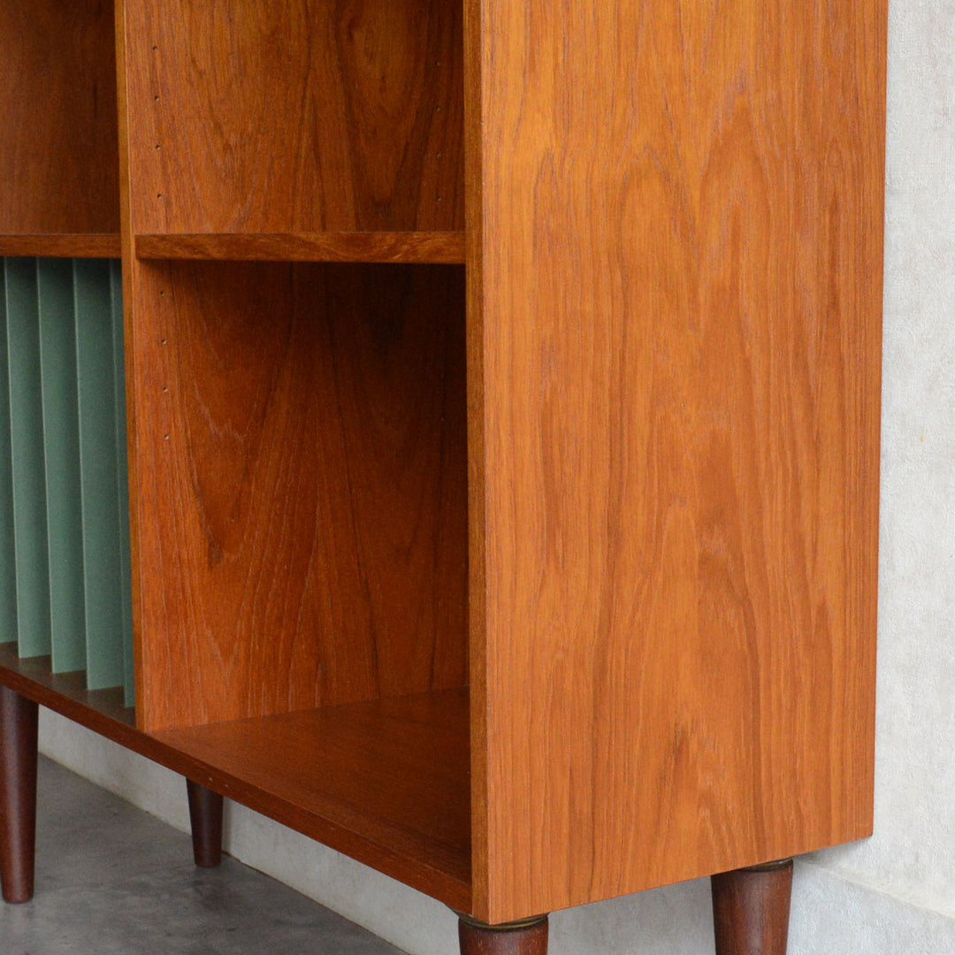 ヴィンテージチークの深い色合いの木目が美しい3段シェルフ。左下のグリーンの書類仕切り板がデザインのアクセントとなっています。(A4ファイル収納可能)
