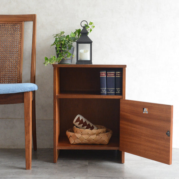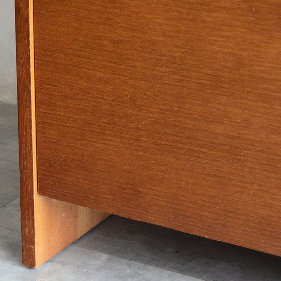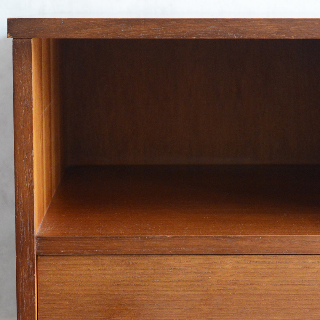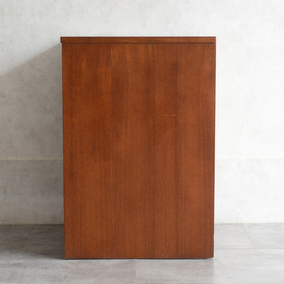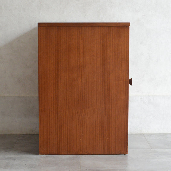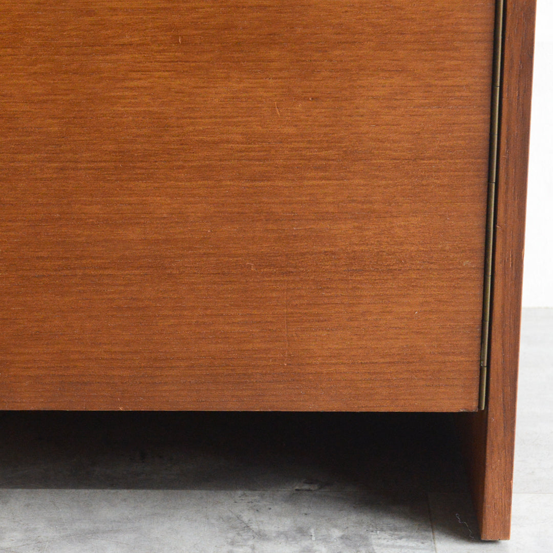 ヴィンテージチークの木目が美しく、シンプルなデザインながらも存在感ある佇まいのキャビネット。