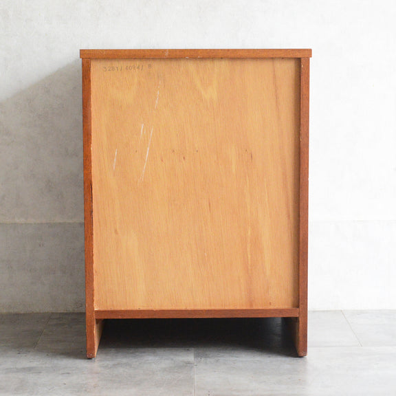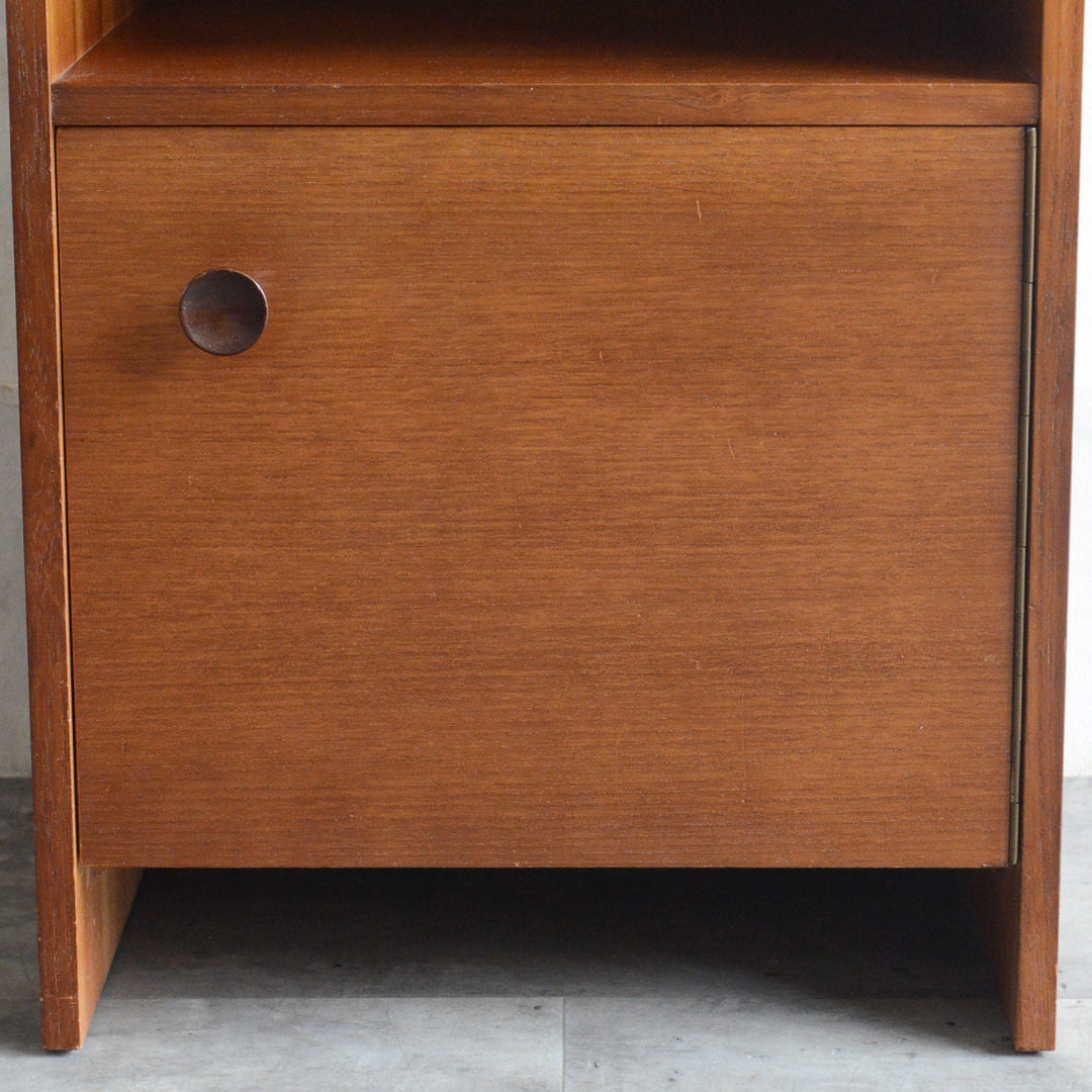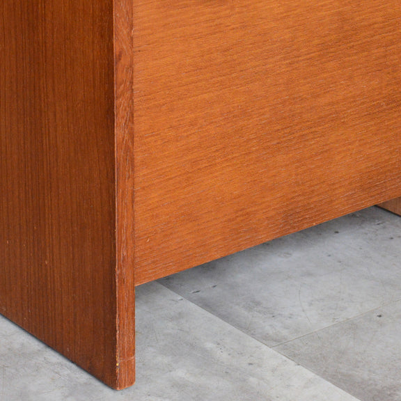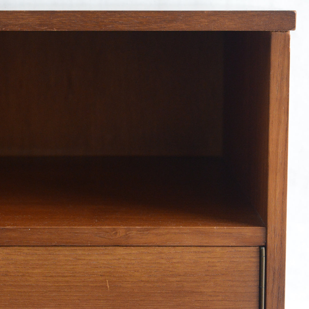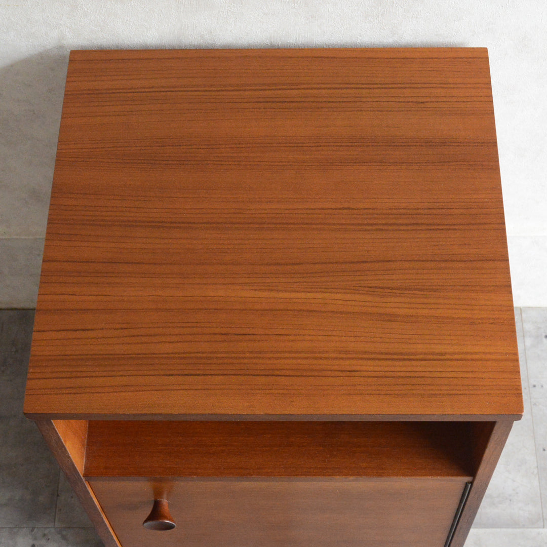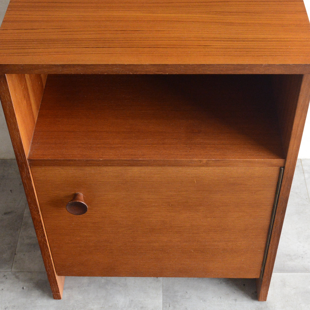 ヴィンテージチークの木目が美しく、シンプルなデザインながらも存在感ある佇まいのキャビネット。