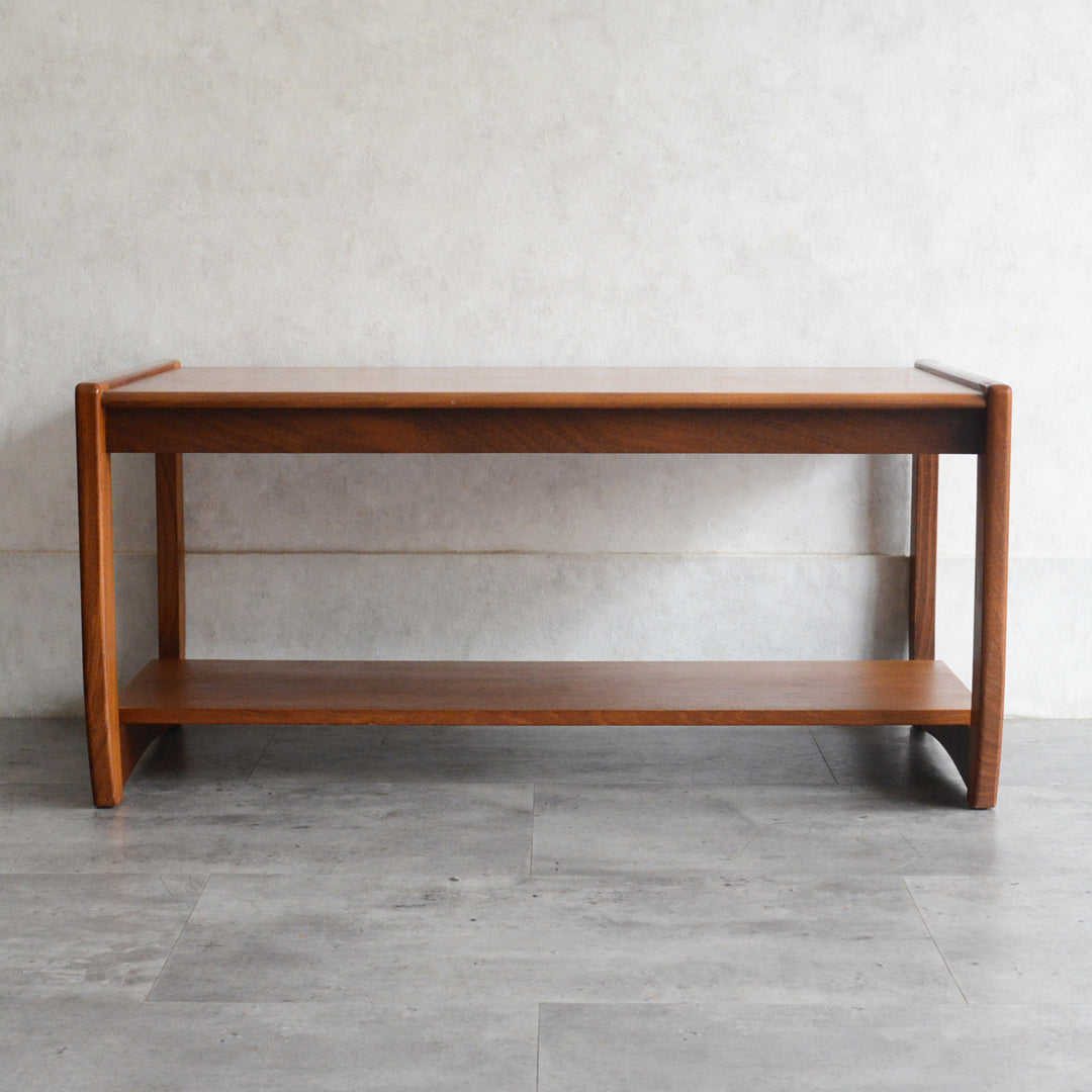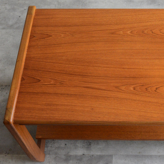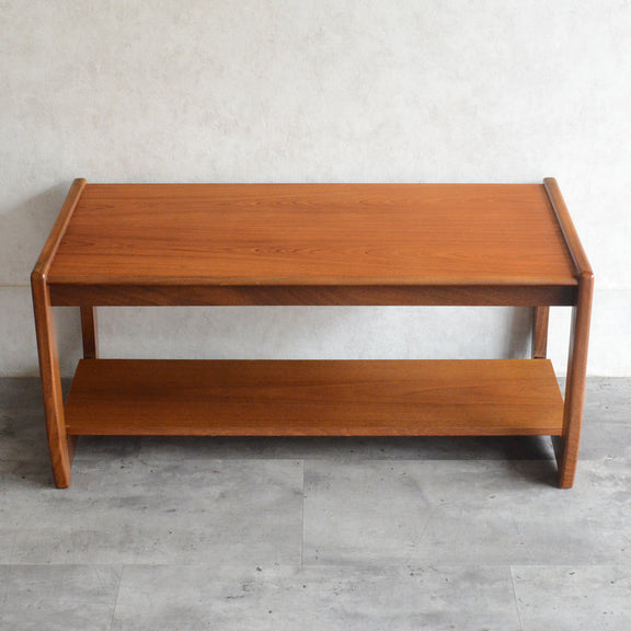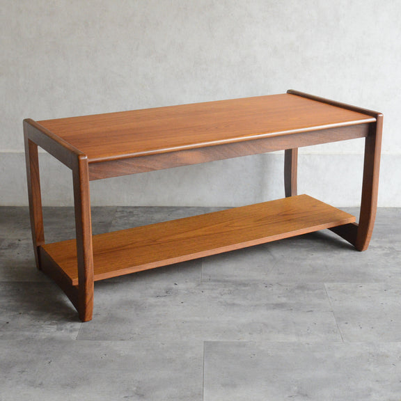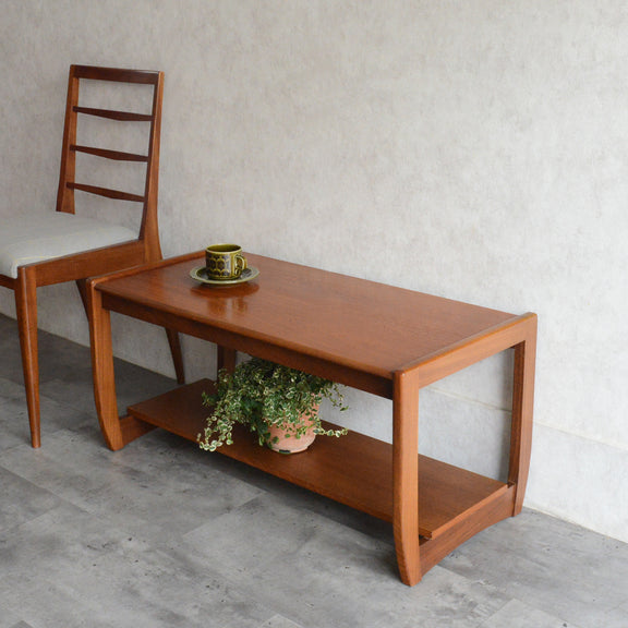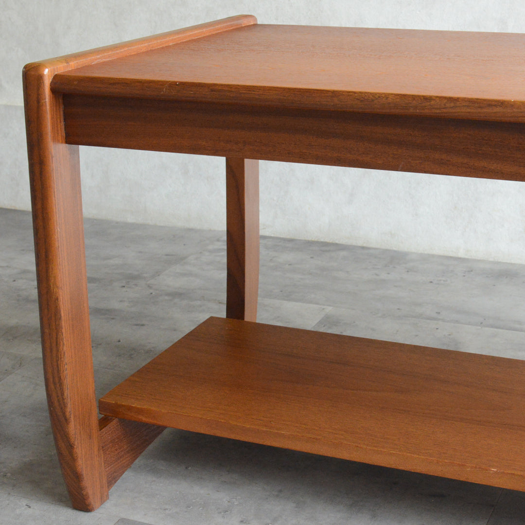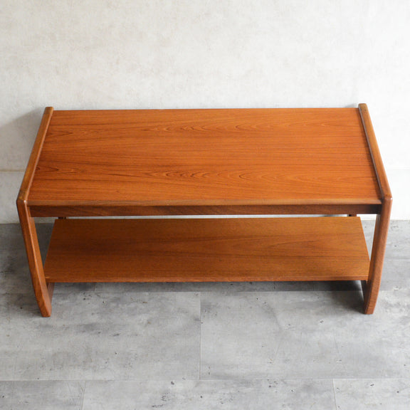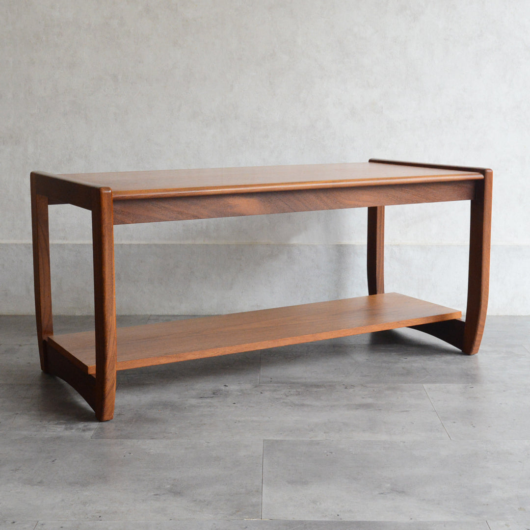 チーク材の天板が美しく、濃いめカラーのアフロモシアを使った脚部のデザインがスタイリッシュなローテーブル。