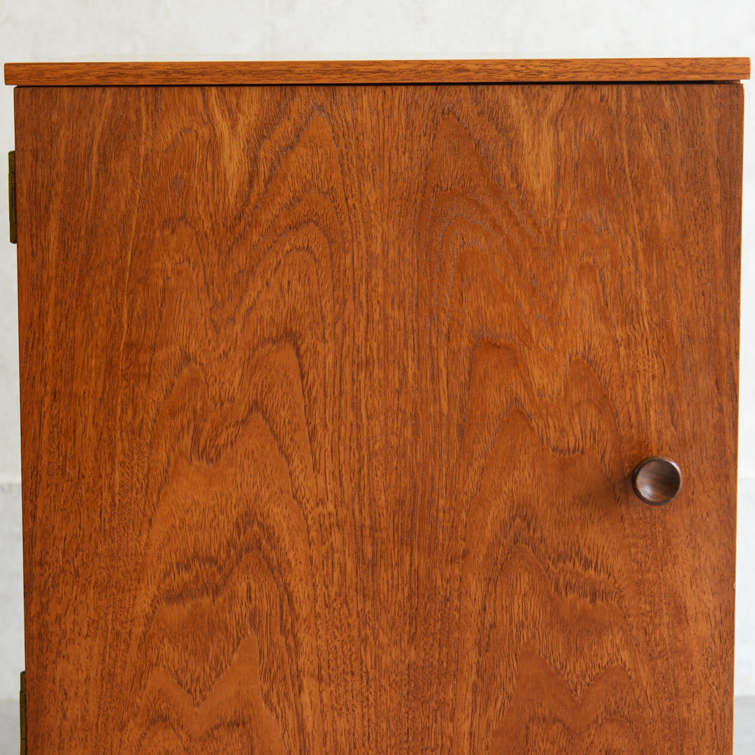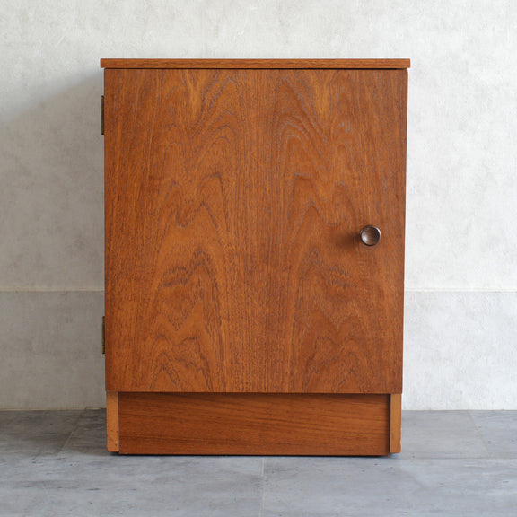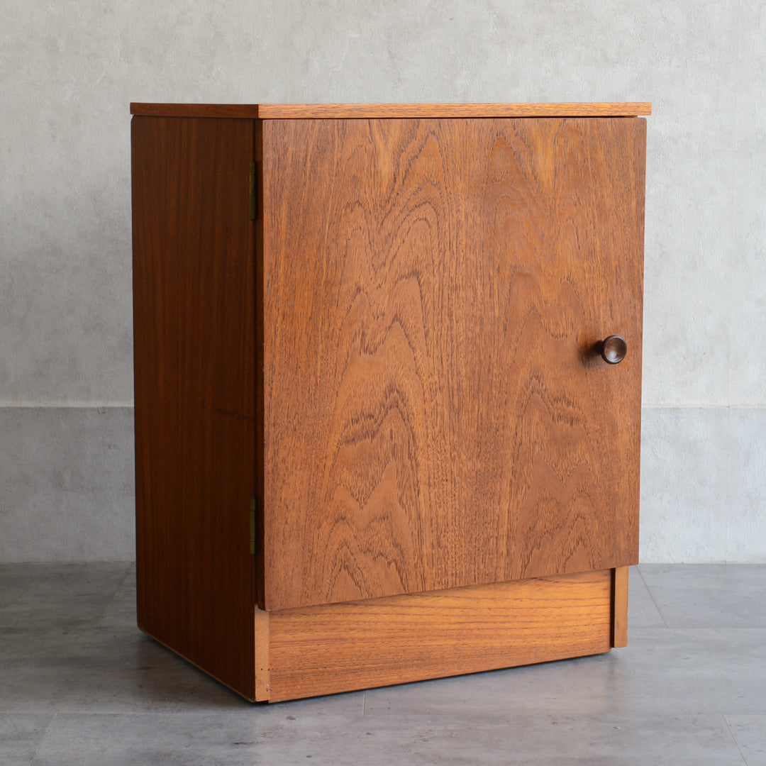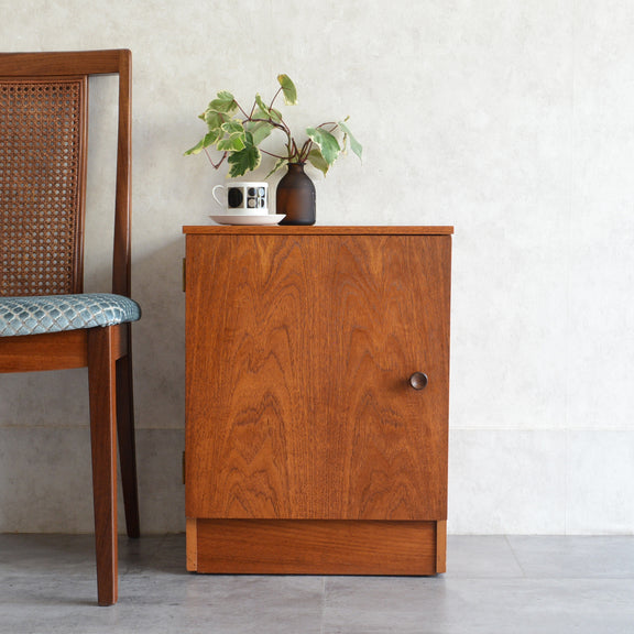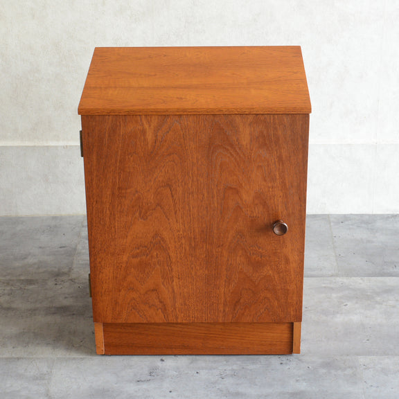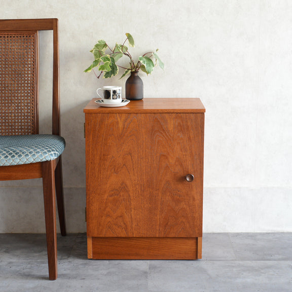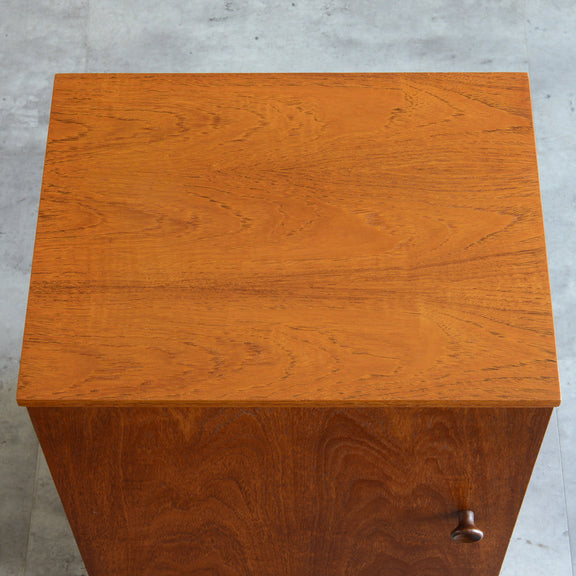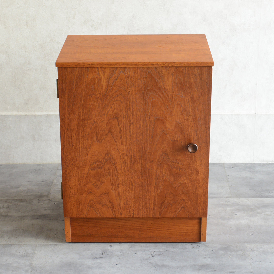ヴィンテージチークの木目が特に美しく、シンプルなデザインながらも存在感ある佇まいのキャビネット。ナイトテーブルとしてもお勧めです。