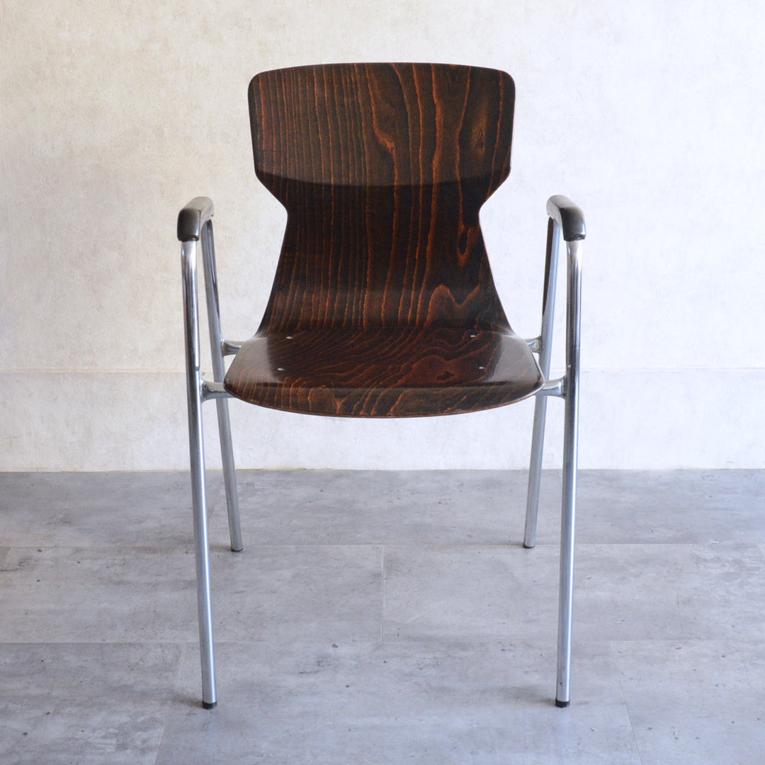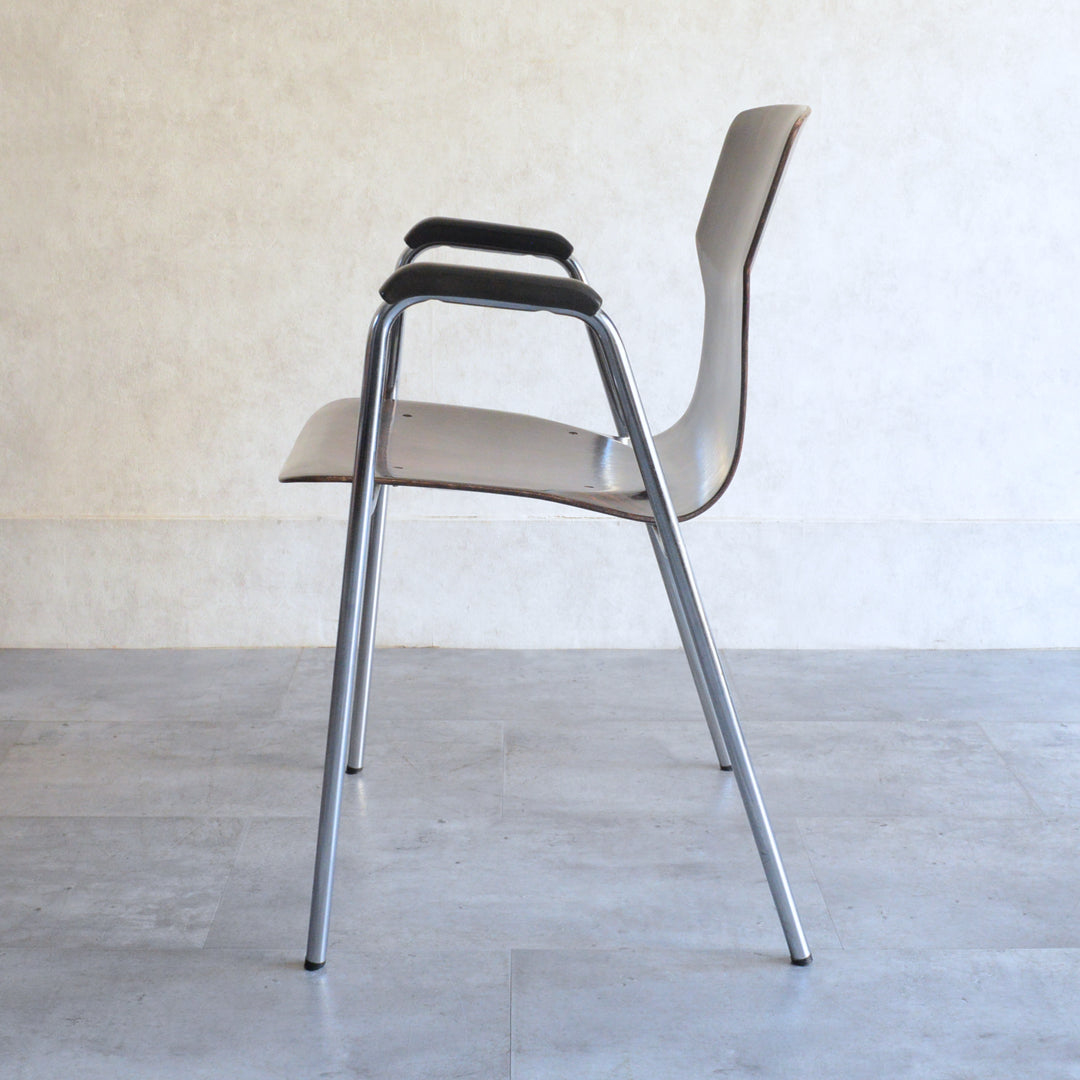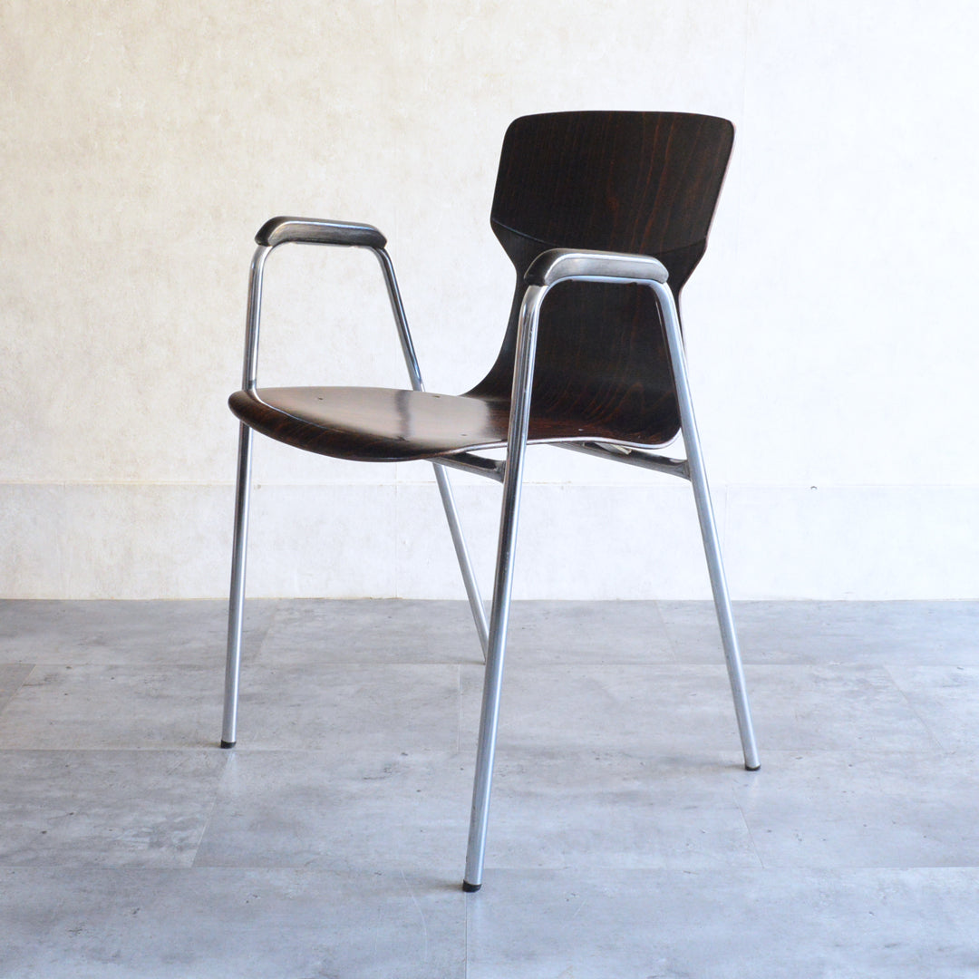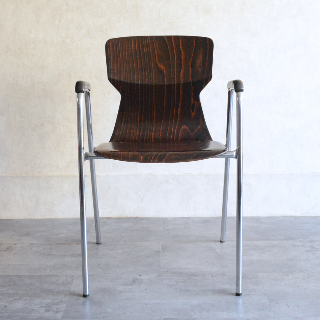 ブナ材に、フェノール樹脂を含浸させたパグウッド(ドイツ製) を使用したスタッキングチェア。アーム付タイプは流通量が少なく、希少なアイテムです。