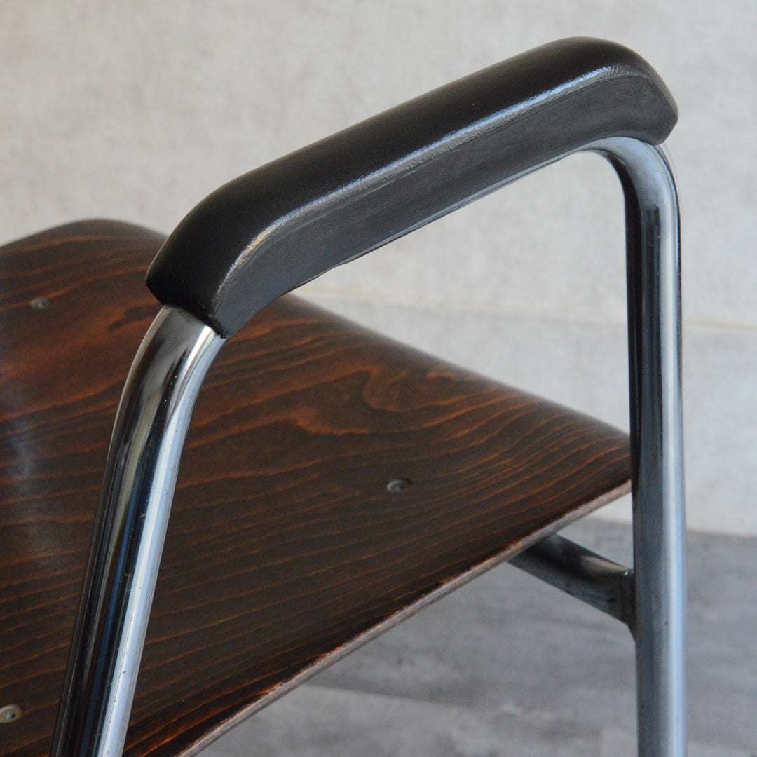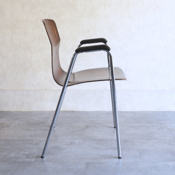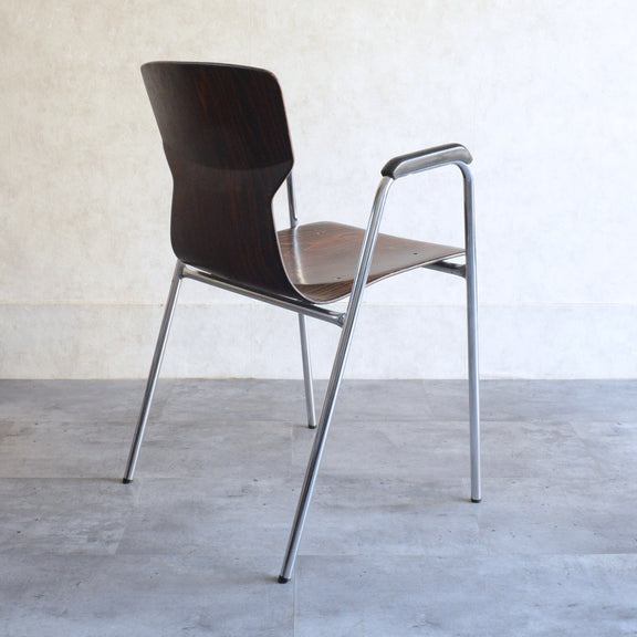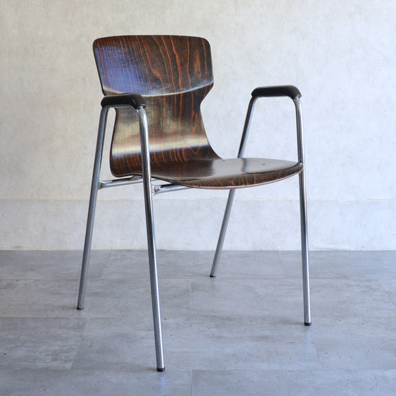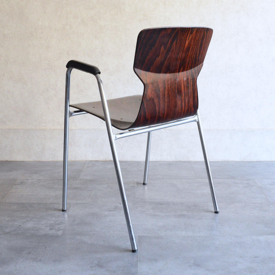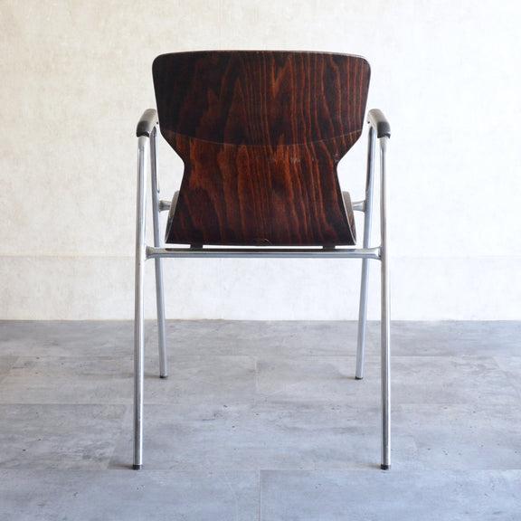 ブナ材に、フェノール樹脂を含浸させたパグウッド(ドイツ製) を使用したスタッキングチェア。アーム付タイプは流通量が少なく、希少なアイテムです。