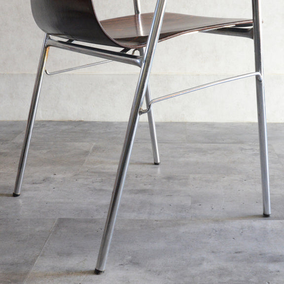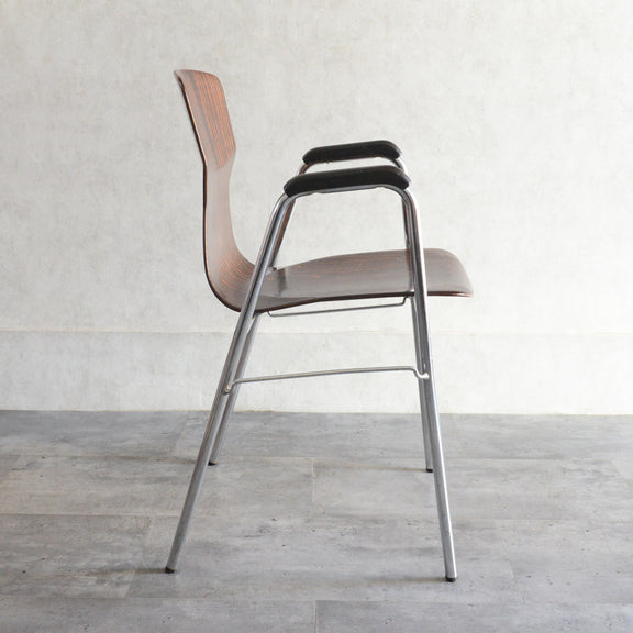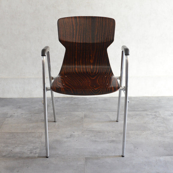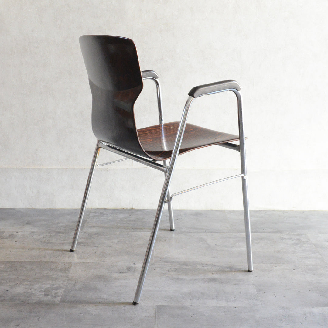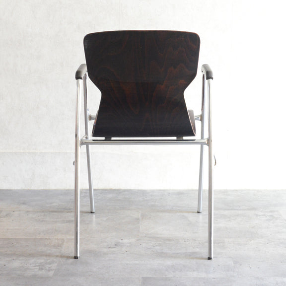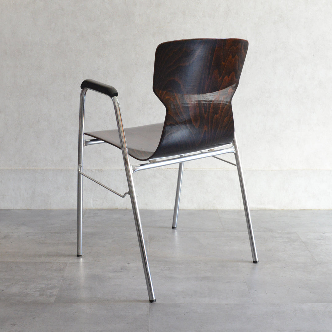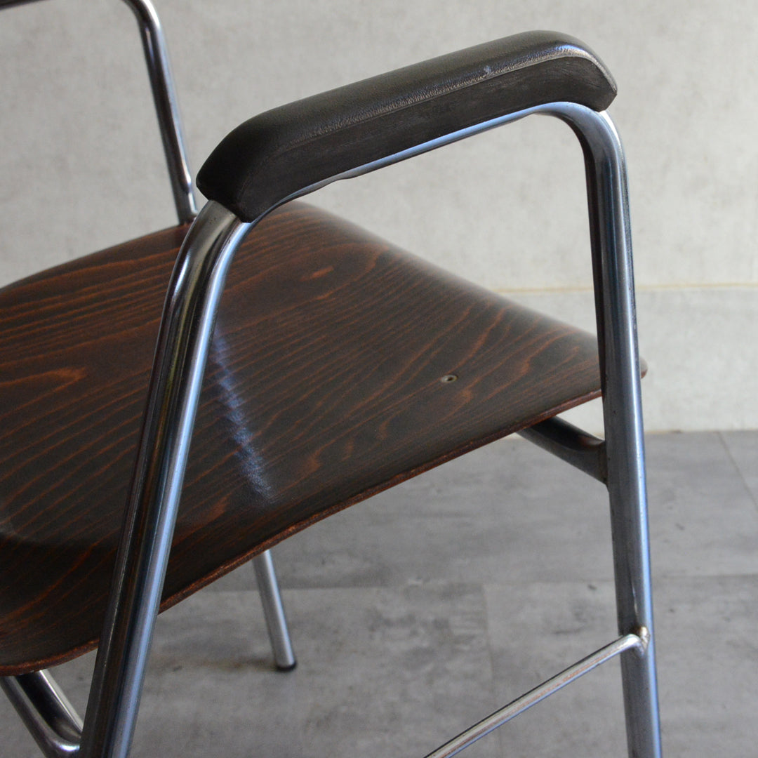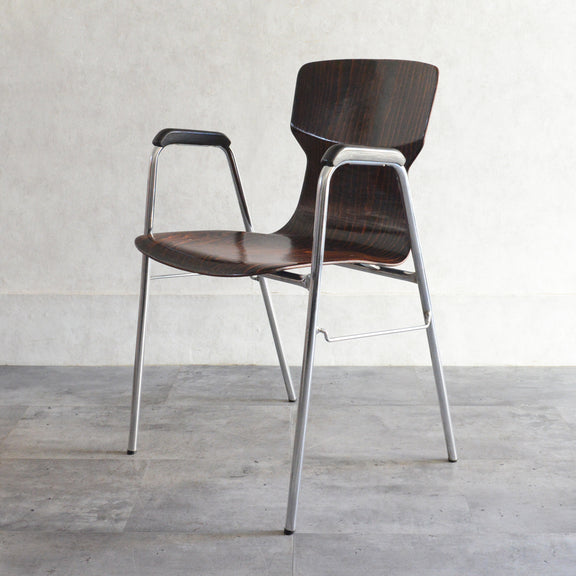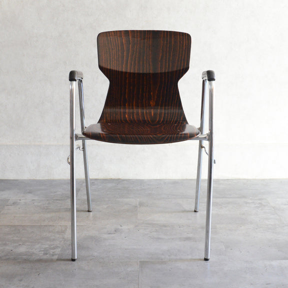 ブナ材に、フェノール樹脂を含浸させたパグウッド(ドイツ製) を使用したスタッキングチェア。アーム付タイプは流通量が少なく、希少なアイテムです。