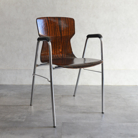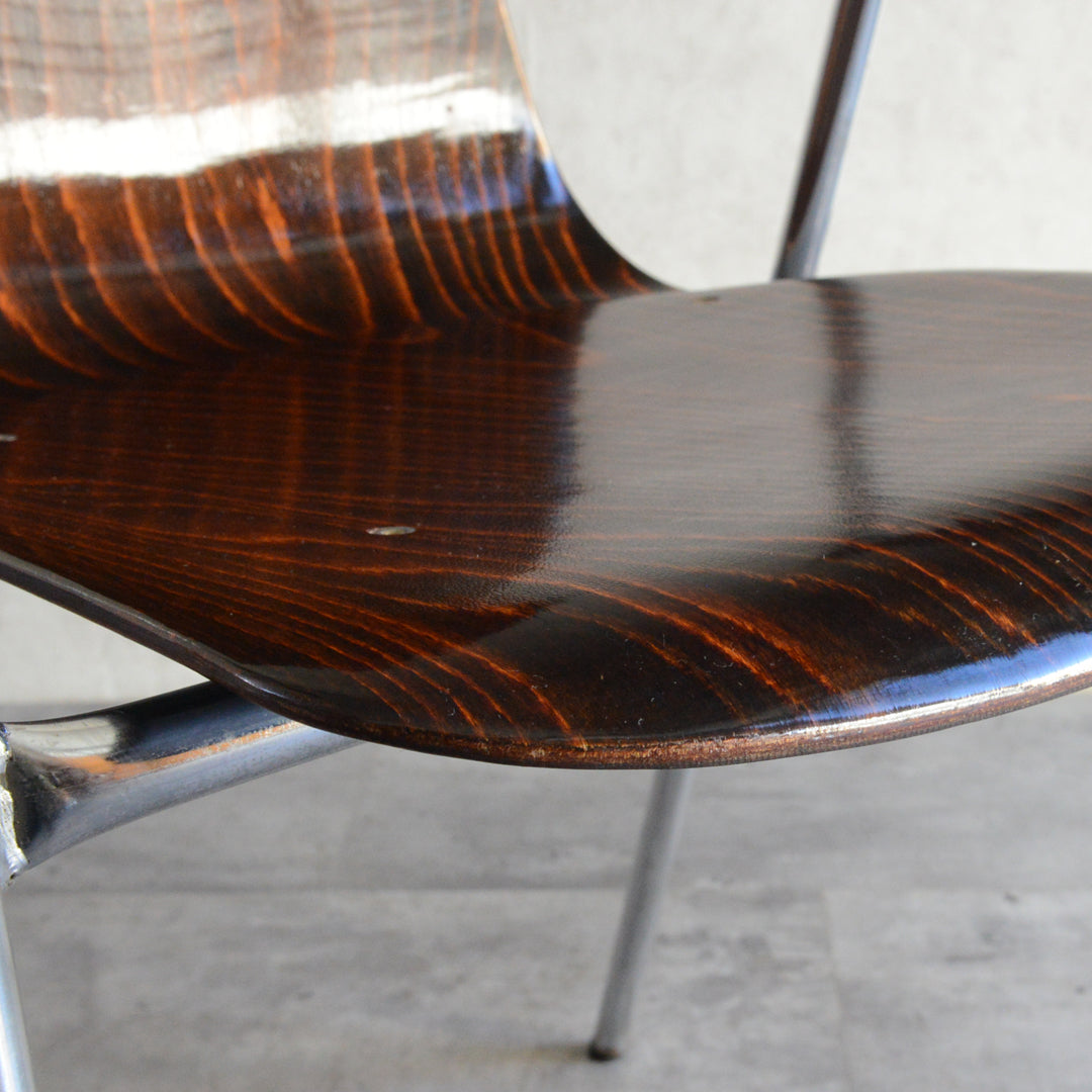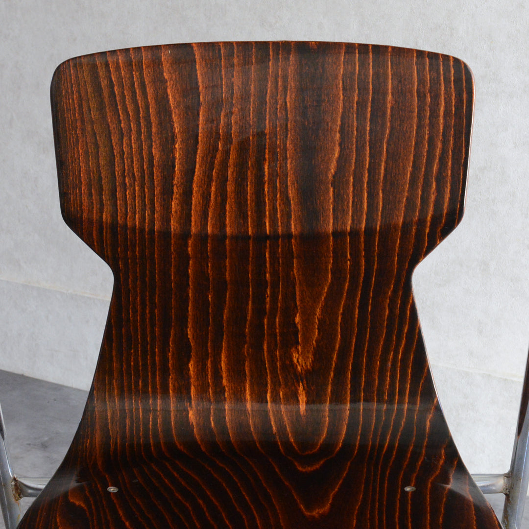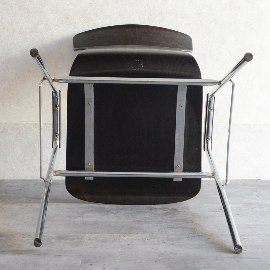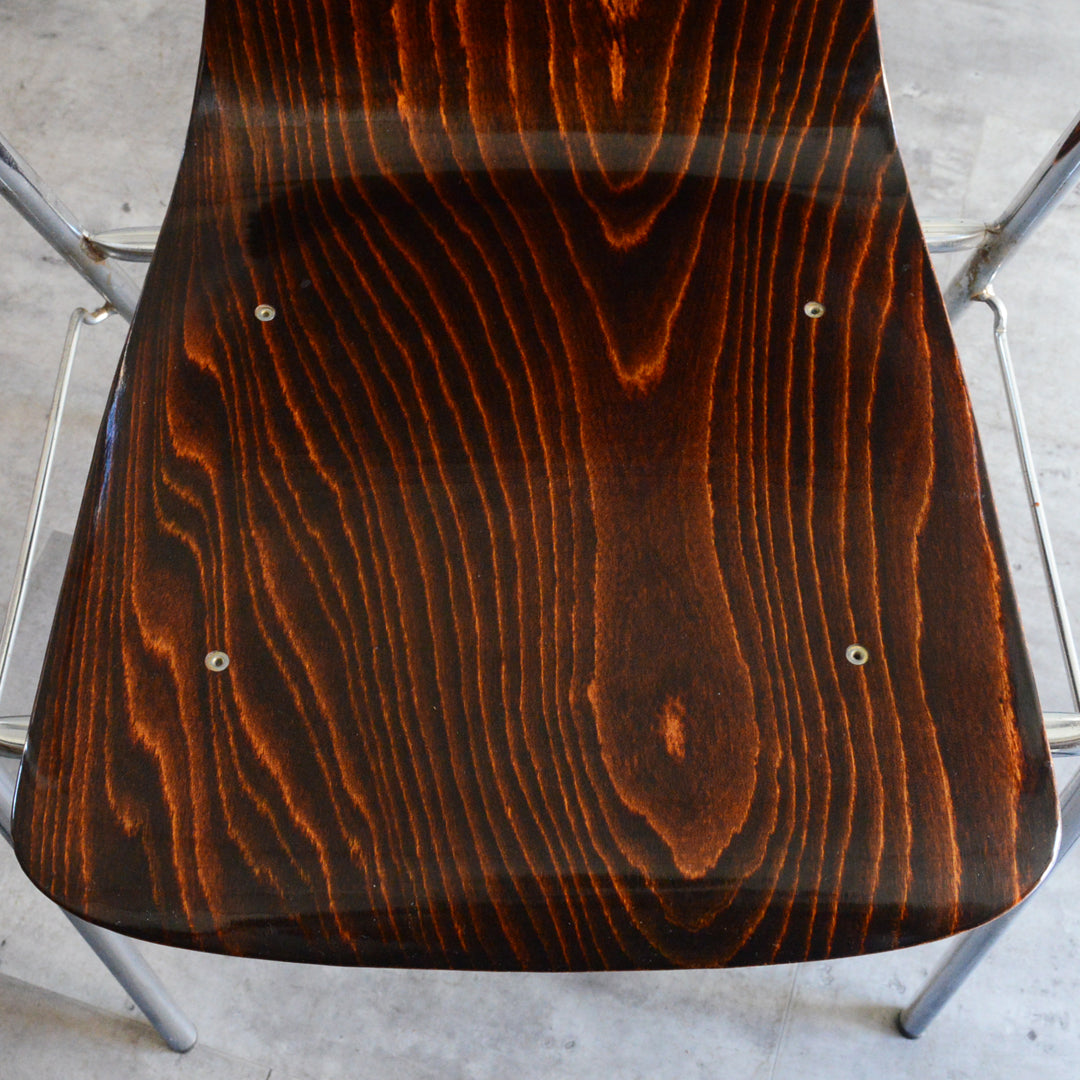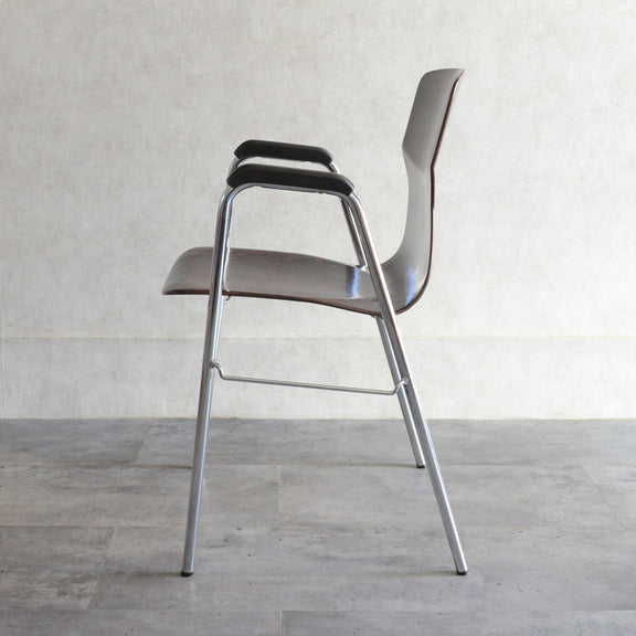 ブナ材に、フェノール樹脂を含浸させたパグウッド(ドイツ製) を使用したスタッキングチェア。アーム付タイプは流通量が少なく、希少なアイテムです。